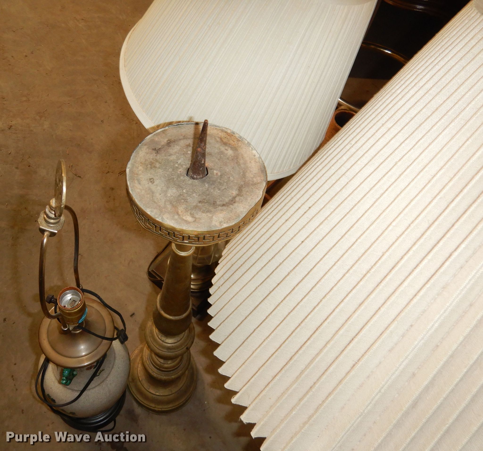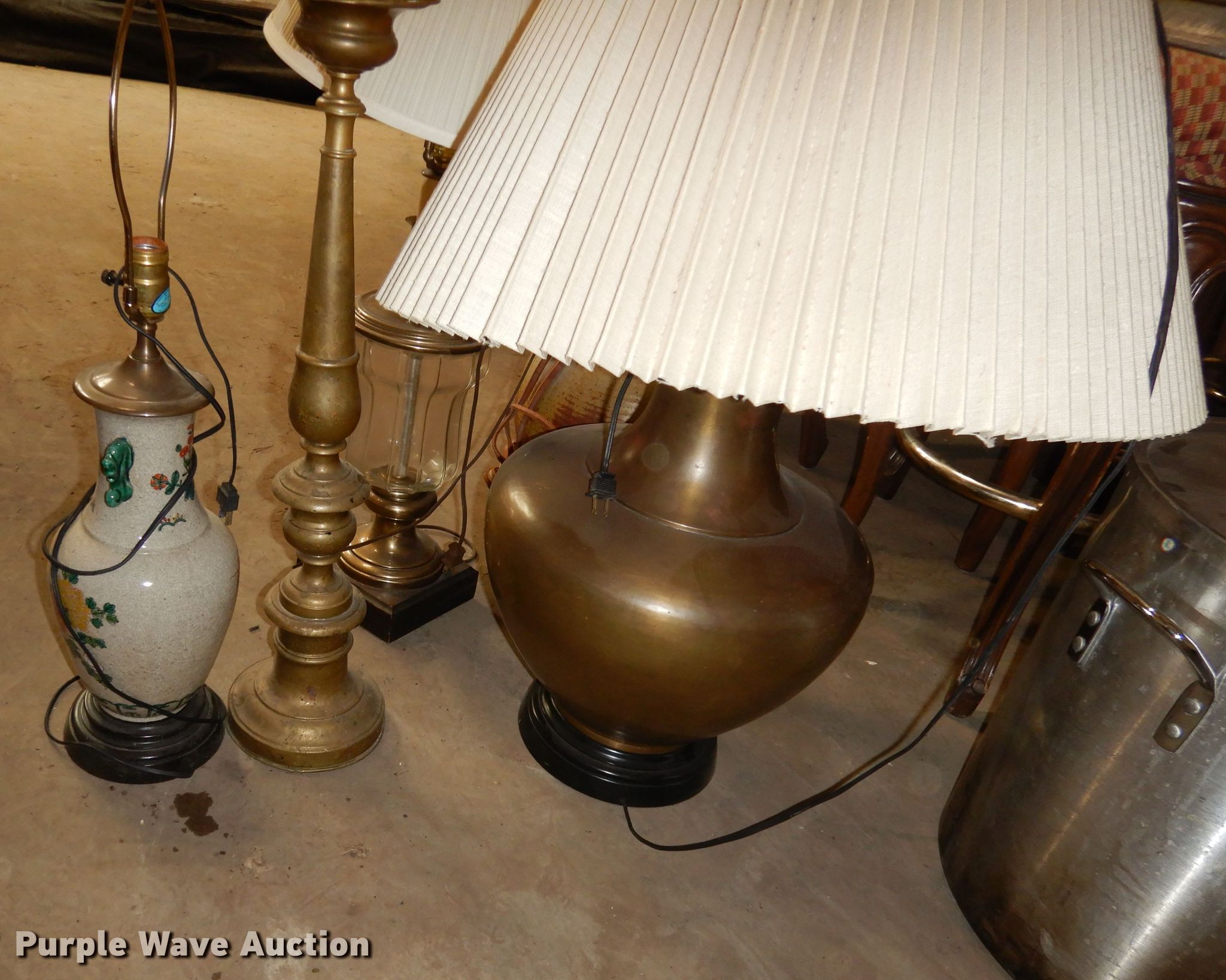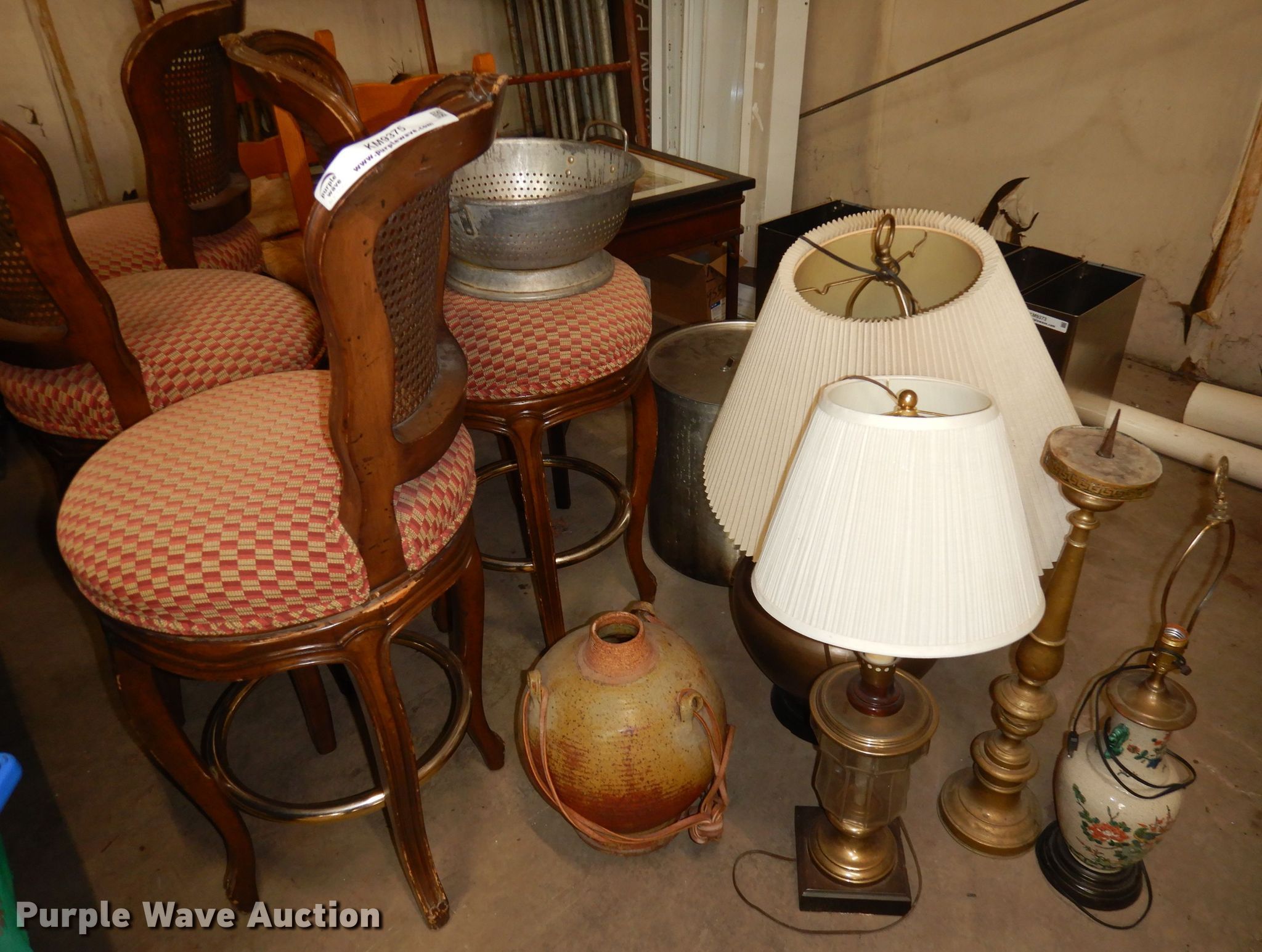 Purple Wave is selling a used Furniture in Kansas. This item is a Furniture with the following: (6) chairs, (3) lamps, Candle stand, Colendar lobster pot, Wall art, Pottery