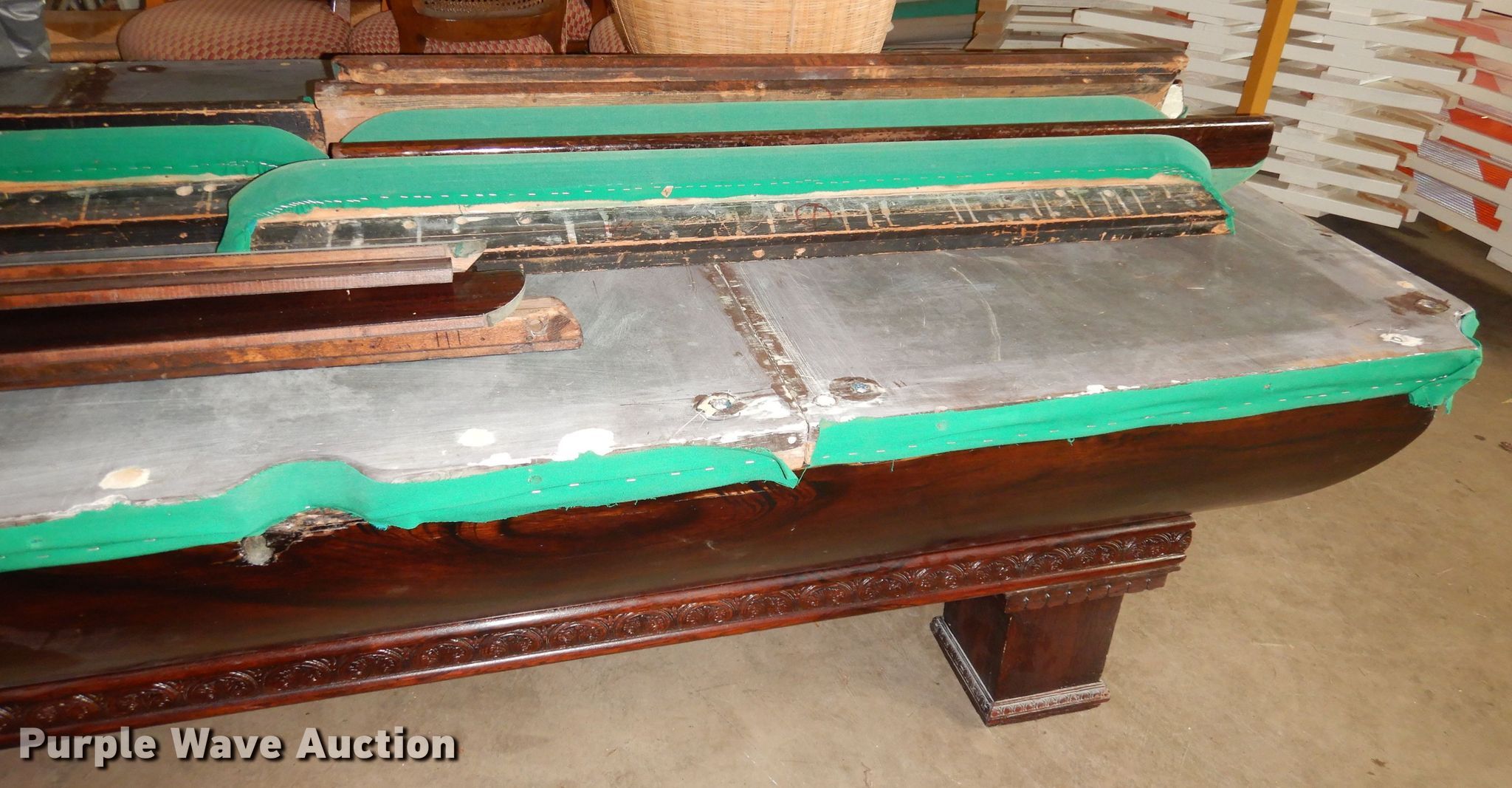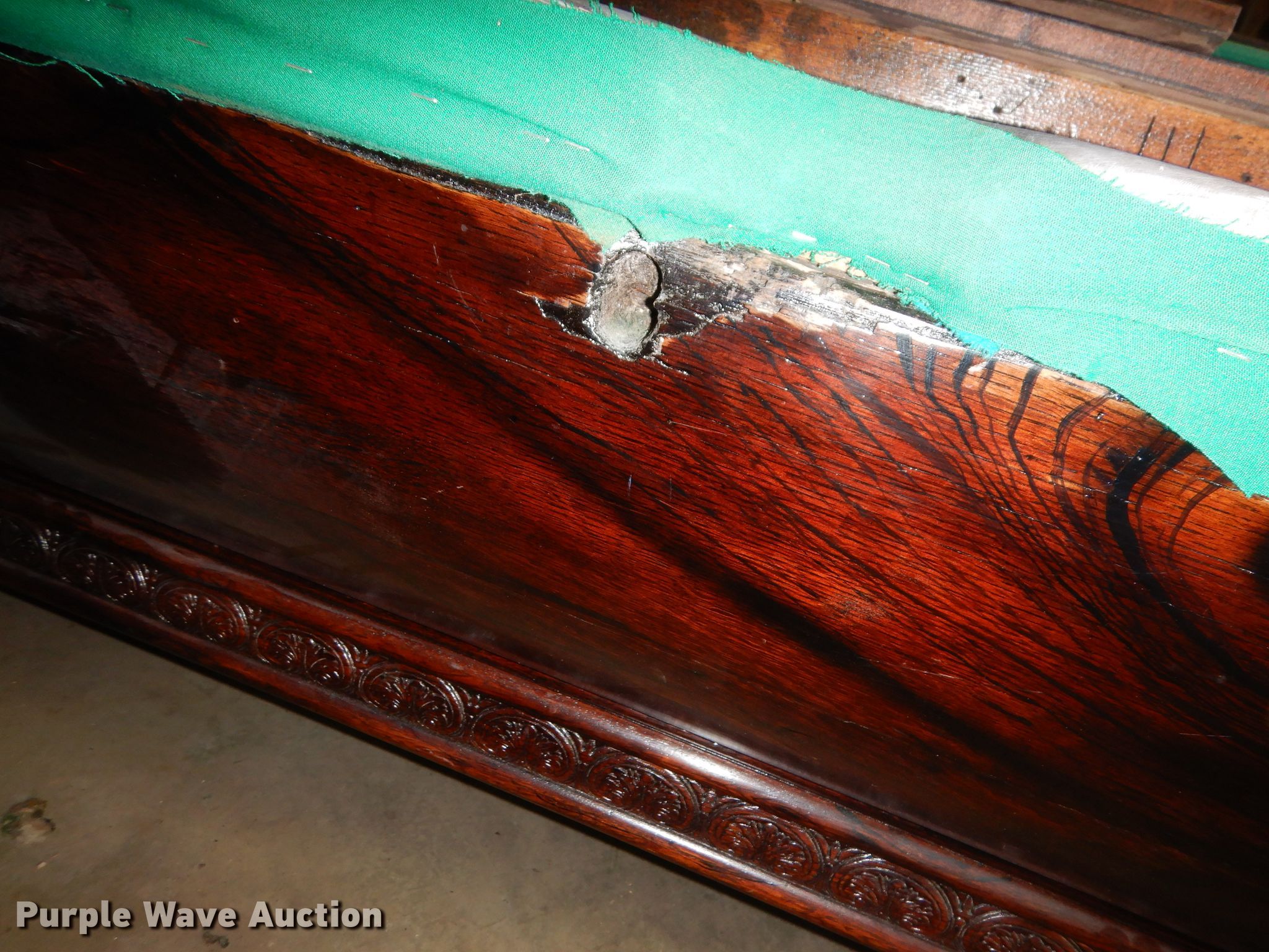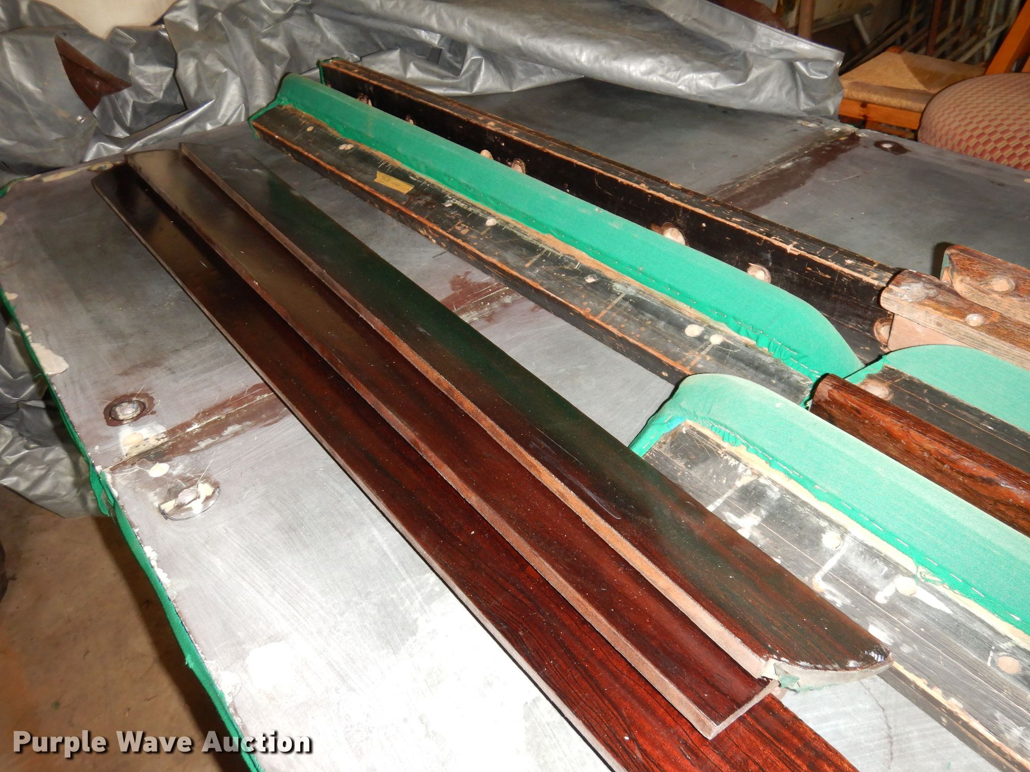 Purple Wave is selling a used Sporting Goods in Kansas. This item is a Snooker pool table with the following: 8'8"L x 54"W x 30"W, Slate top, Wood base, Unit damaged