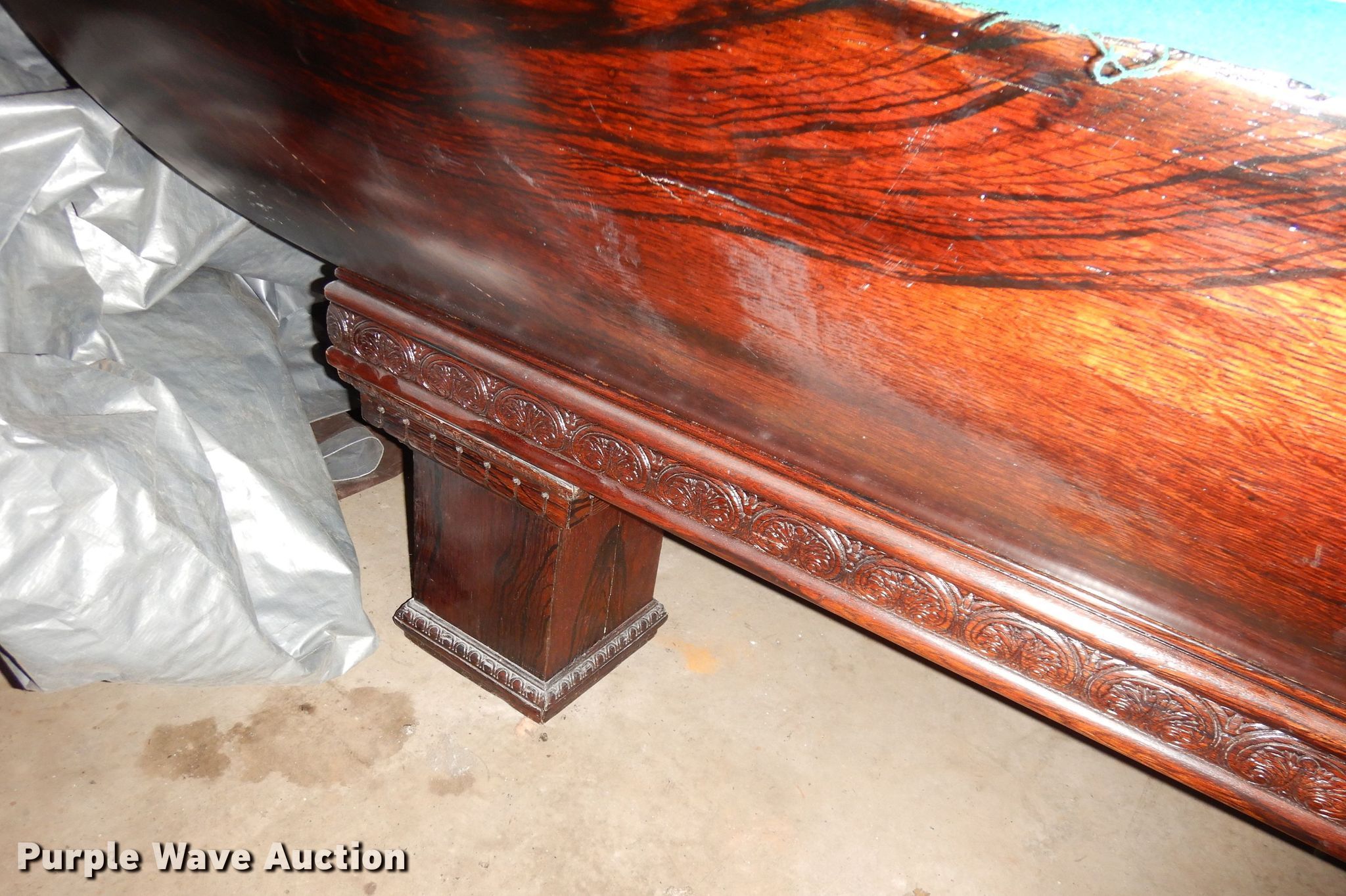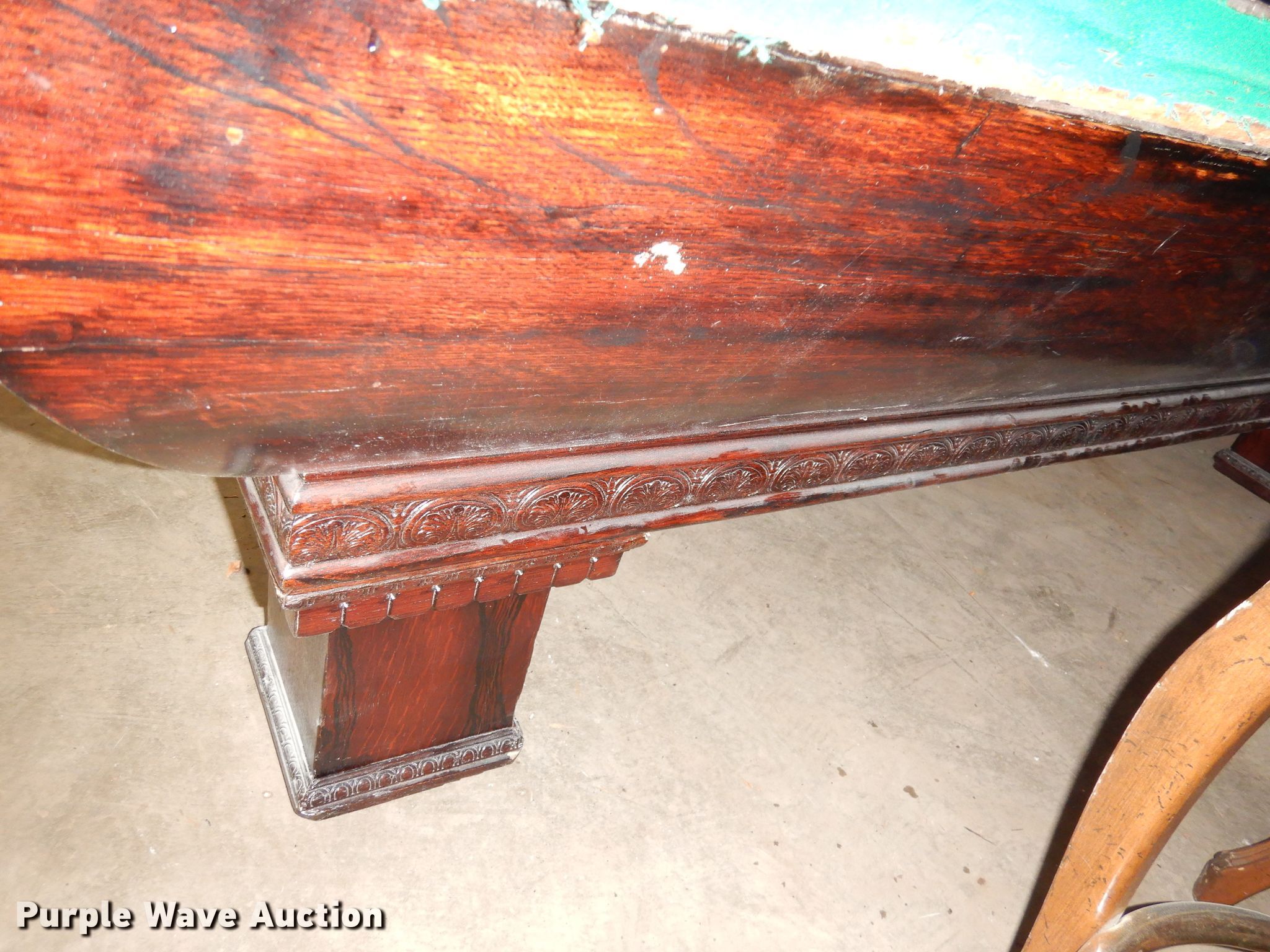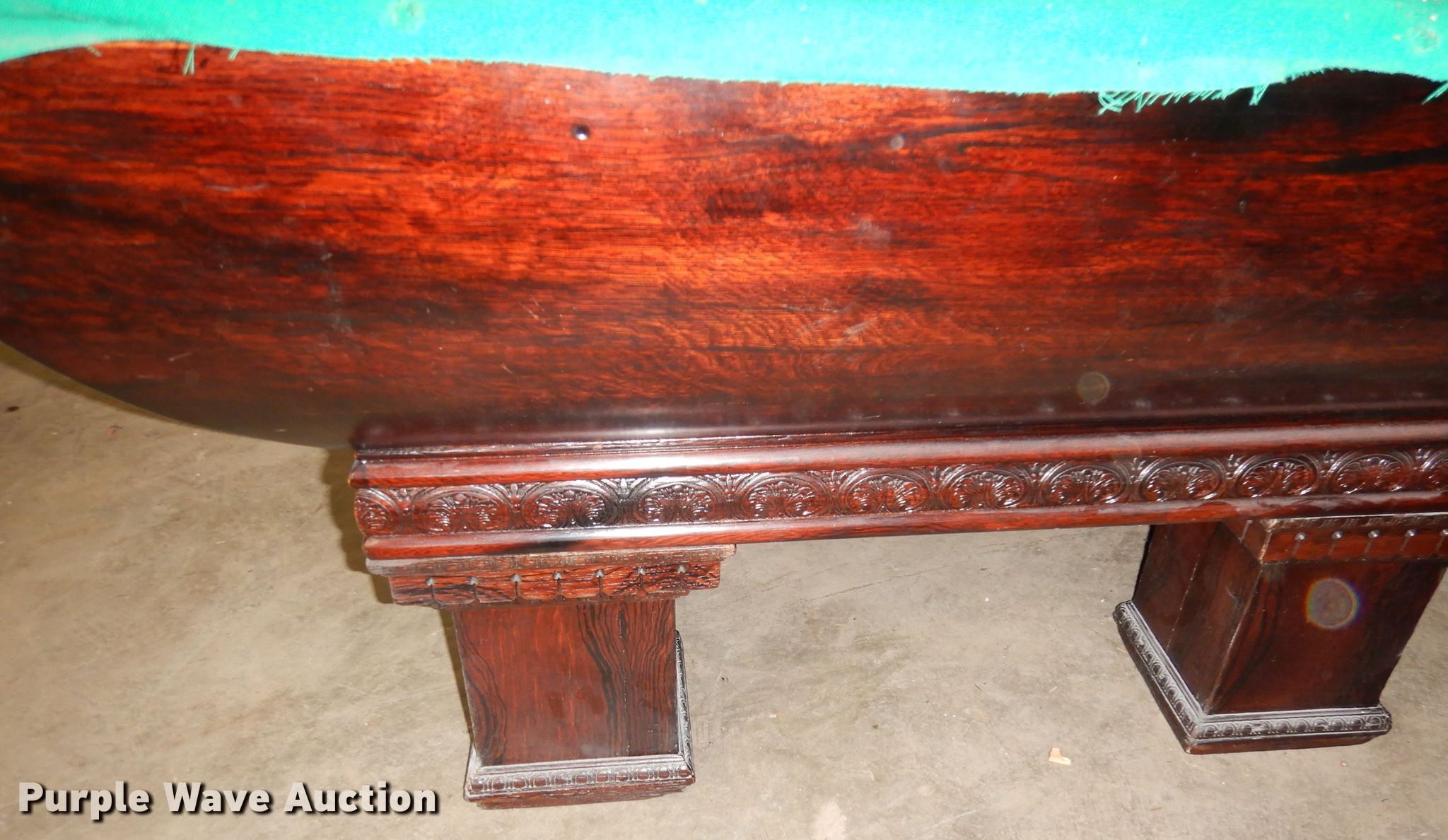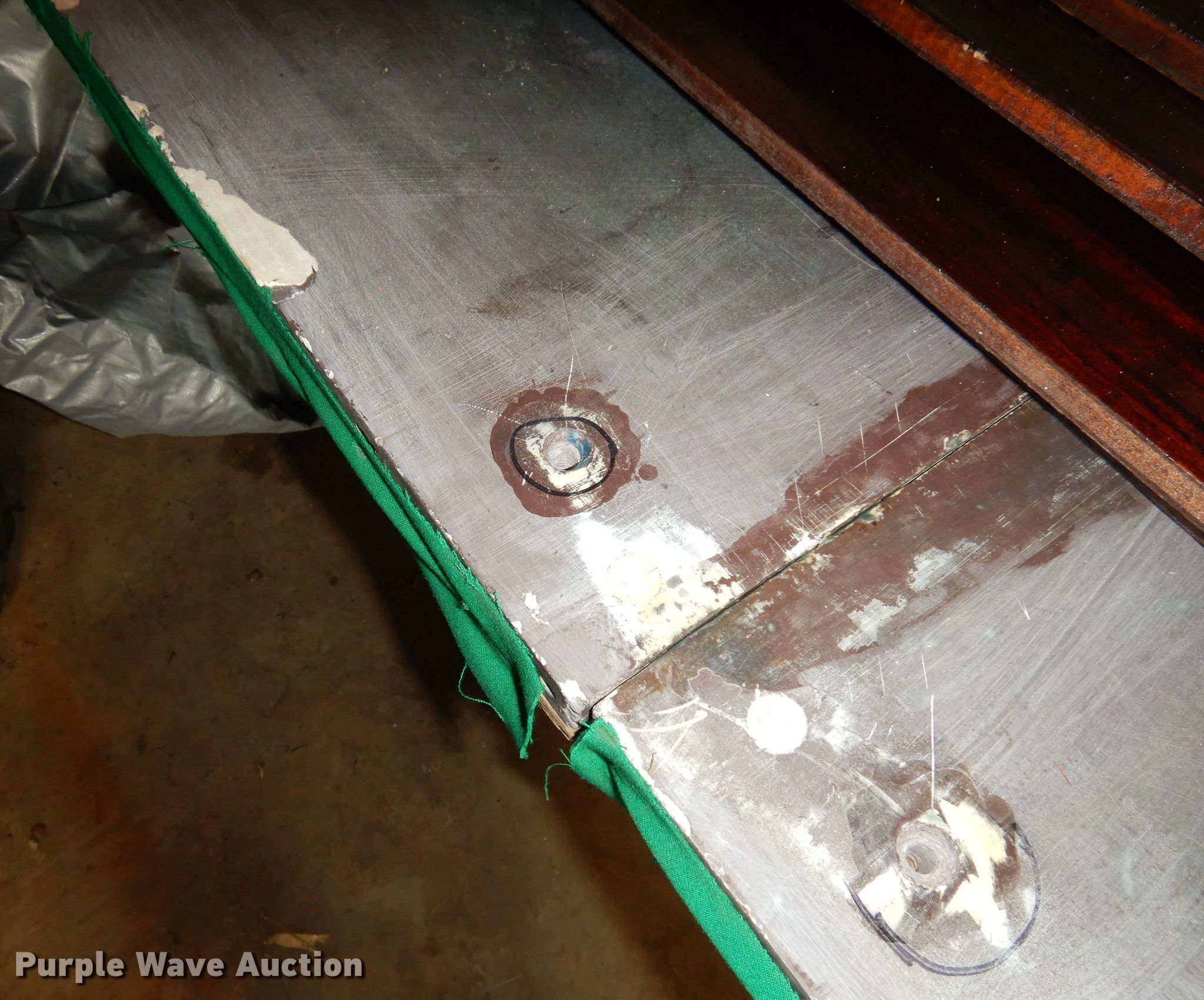 Purple Wave is selling a used Sporting Goods in Kansas. This item is a Snooker pool table with the following: 8'8"L x 54"W x 30"W, Slate top, Wood base, Unit damaged
