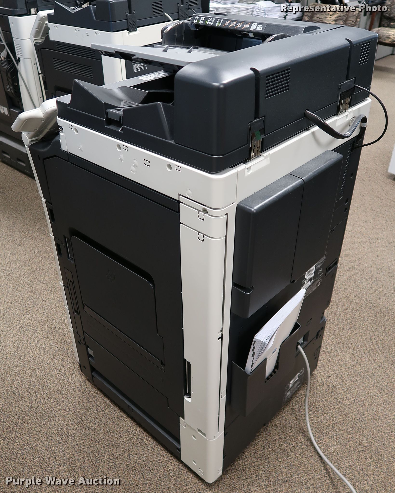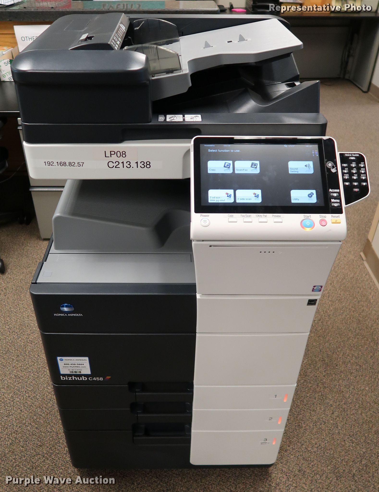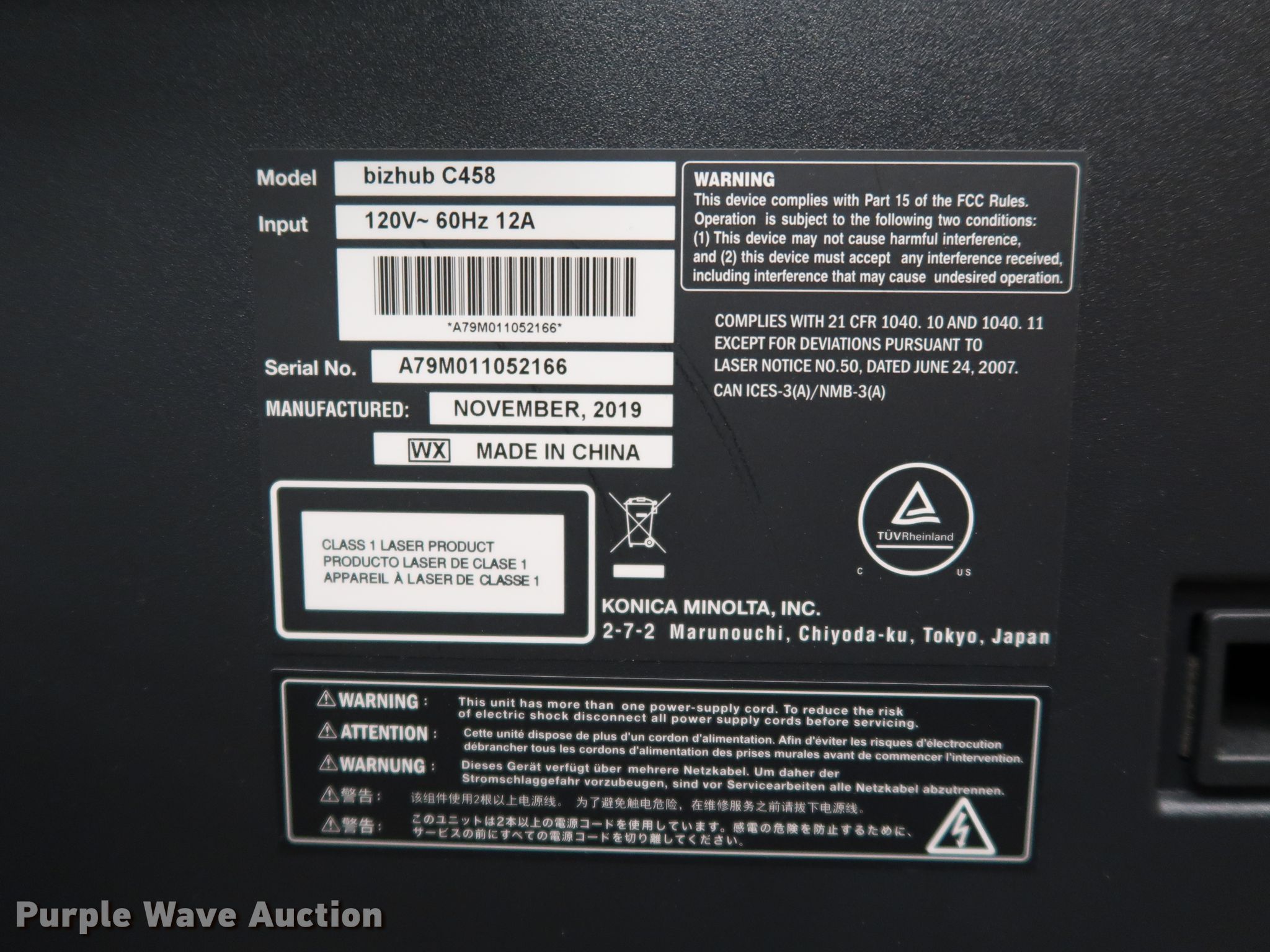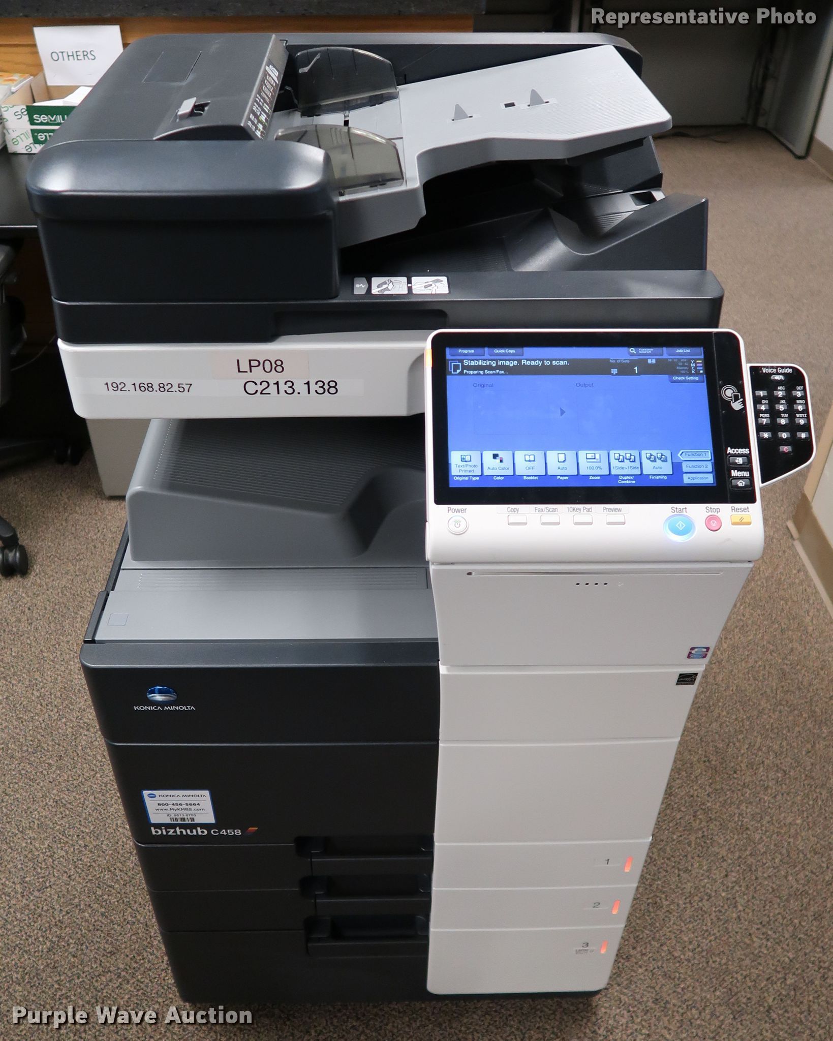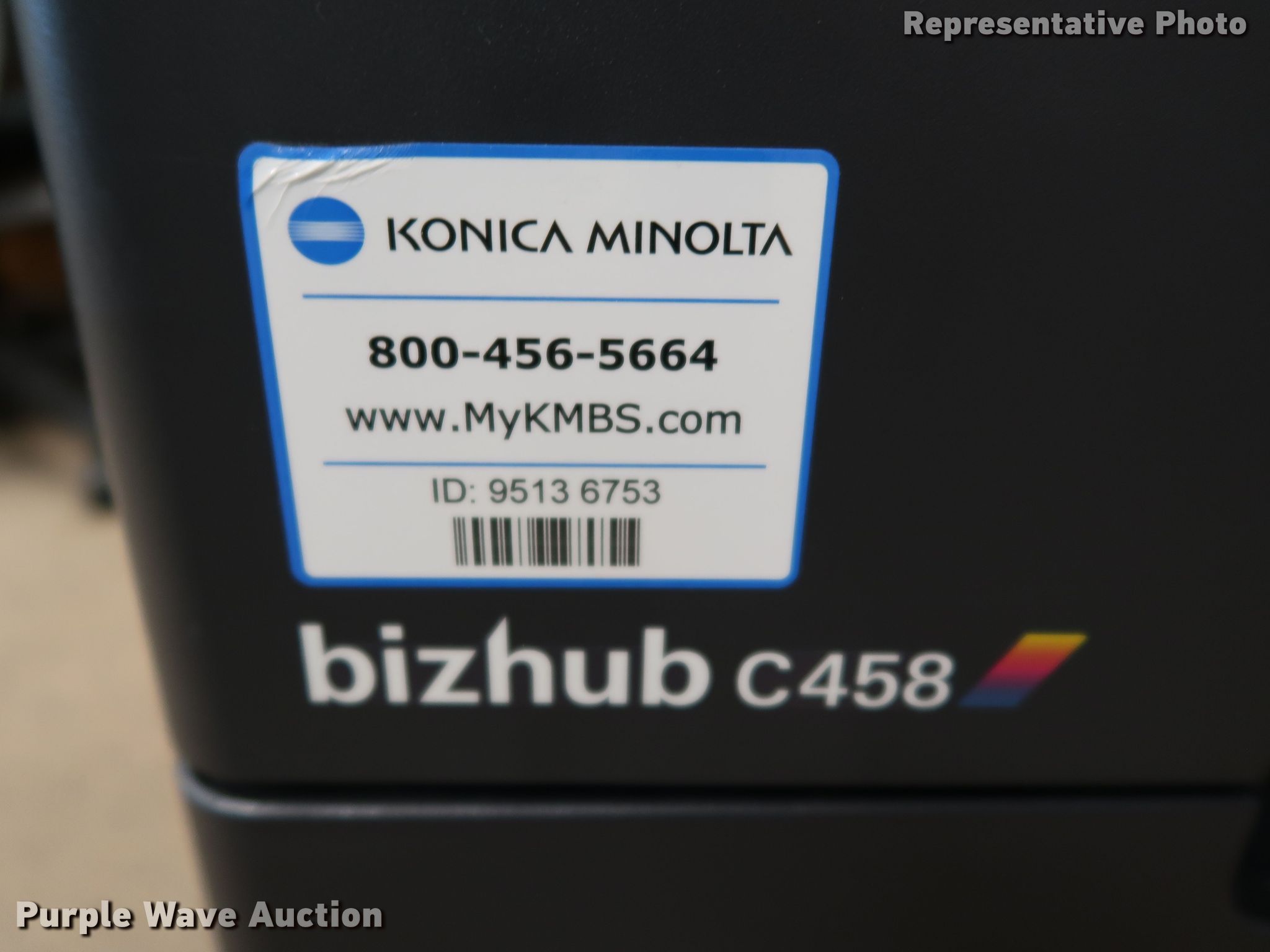 Purple Wave is selling a used Copy or Printing Machine in Oklahoma. This item is a 2019 Konica Minolta BizHub C458 multi-function copier with the following: 45 ppm print output, 240 ppm scan output, Serial: A79M011052166