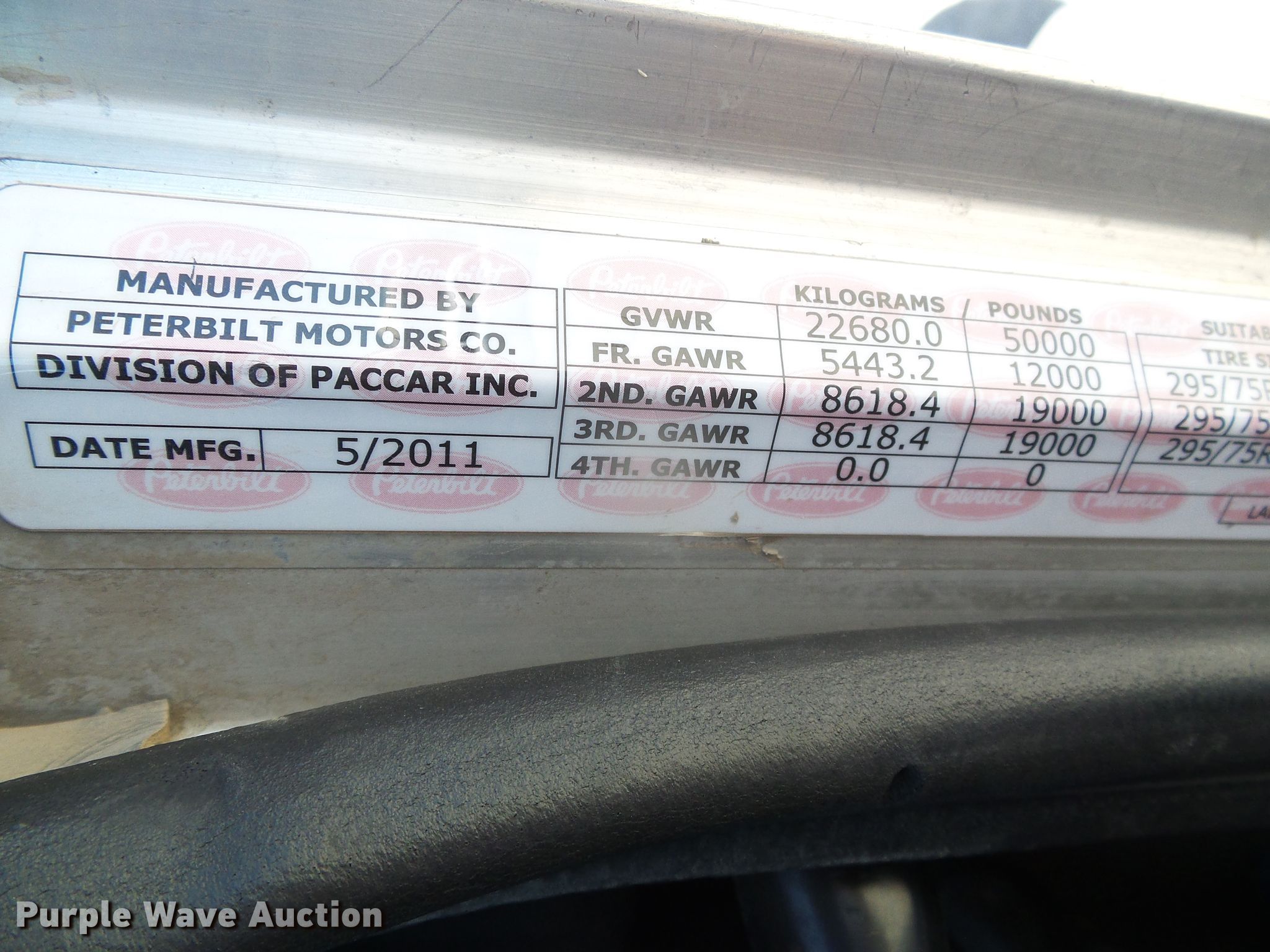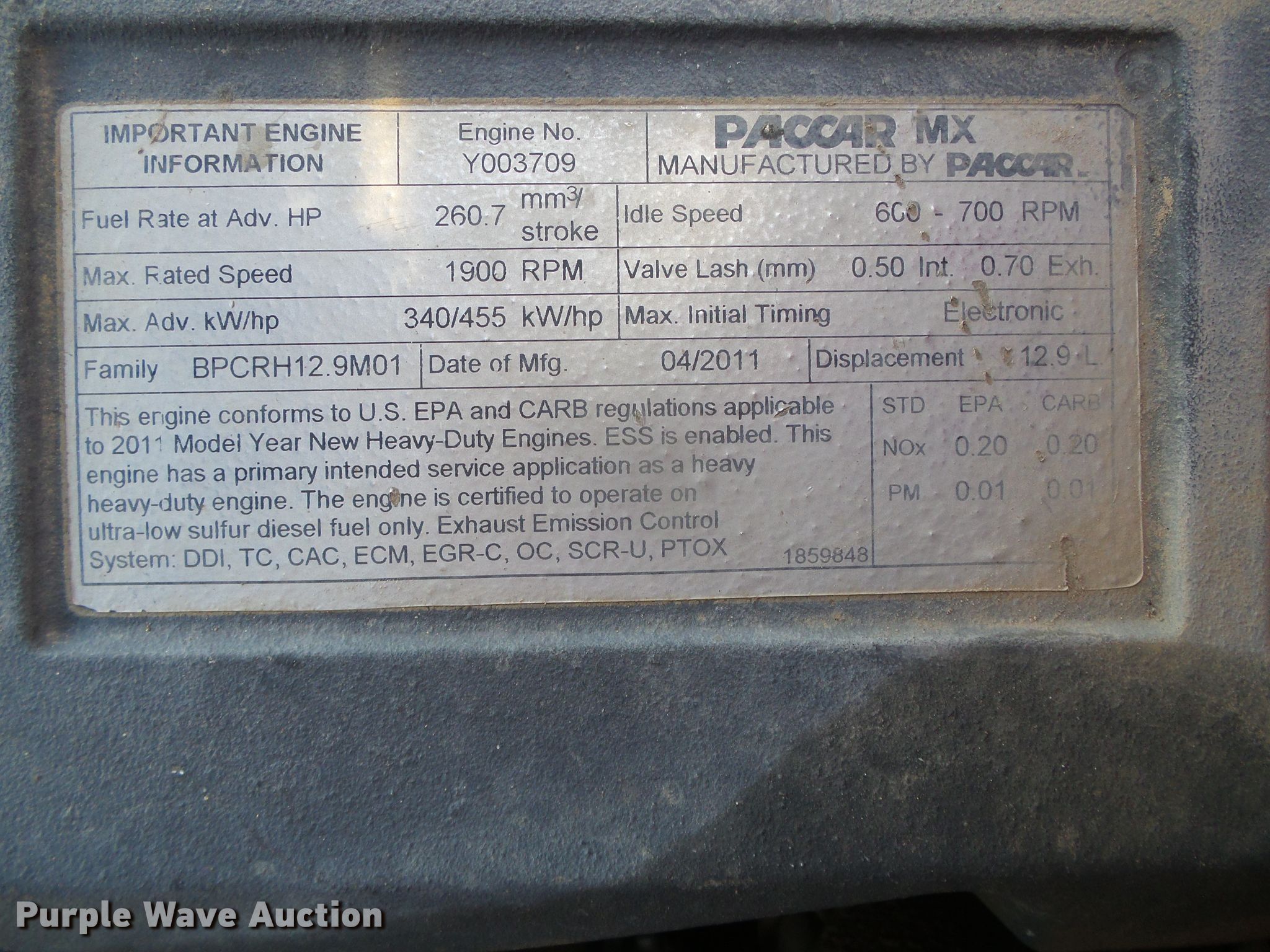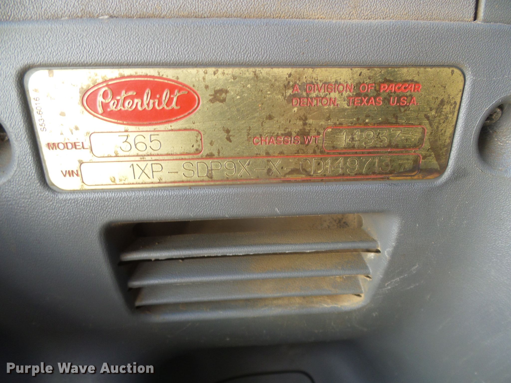 2012 Peterbilt 365 semi truck. 701,886 miles on odometer, Engine hours: 19,833. Engine Paccar, Serial: Y003709, Displacement: 12.9L, Cylinders: 6, Fuel type: Diesel. Transmission Eaton Fuller, Manual, Speed: 10. Chassis Axles: Tandem, Suspension: Air, Brakes: Air, PTO, Wet kit, GVWR: 50,000 lbs FAWR: 12,000 lbs, IAWR: 19,000 lbs, RAWR: 19,000 lbs. Interior AC, Heat, Power windows, Power locks, Cruise control, Air ride cab. Operational Deck plate: Aluminum, Fifth wheel type: Fixed, Fuel tank: Dual. Tires Front: 295/75R22.5, Rear: 445/50R22.5. Notes Windshield chipped or cracked, EGR and DEF deleted. Kansas title. 1XPSDP9XXCD149713. Stoppel Dirt, Inc.. 910 Edelle Ave. Sublette, KS 67877