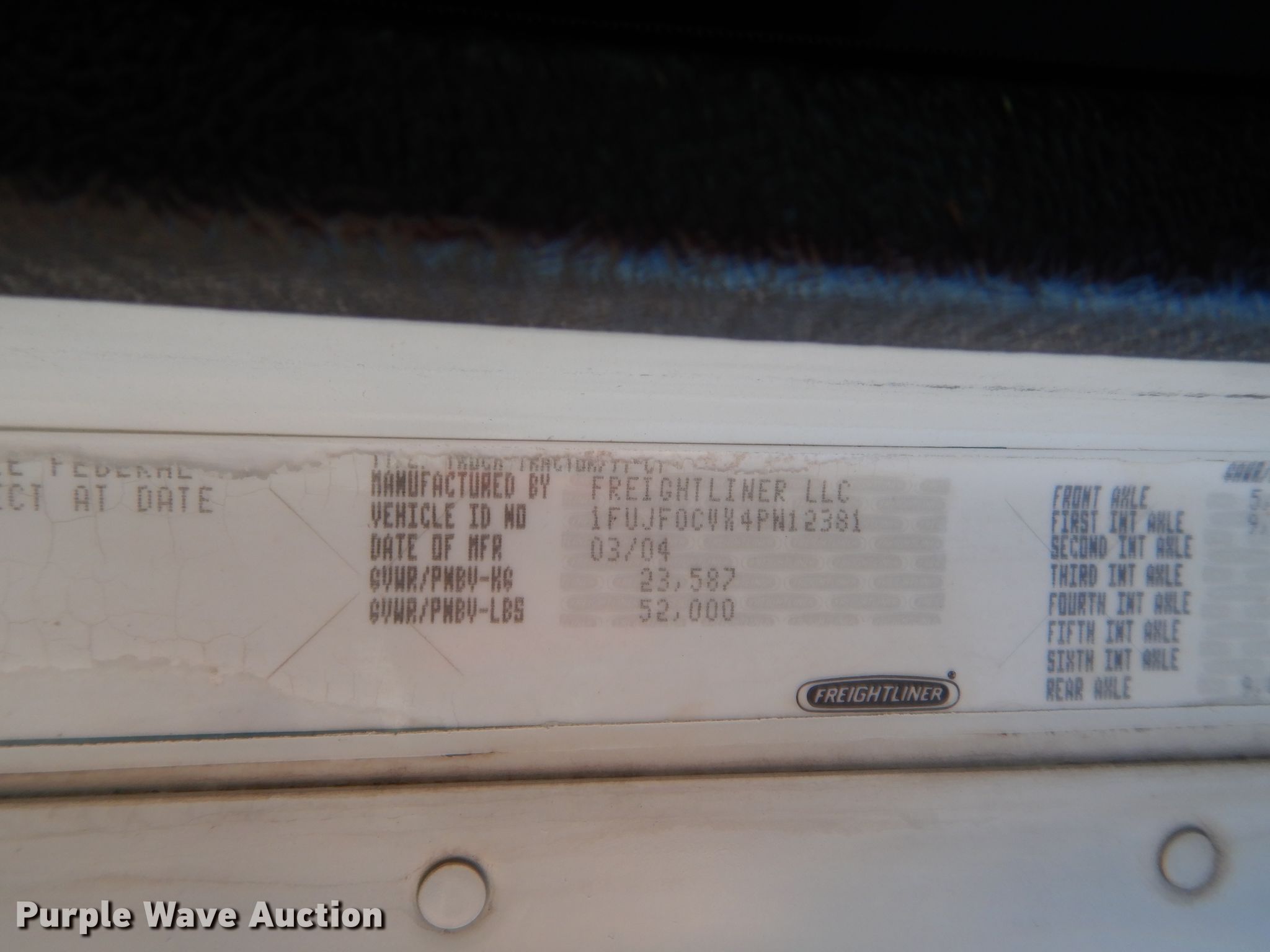 2004 Freightliner Columbia semi truck. 523,738 miles on odometer, Engine hours: 12,870. Engine Displacement: 12.8L, Cylinders: 6, Fuel type: Diesel. Transmission Manual, Speed: 10. Chassis Axles: Tandem, Differential lock: Inter-axle, Suspension: Air, Dump valves, Brakes: Air, PTO, GVWR: 52,000 lbs. Interior AC, Heat, Power windows, Cruise control. Operational Fifth wheel type: Fixed, Fuel tank: Single. View repairs. Oklahoma title. 1FUJF0CVX4PN12381. Oklahoma Environmental Services. Oklahoma City, OK 73156
