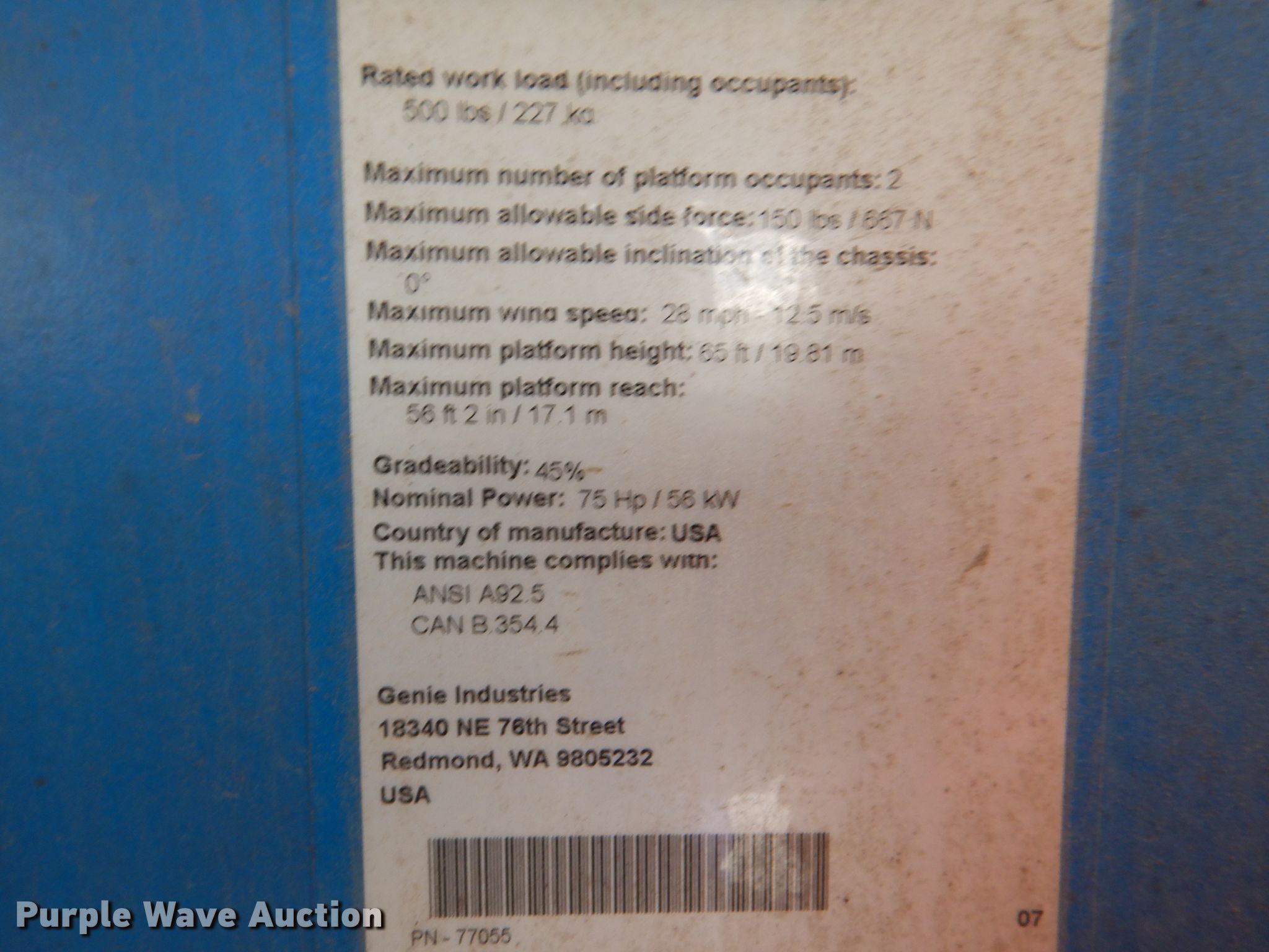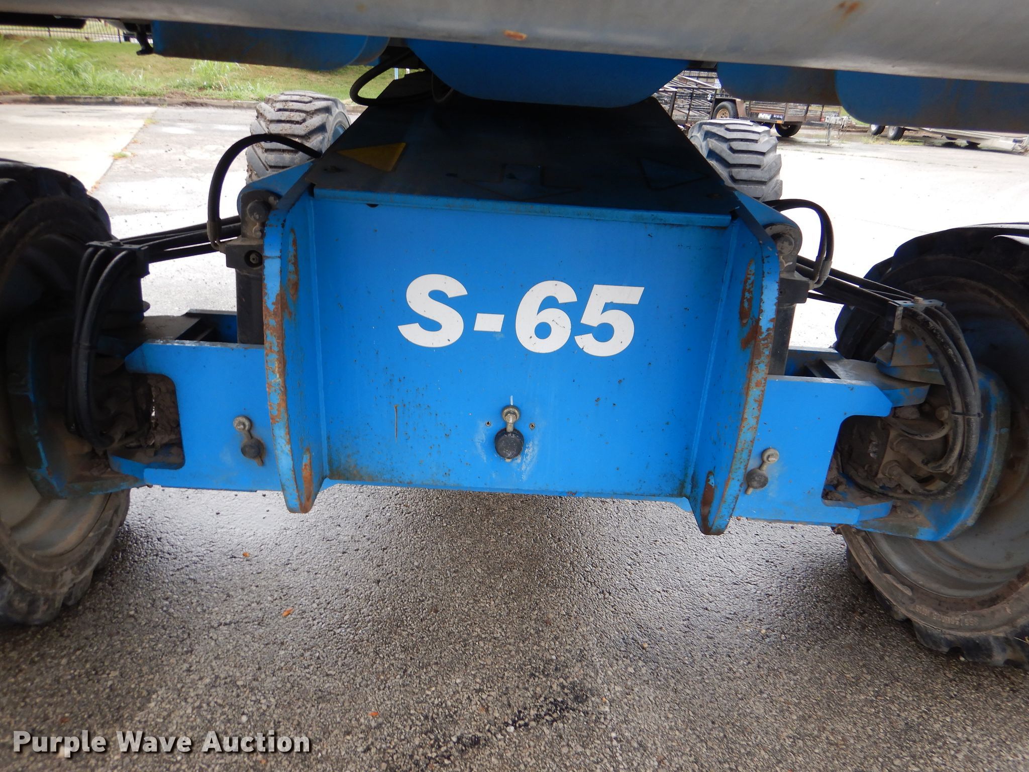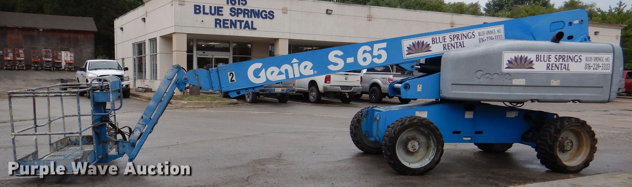 Purple Wave is selling a used Boom Lift in Missouri. This item is a 2008 Genie S65 boom lift with the following: 3,106 hours on meter, Serial: S6008-17538
