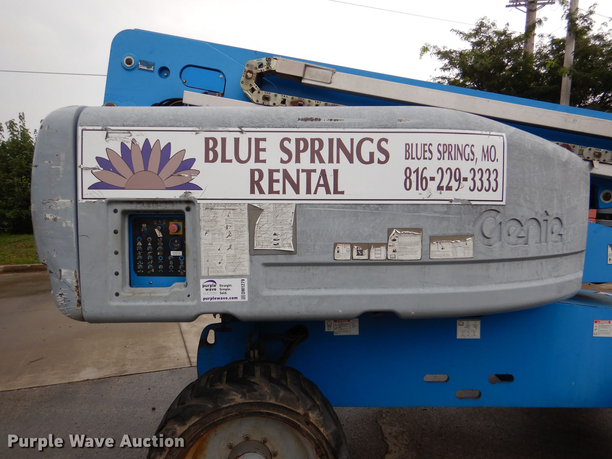 2008 Genie S65 boom lift. 3,106 hours on meter, Serial: S6008-17538. Engine Displacement: 2.3L, Cylinders: 4, Fuel type: Dual fuel, HP: 75. Chassis Four wheel drive. Operational Maximum lift capacity: 500 lbs, Maximum reach length: 56' 2", Maximum lift height: 65', Platform: 96" L x 36" W, AC power outlet, Controls: Platform, Ground, Platform rotation: Hydraulic, Safety alarm. Tires Tire size: 355/55D625. Blue Springs Rental. 1615 SW US 40 Hwy. Blue Springs, MO 64015