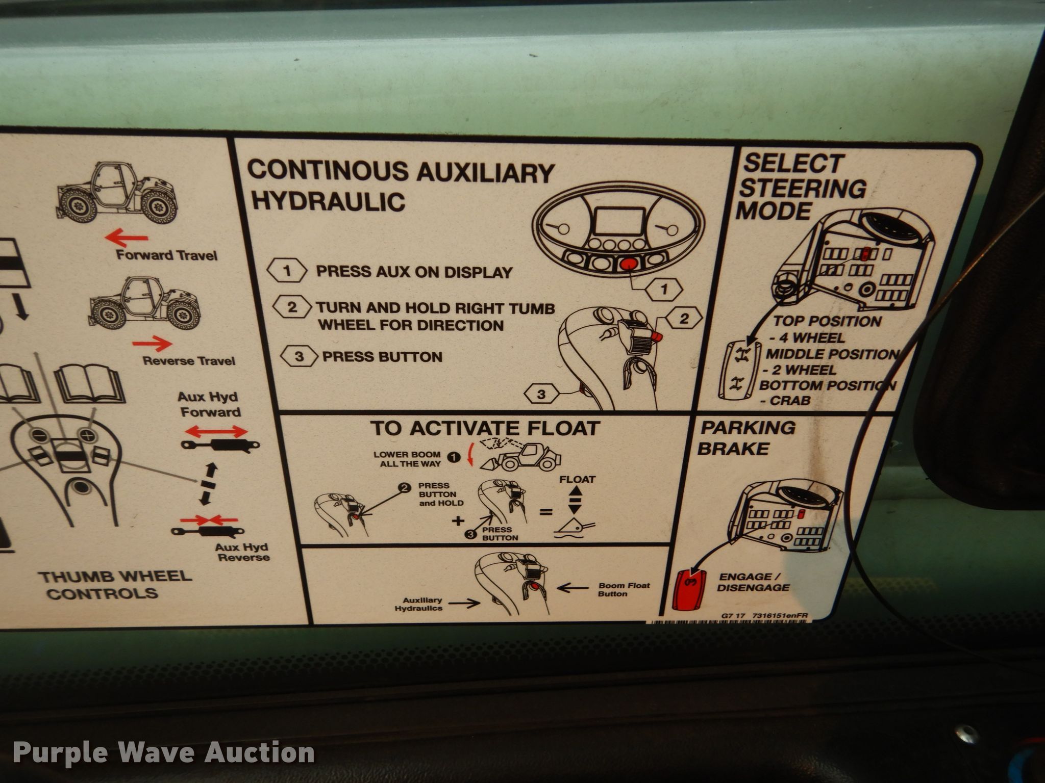 2018 Bobcat V519 telehandler. 709 hours on meter, Hours may vary, unit still in use, Serial: B3YH12004. Engine Bobcat, Cylinders: 4, Fuel type: Diesel. Transmission Hydrostatic, Two speed travel, Four wheel drive. Operators station Enclosed cab, AC, Steering: Crab, Four wheel. Operational Maximum lift capacity: 5,500 lbs, Maximum lift height: 19', Boom stages: 2, Fork length: 48", Auxiliary hydraulics, Auxiliary electrical outlet, Quick attach: Manual, Bucket size: 83". Tires Size: 405/70-20. Tinuum Services, LLC. Stanton, ND 58571