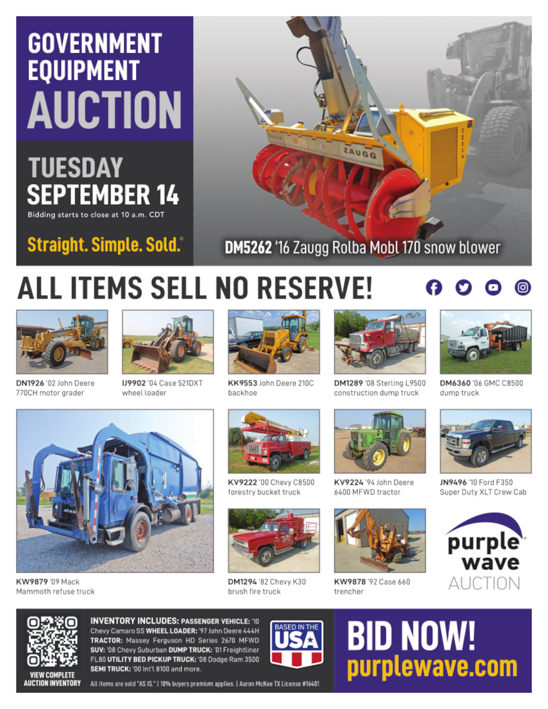 This auction is conducted by Purple Wave, Inc., whose home office is 825 Levee Drive, Manhattan, Kansas. Aaron McKee, Texas auctioneer license # 16401, operates Purple Wave, Inc. Complaints against us may be directed to the Texas Department of Licensing and Regulation, P.O. Box 12157, Austin, Texas 78711, (512) 463-6599. For additional required information, see the attached document.