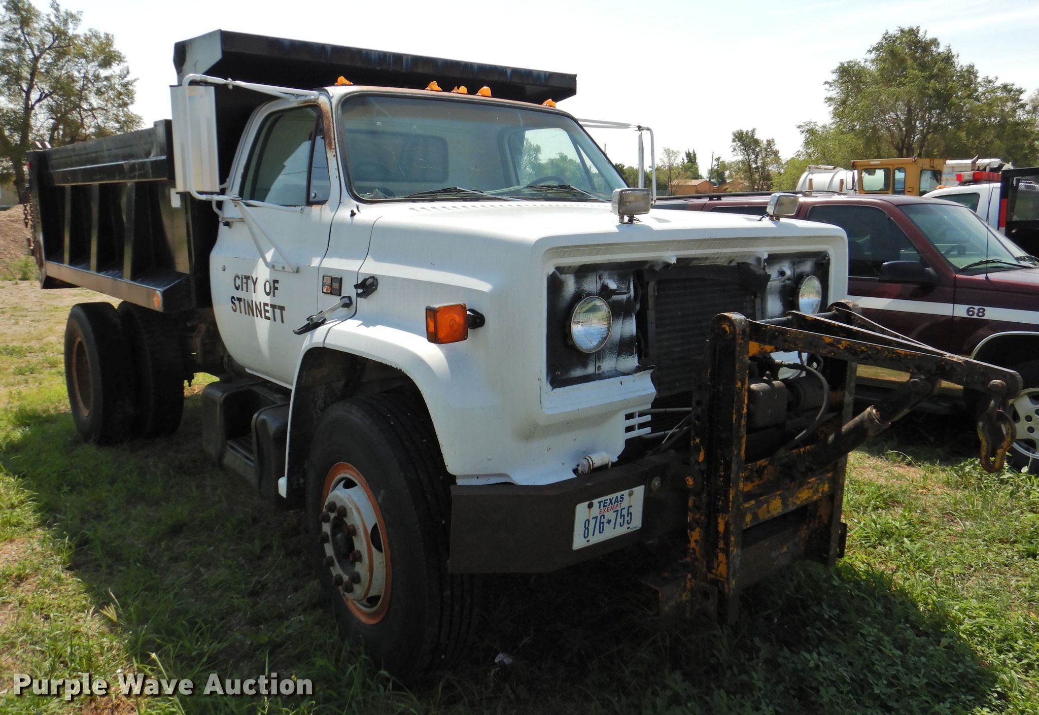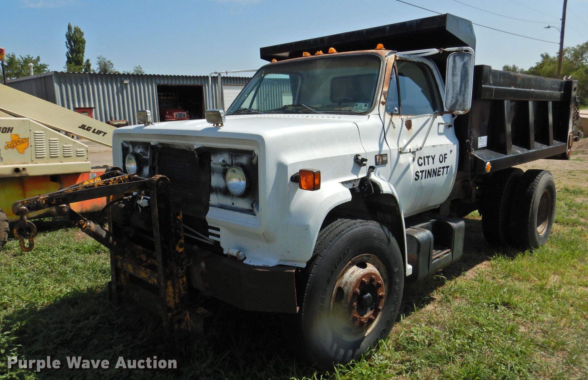 1985 GMC 7000 dump truck. 65,614 miles on odometer. Engine Displacement: 7.0L, Cylinders: 8, Fuel type: Gas. Transmission Manual, Speed: 5, plus 2. Chassis Axles: Single, Suspension: Spring, Brakes: Air, PTO. Interior Heat. Operational Dump bed Galion 402F, 10' L x 8' W, Side height: 30.5", Side board height: 6", Bed type: Steel, Ram: Dual, End gate: Manual. Tires Size: 10.00R20. Notes Unknown operating condition. Texas title. 1GDM7D1E4FV509532. City of Stinnett. 806 S Morse Ave. Stinnett, TX 79083