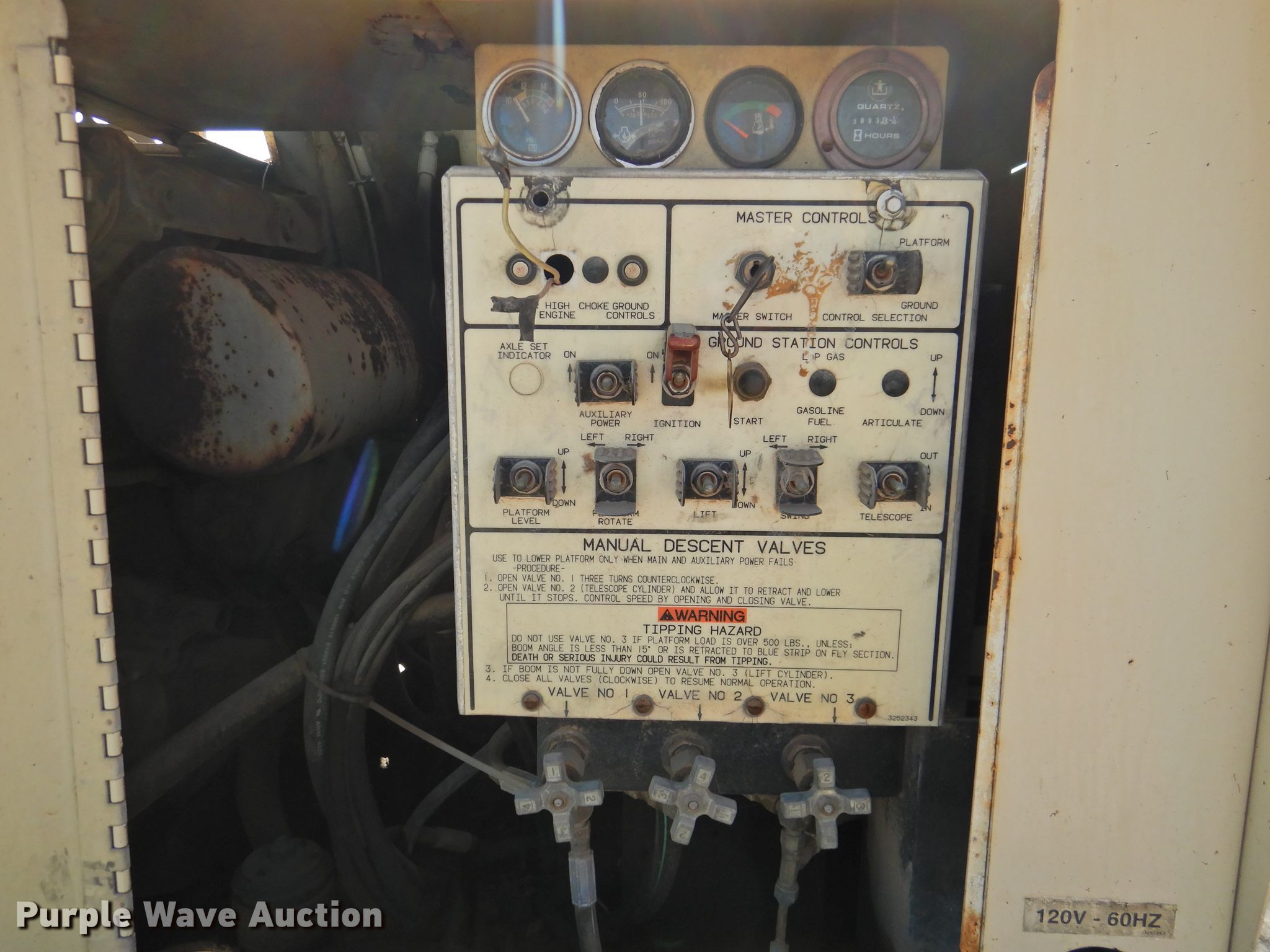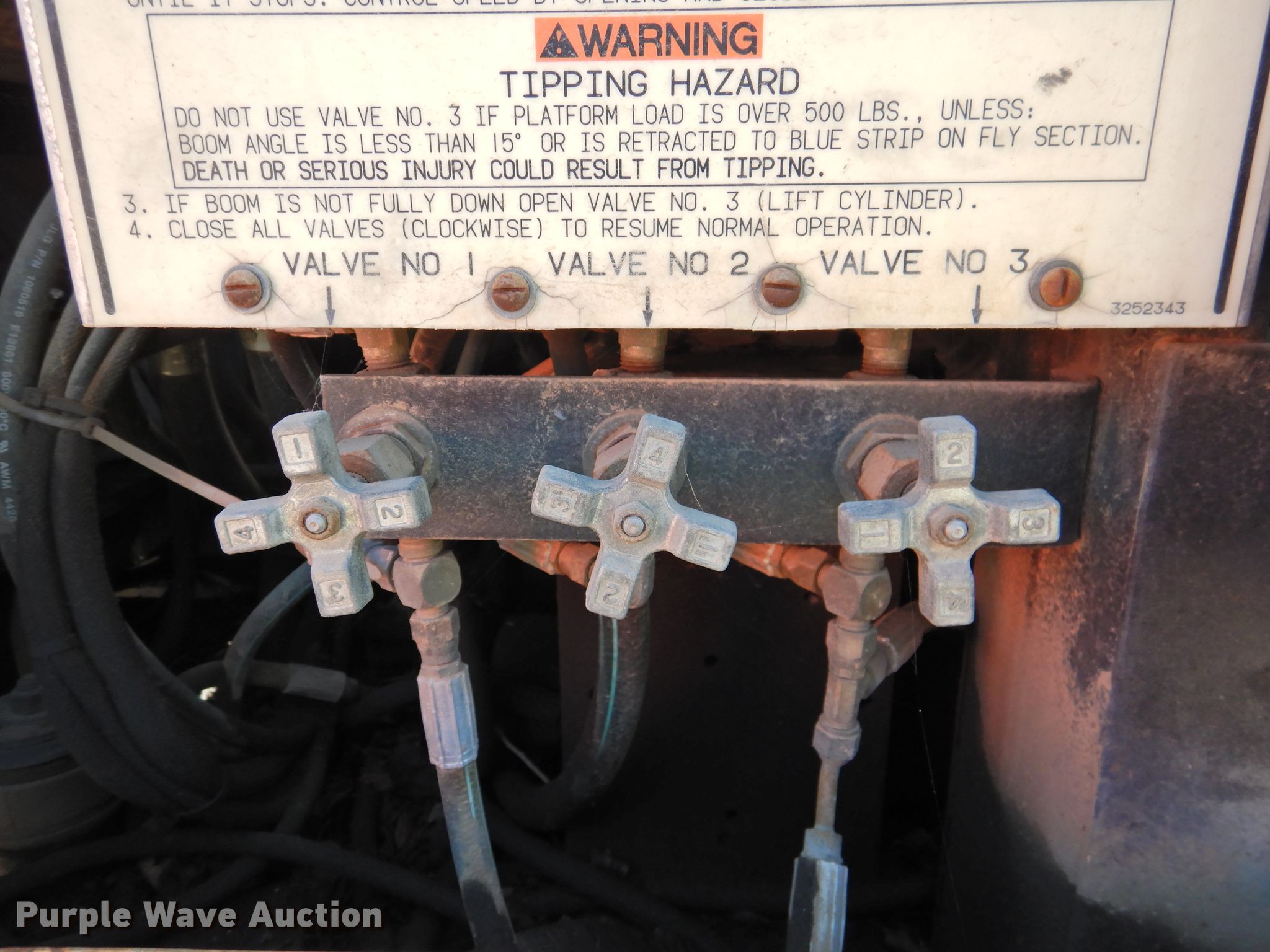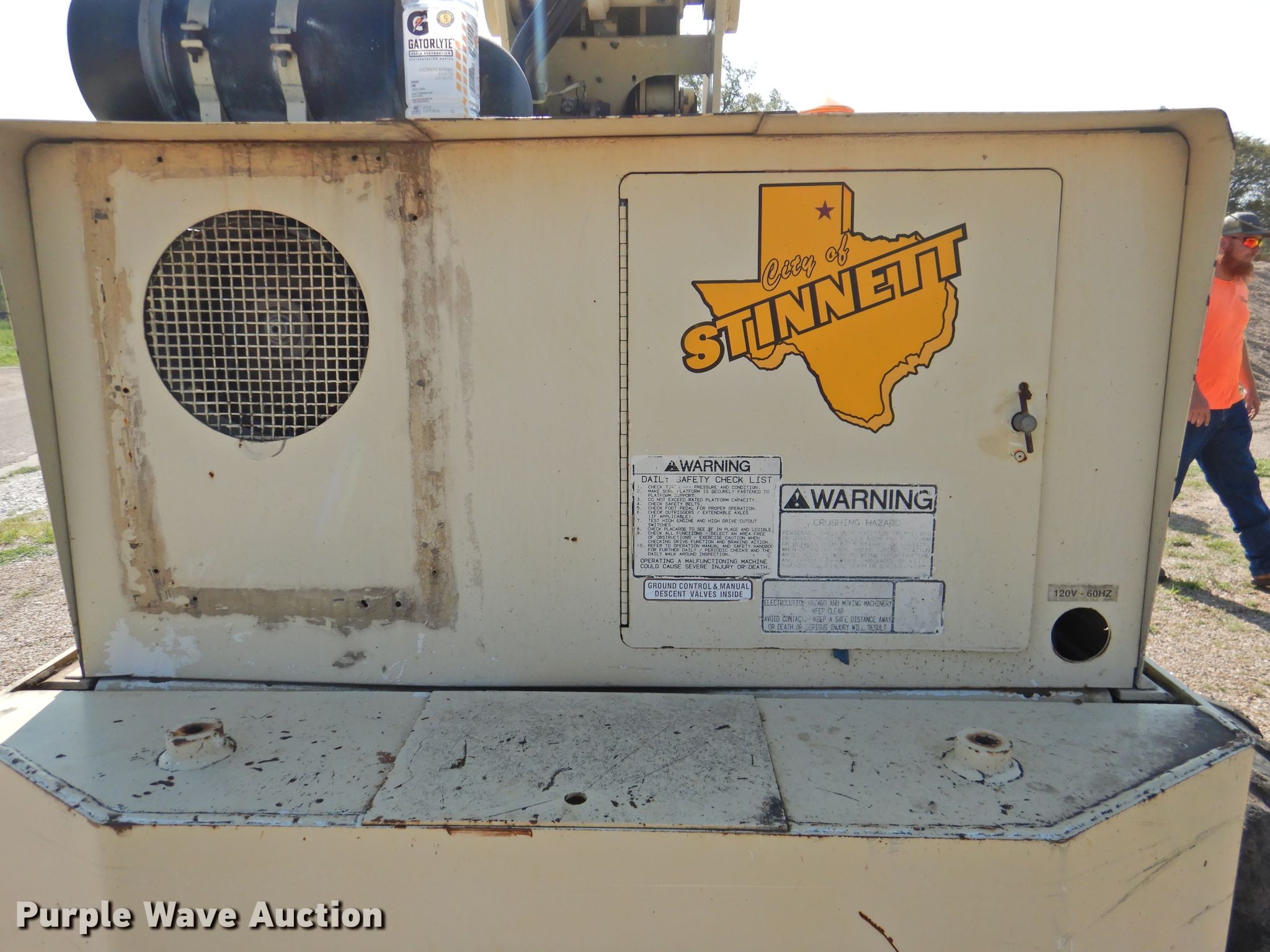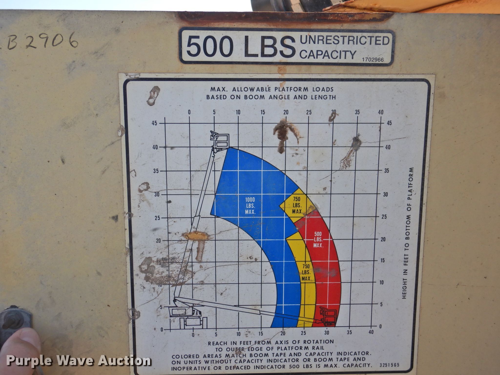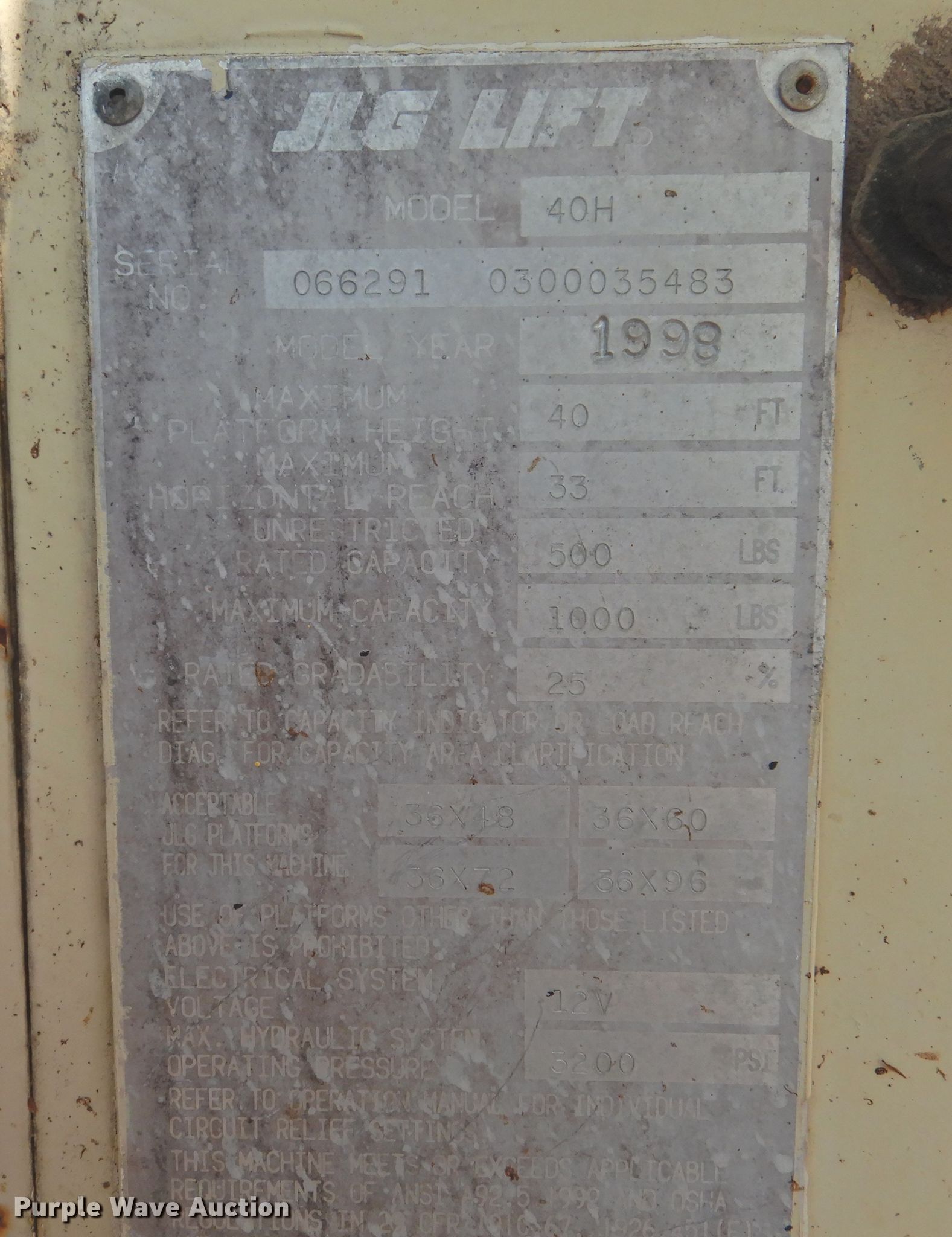 1998 JLG 40H boom lift. 3,894 hours on meter, Serial: 0300035483. Engine Deutz, Cylinders: 4, Fuel type: Diesel. Operational Maximum lift capacity: 1,000 lbs, Maximum reach length: 33', Maximum lift height: 40', Platform: 58" L x 36" W, AC power outlet, Controls: Platform, Ground, Platform rotation: Hydraulic. Tires Tire size: 12.5L-15. Notes Platform control issues, Hydraulic leak. City of Stinnett. 806 S Morse Ave. Stinnett, TX 79083