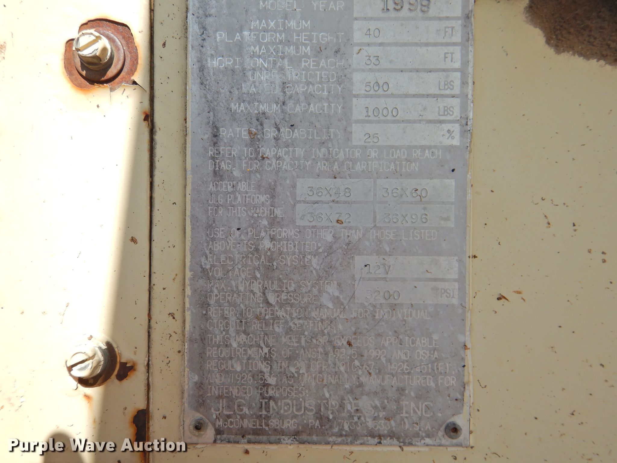 Purple Wave is selling a used Boom Lift in Texas. This item is a 1998 JLG 40H boom lift with the following: 3,894 hours on meter, Serial: 0300035483