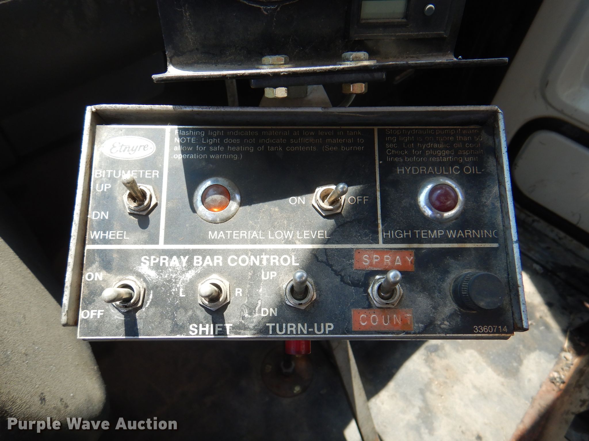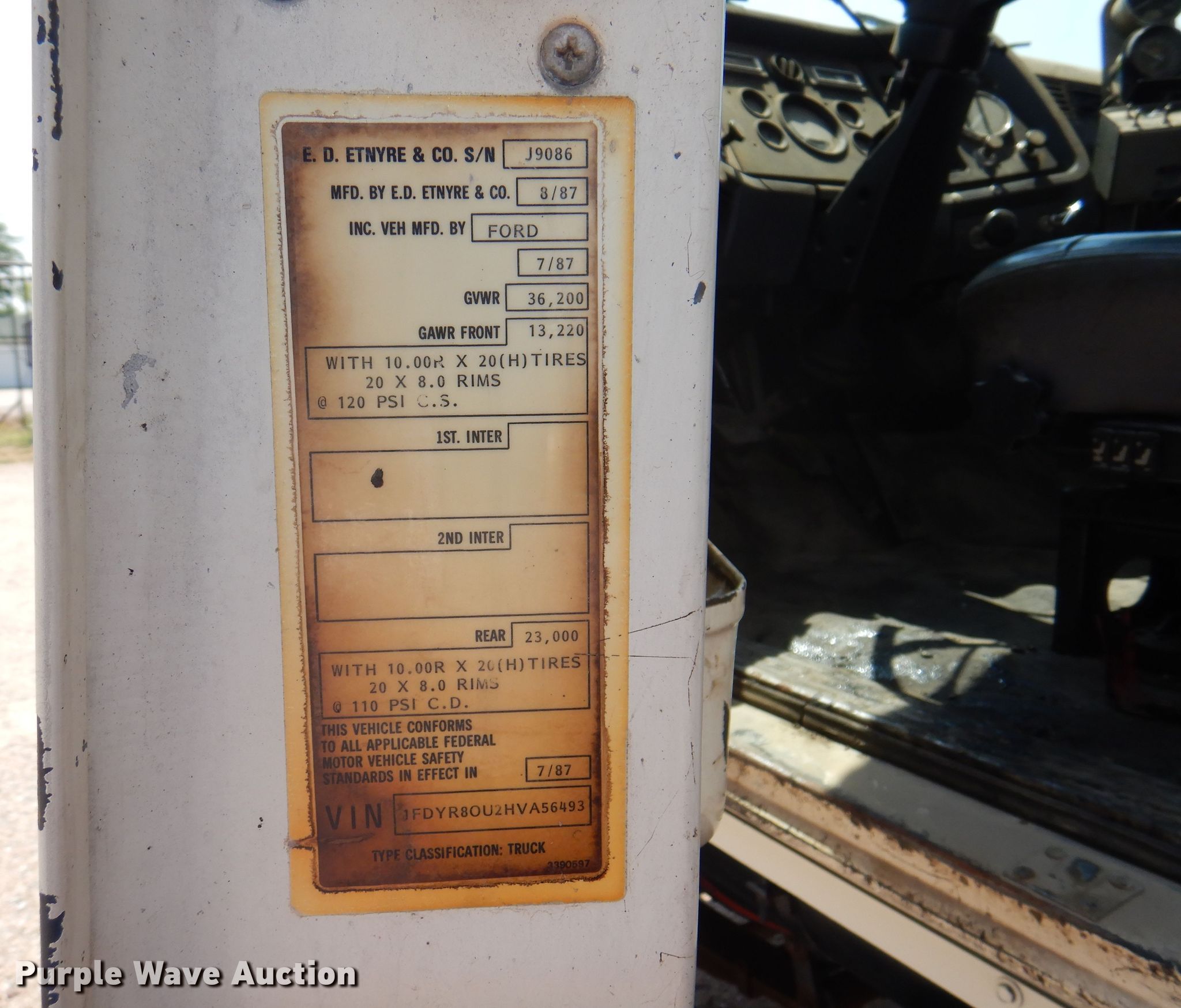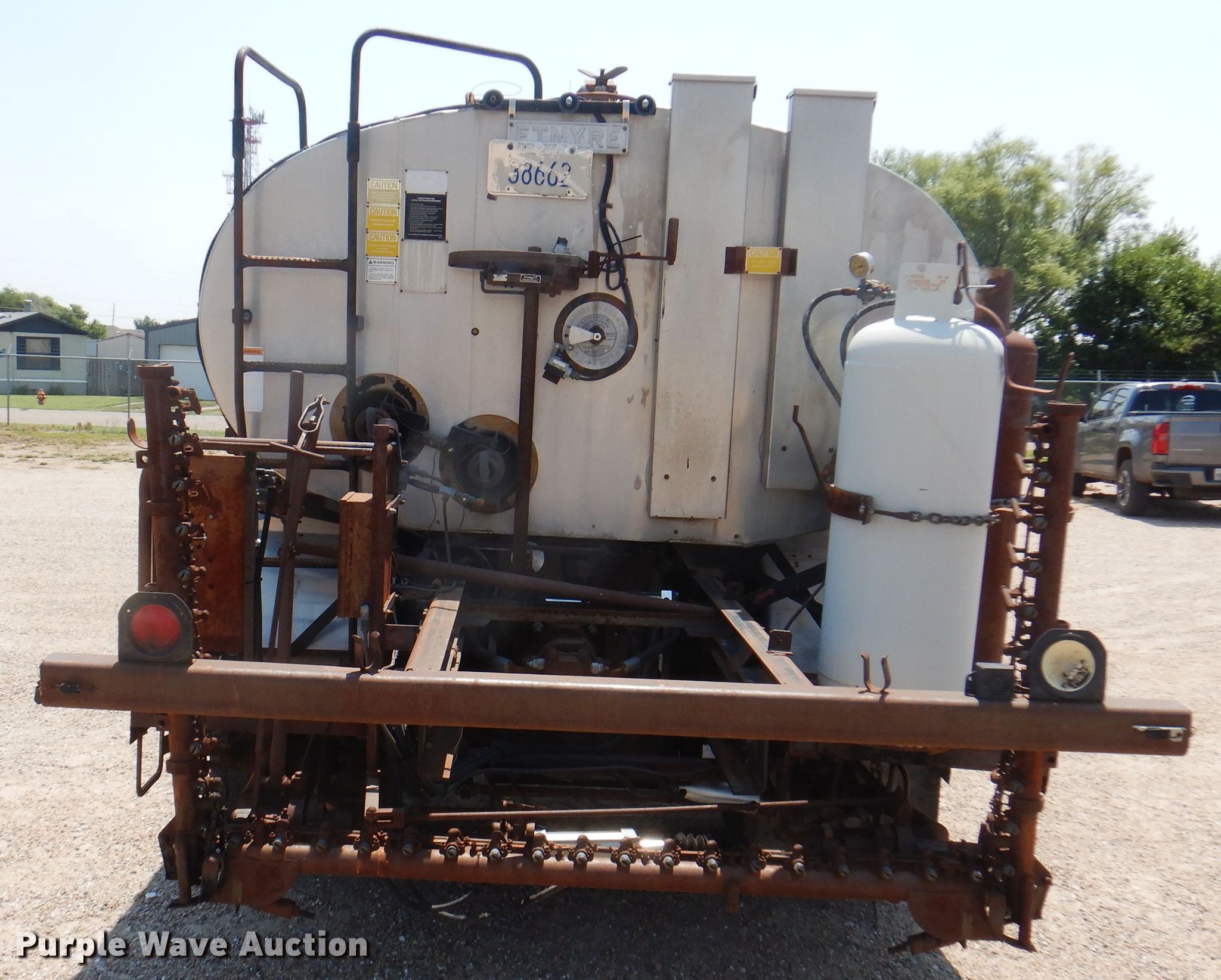 1987 Ford L8000 oil distributor truck. 24,489 miles on odometer. Engine Caterpillar 3208, Displacement: 10.4L, Cylinders: 8, Fuel type: Diesel. Transmission Manual, Speed: 5, plus 2. Chassis Axles: Single, Suspension: Spring, Brakes: Air, PTO, GVWR: 36,200 lbs. Interior AC, Heat. Operational Bed / tank ED Etnyre, Serial: J9086, 17' L, Burner: LPG, Spray boom Width: 15', Folding, Nozzles: 40.. Tires Size: 10.00 R20. Kansas title. 1FDYR80U2HVA56493. Haskell County Road Department. 401 Dennis St. Sublette, KS 67877