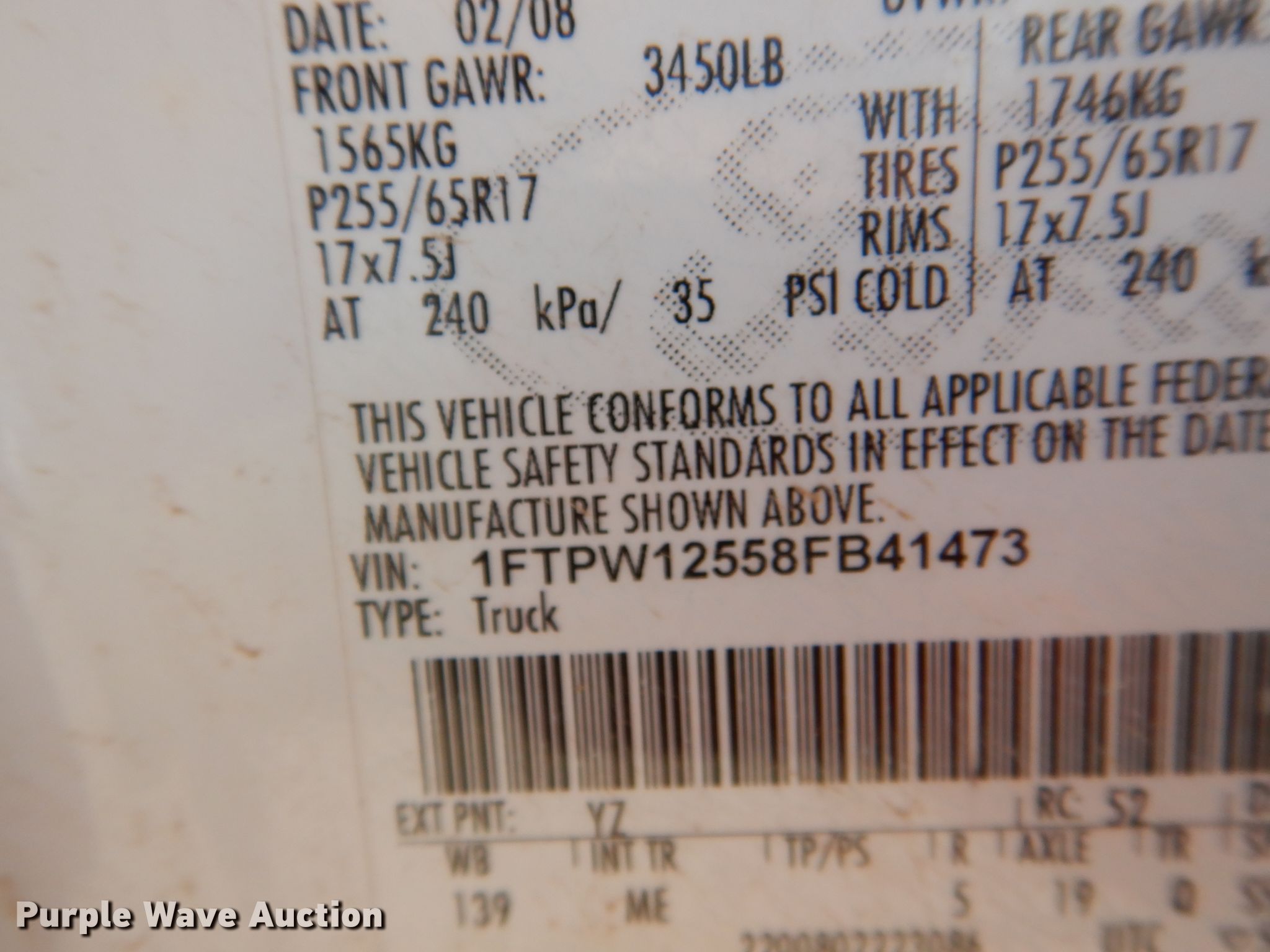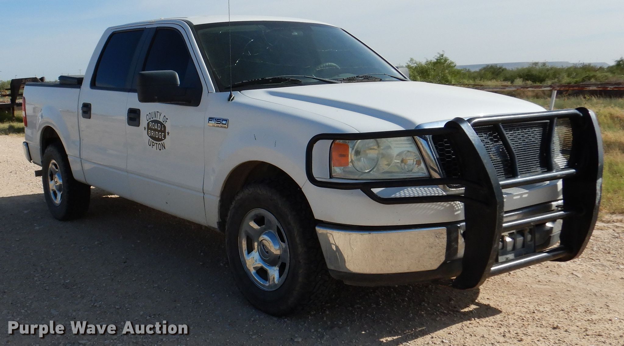 2008 Ford F150 XLT SuperCrew pickup truck. 144,477 miles on odometer. Engine Displacement: 5.4L V8 SOHC 16V, Cylinders: 8, Fuel type: Gas. Transmission Automatic. Interior AC, Heat, Power windows, Power locks, Cruise control. Tires Size: 265/70R17. Notes Dash warning indicator: Check engine, TPMS, Air bag, Battery, Windshield chipped or cracked. Texas title. Title distribution may be delayed up to 14 days from verification of funds. 1FTPW12558FB41473. Upton County. 2548 Farm To Market Rd 305. Mc Camey, TX 79752