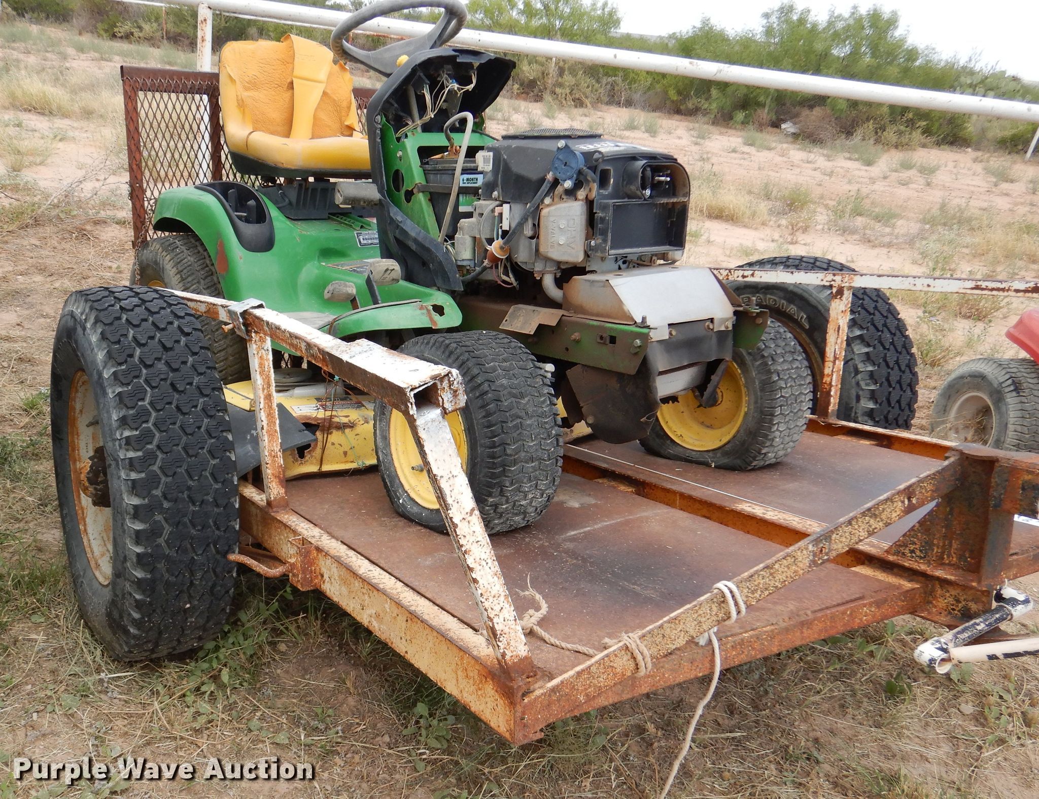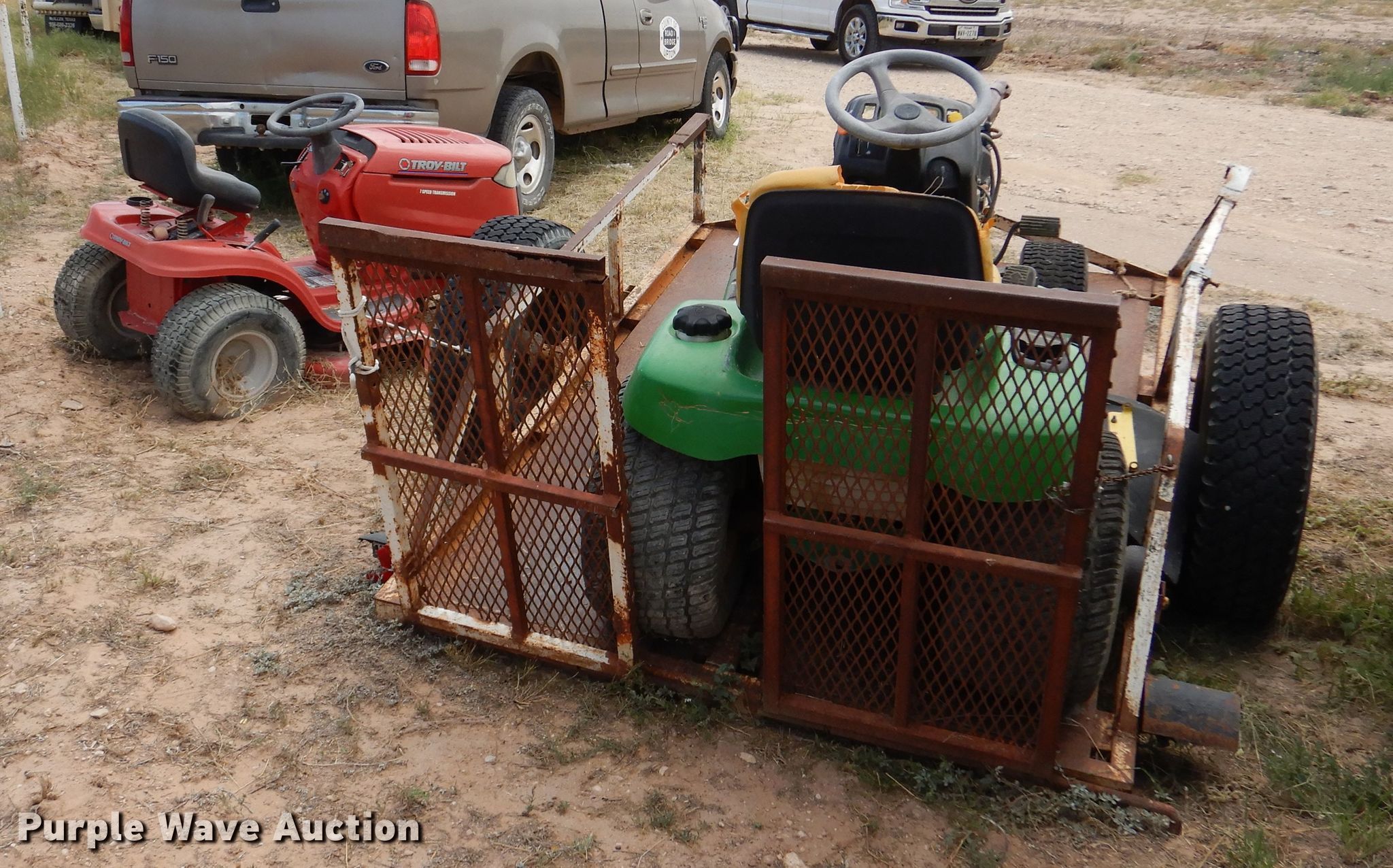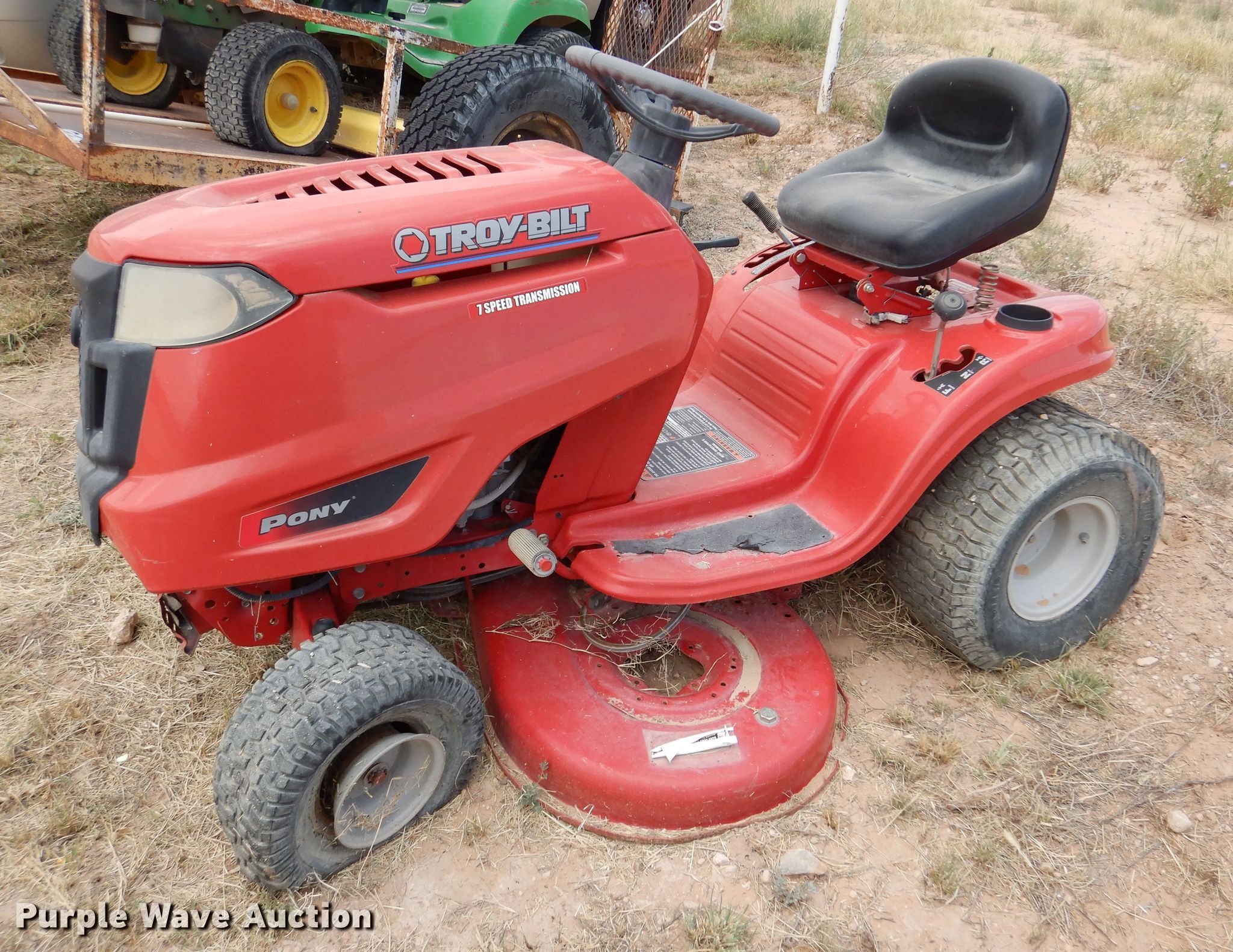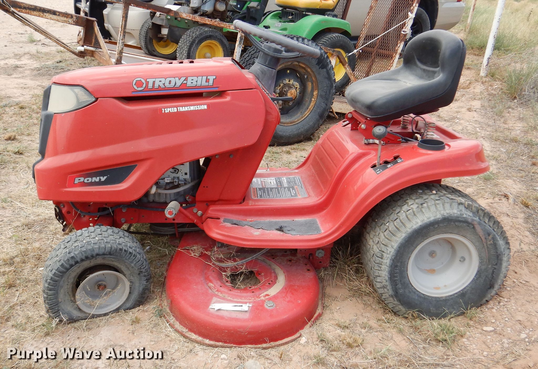 Troy-Bilt Pony lawn mower. Cutting width: 36", Serial: 1H069H162354. Engine Briggs & Stratton, Displacement: 500 cc, Cylinders: 1, Fuel type: Gas, HP: 17.5. Transmission Manual, Speed: 7. Chassis PTO. Tires Front: 15x6.00-6NHS, Rear: 20x8.00-8. Notes Unknown operating condition. John Deere LT190 lawn mower Cutting width: 48", Serial: M)L190N530119. Engine Kawasaki FH580V, Cylinders: 2, Fuel type: Gas, HP: 18. Transmission Hydrostatic. Chassis PTO. Tires Front: 16x6.50-8, Rear: 22x11.00-10. Rosco Manufacturing 5 utility trailer VIN: 577. Dimensions Overall: 11' 3" L x 4' 10" W, Deck: 7' L x 4' 10" W, Ramps: Manual Length: 3' 1". Operational Deck type: Steel. Chassis Ball hitch: 2", Suspension: Spring, Axles: Single. Tires Steel wheels, Size: 235/75R15. Notes Unknown operating condition. Upton County. 2548 Farm To Market Rd 305. Mc Camey, TX 79752