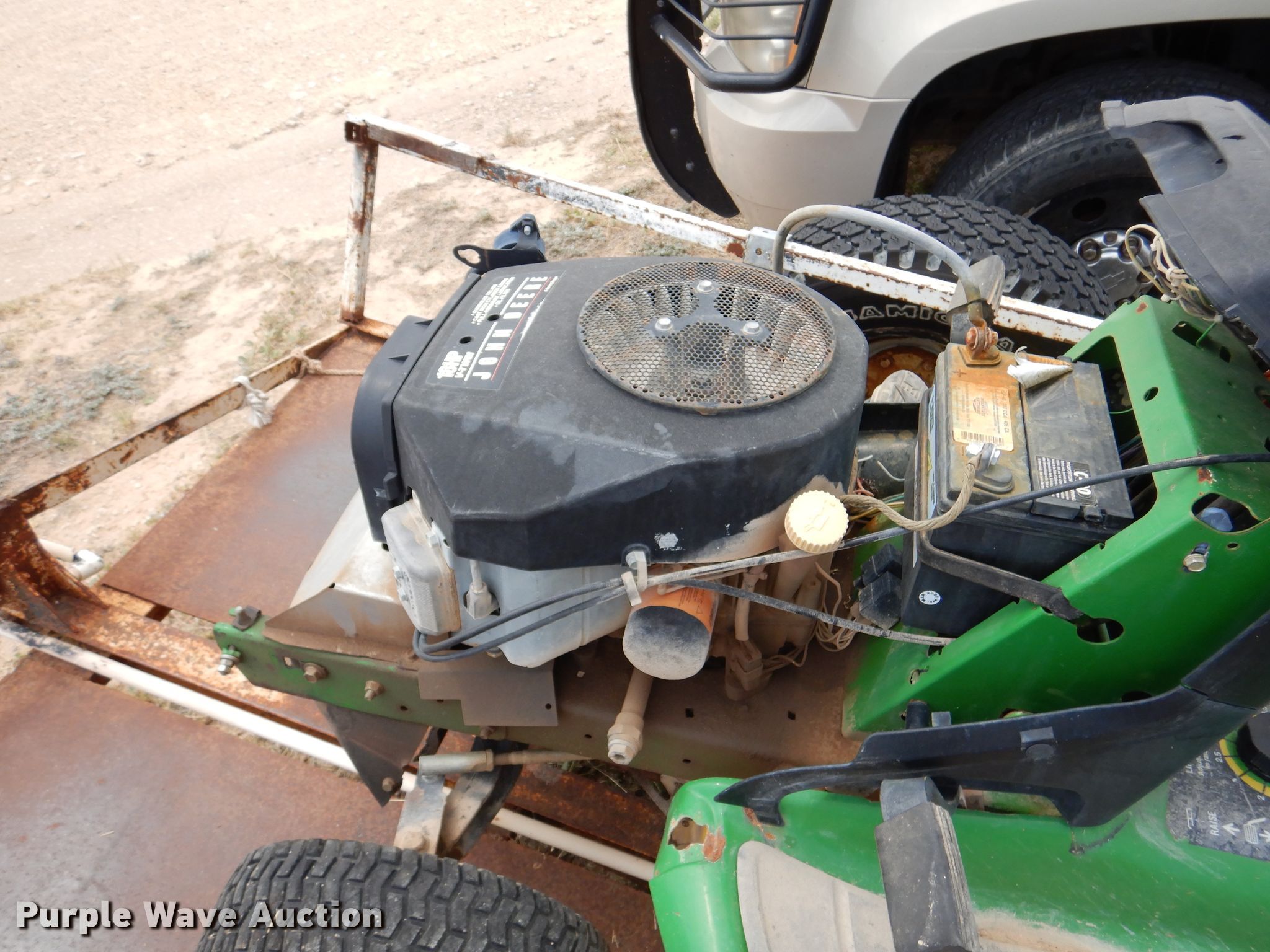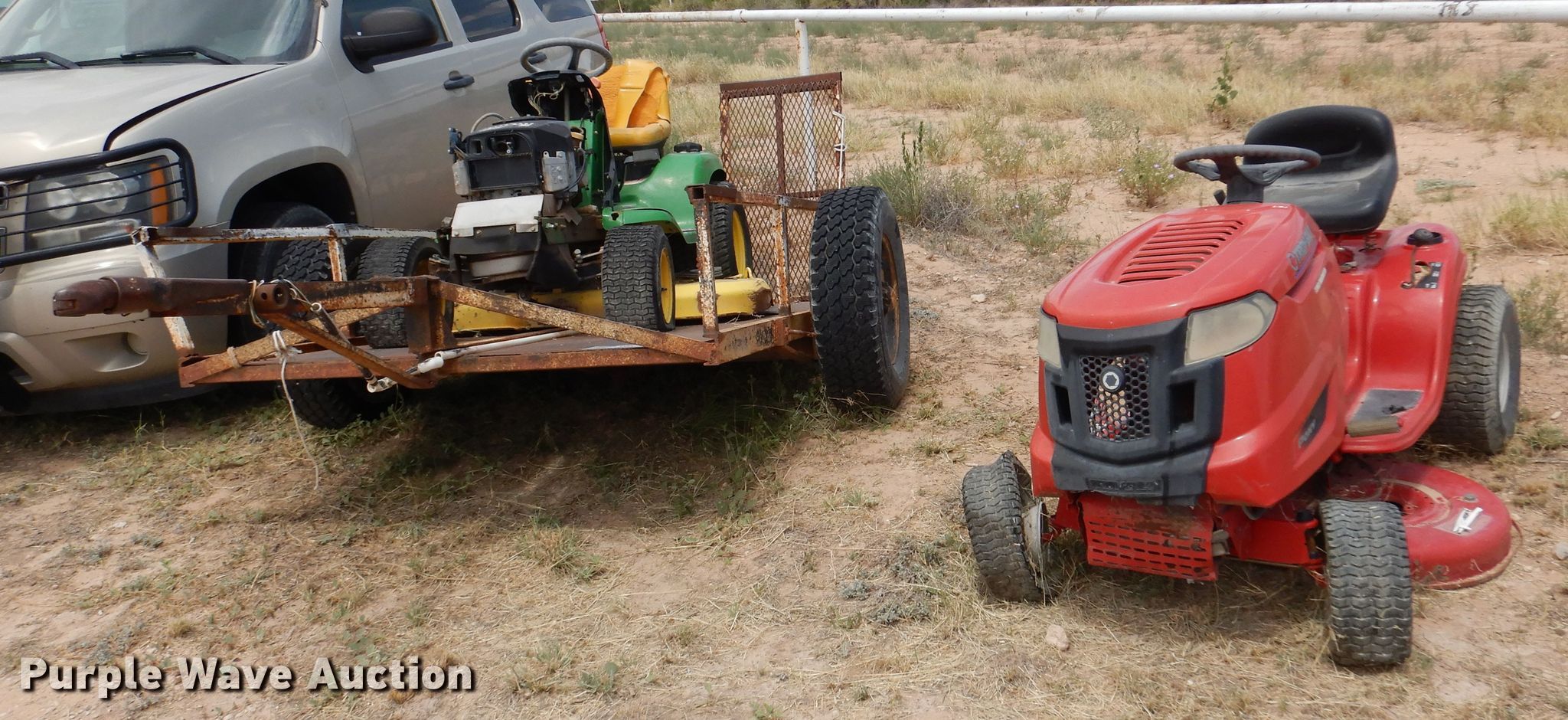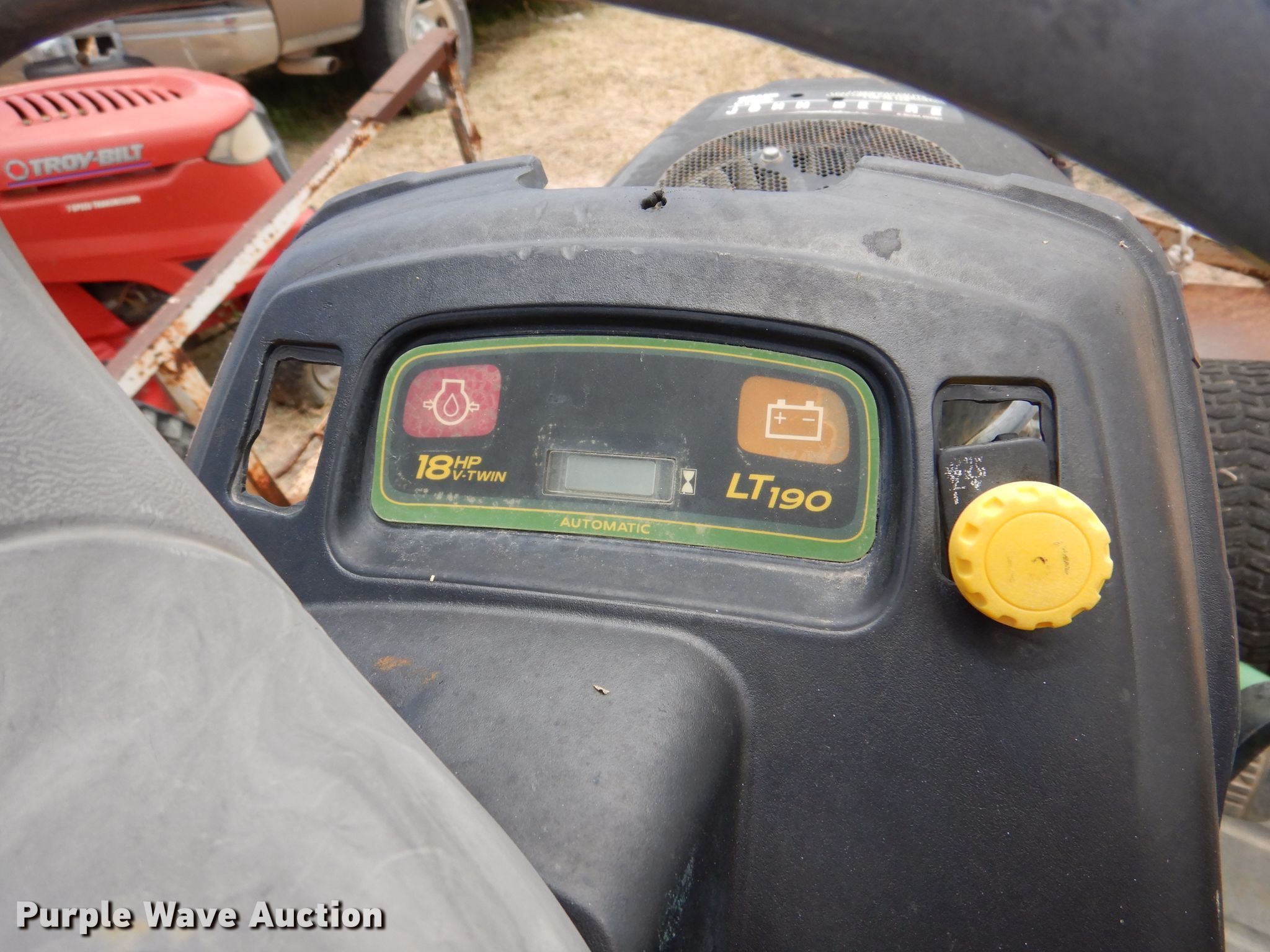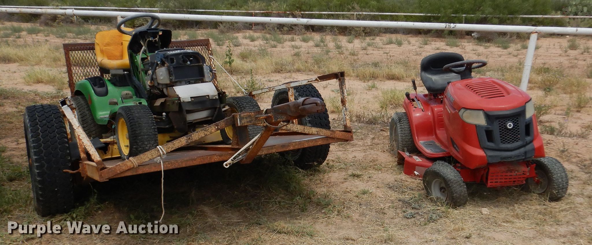 Troy-Bilt Pony lawn mower. Cutting width: 36", Serial: 1H069H162354. Engine Briggs & Stratton, Displacement: 500 cc, Cylinders: 1, Fuel type: Gas, HP: 17.5. Transmission Manual, Speed: 7. Chassis PTO. Tires Front: 15x6.00-6NHS, Rear: 20x8.00-8. Notes Unknown operating condition. John Deere LT190 lawn mower Cutting width: 48", Serial: M)L190N530119. Engine Kawasaki FH580V, Cylinders: 2, Fuel type: Gas, HP: 18. Transmission Hydrostatic. Chassis PTO. Tires Front: 16x6.50-8, Rear: 22x11.00-10. Rosco Manufacturing 5 utility trailer VIN: 577. Dimensions Overall: 11' 3" L x 4' 10" W, Deck: 7' L x 4' 10" W, Ramps: Manual Length: 3' 1". Operational Deck type: Steel. Chassis Ball hitch: 2", Suspension: Spring, Axles: Single. Tires Steel wheels, Size: 235/75R15. Notes Unknown operating condition. Upton County. 2548 Farm To Market Rd 305. Mc Camey, TX 79752