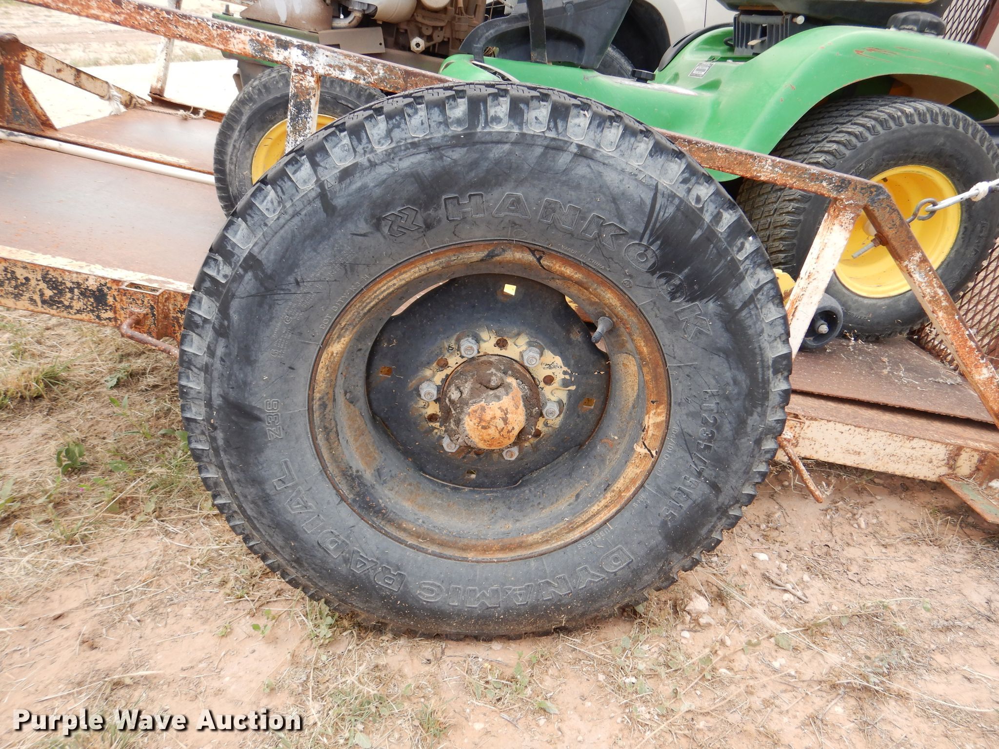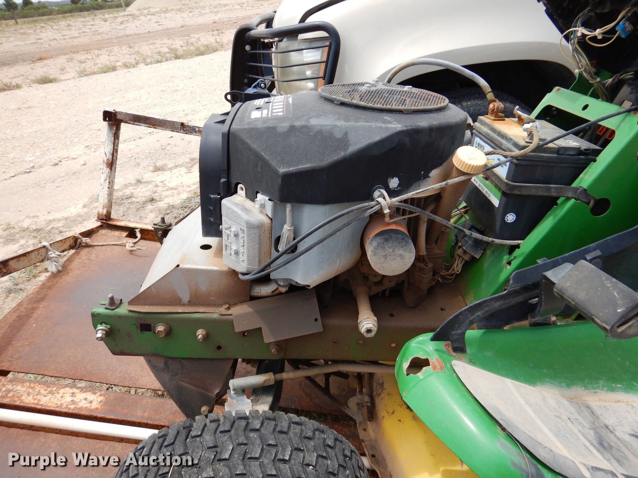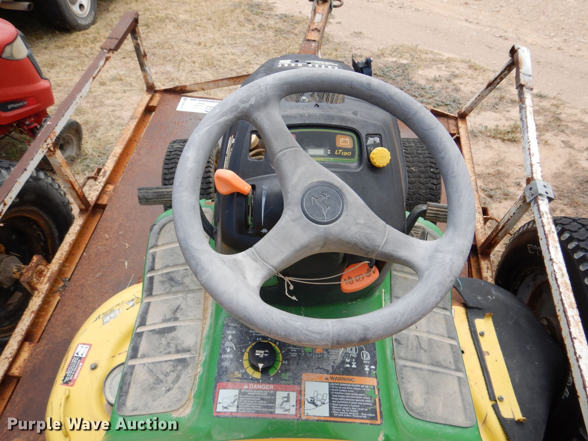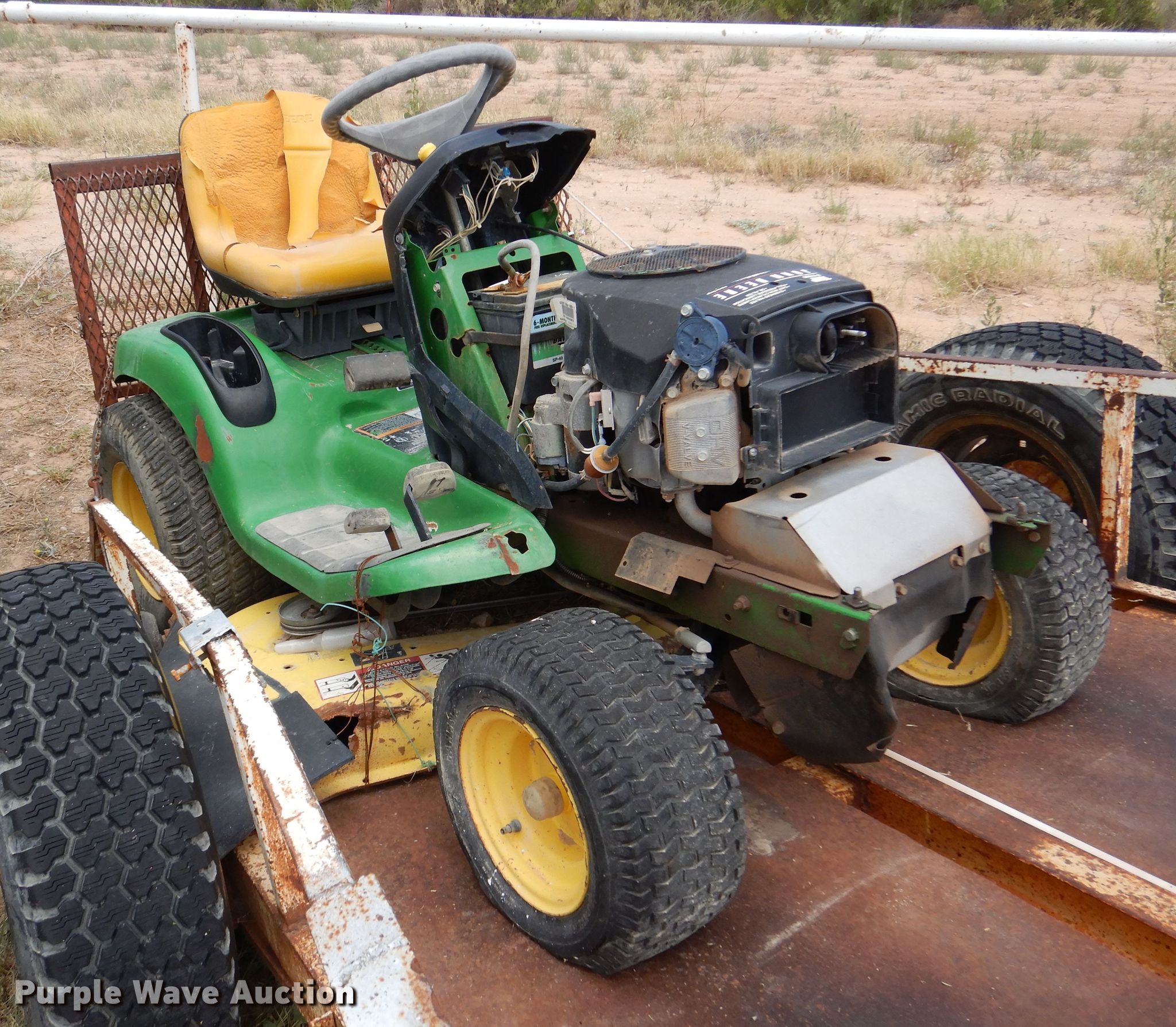 Troy-Bilt Pony lawn mower. Cutting width: 36", Serial: 1H069H162354. Engine Briggs & Stratton, Displacement: 500 cc, Cylinders: 1, Fuel type: Gas, HP: 17.5. Transmission Manual, Speed: 7. Chassis PTO. Tires Front: 15x6.00-6NHS, Rear: 20x8.00-8. Notes Unknown operating condition. John Deere LT190 lawn mower Cutting width: 48", Serial: M)L190N530119. Engine Kawasaki FH580V, Cylinders: 2, Fuel type: Gas, HP: 18. Transmission Hydrostatic. Chassis PTO. Tires Front: 16x6.50-8, Rear: 22x11.00-10. Rosco Manufacturing 5 utility trailer VIN: 577. Dimensions Overall: 11' 3" L x 4' 10" W, Deck: 7' L x 4' 10" W, Ramps: Manual Length: 3' 1". Operational Deck type: Steel. Chassis Ball hitch: 2", Suspension: Spring, Axles: Single. Tires Steel wheels, Size: 235/75R15. Notes Unknown operating condition. Upton County. 2548 Farm To Market Rd 305. Mc Camey, TX 79752