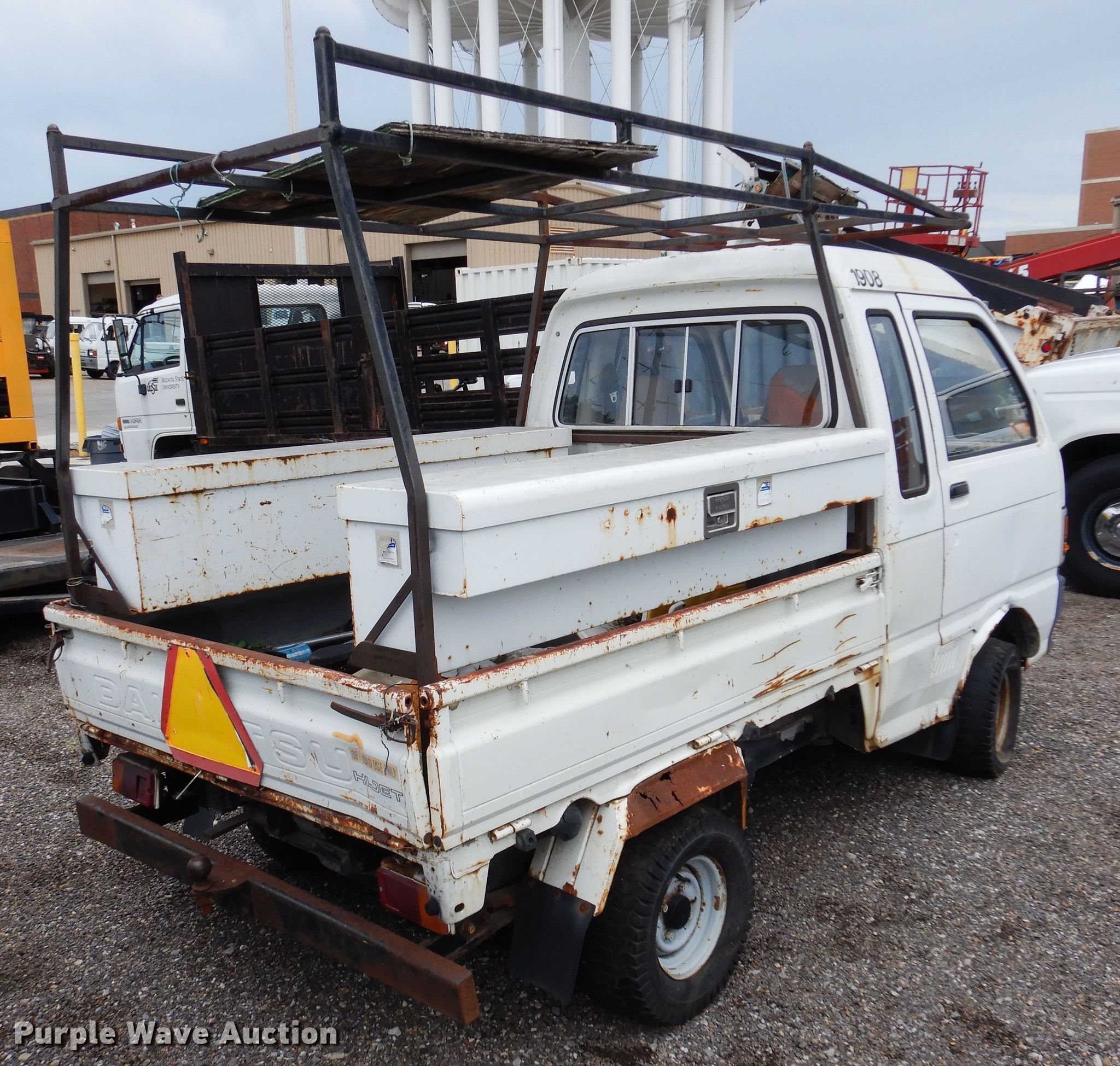 1994 Daihatsu HiJet mini truck. 67,563 miles on odometer. Engine Cylinders: 3, Fuel type: Gas. Transmission Manual. Interior Heat. Tires Size: 20-8.00-10. Notes Unknown operating condition. Kansas non-highway title. JCA000S000309404. Wichita State University Physical Plant. 1845 N Fairmount Ave. Wichita, KS 67260