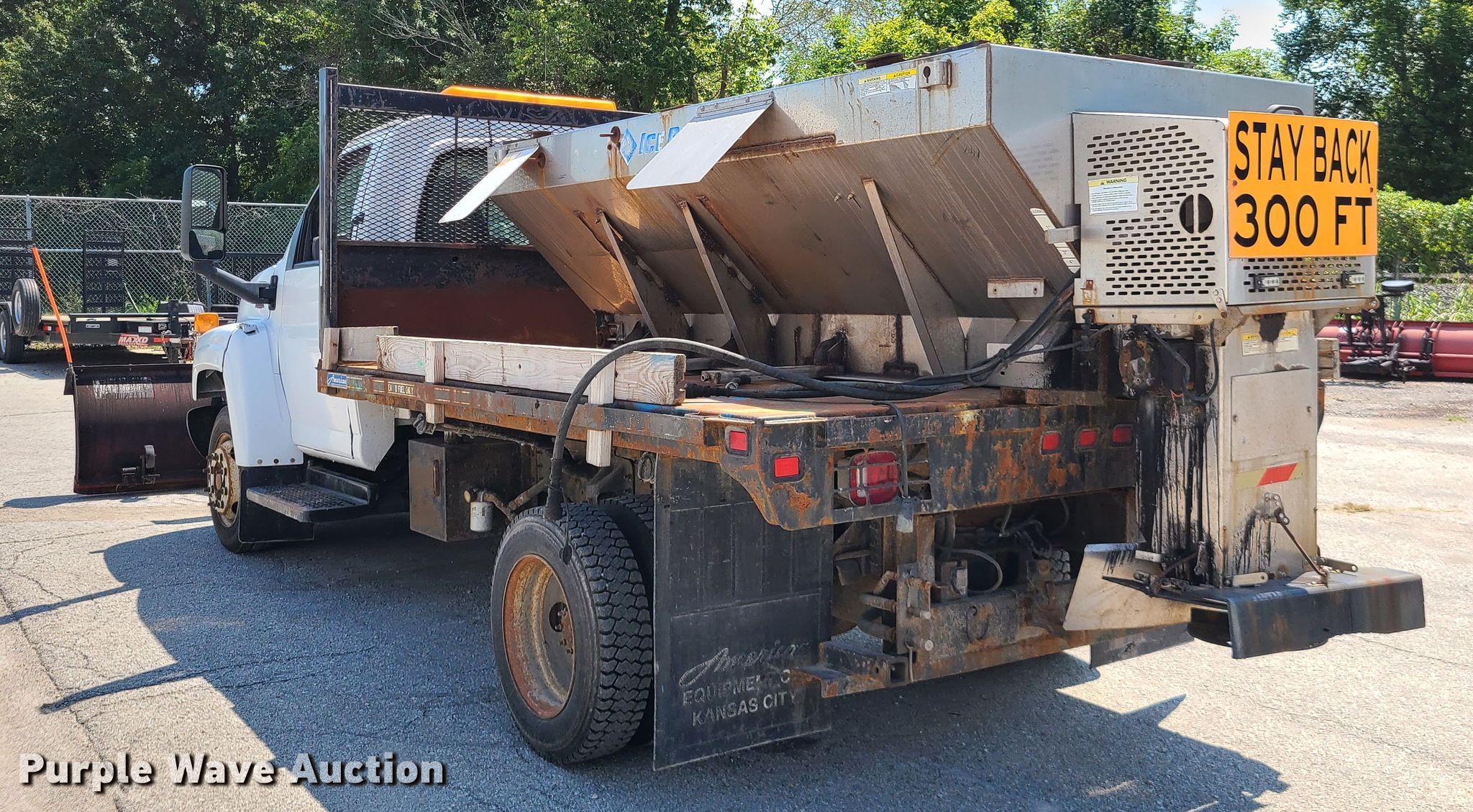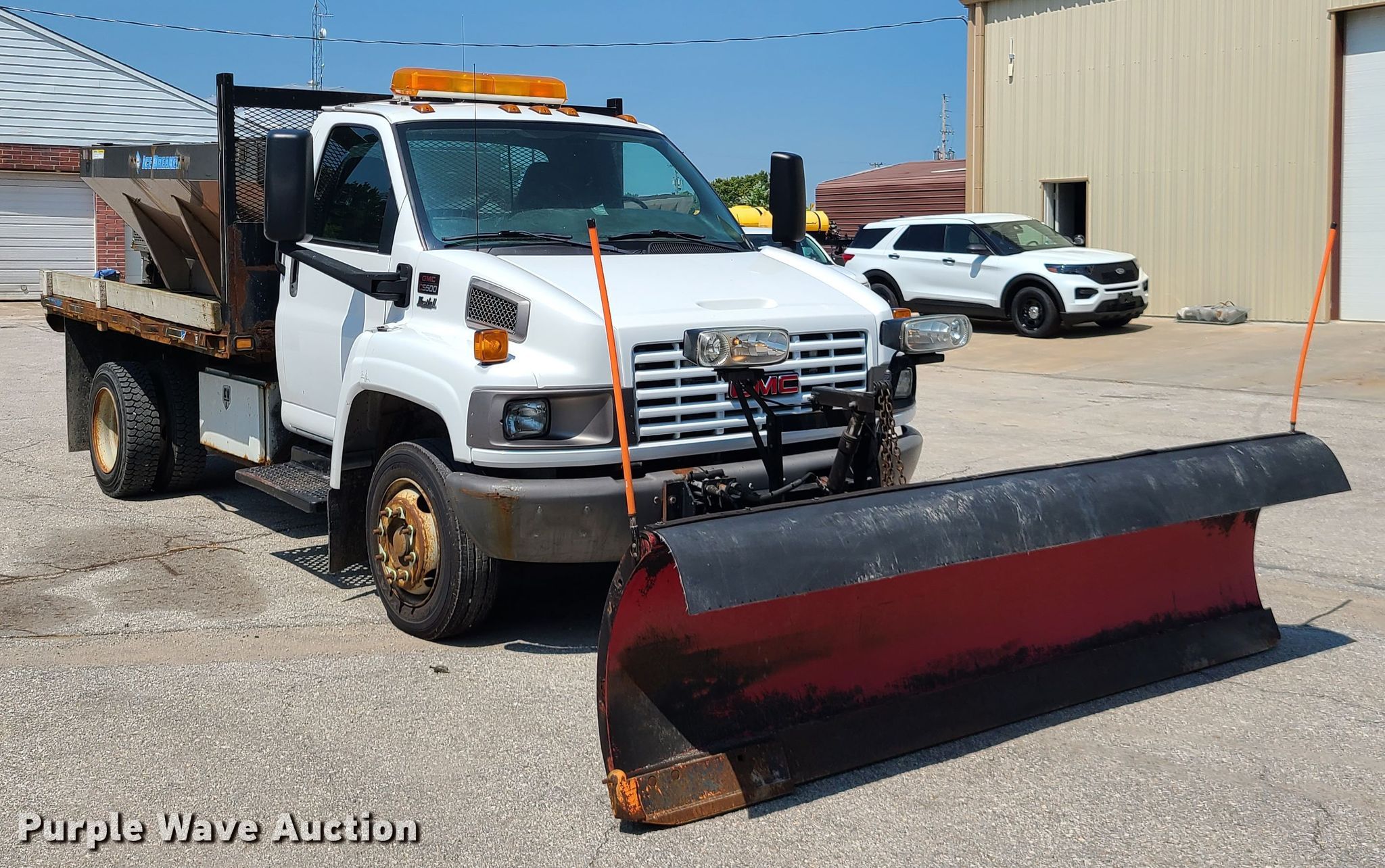 2009 GMC C5500 dump flatbed truck. 35,844 miles on odometer. Engine Displacement: 8.1L, Cylinders: 8, Fuel type: Gas. Transmission Automatic. Chassis Axles: Single, Suspension: Spring, Brakes: Hydraulic. Interior Heat. Operational Dump flatbed 11' L x 8' W, Ram: Single, Spreader Western Ice Breaker, Snow plow Width: 10'. Tires Size: 225/70R19.5. Notes Dash warning indicator: Brake. Missouri title. Title distribution may be delayed up to 14 days from verification of funds. 1GDE5C1G59F404759. City of Grain Valley Fleet Maintenance. 618 James Rollo Ct. Grain Valley, MO 64029