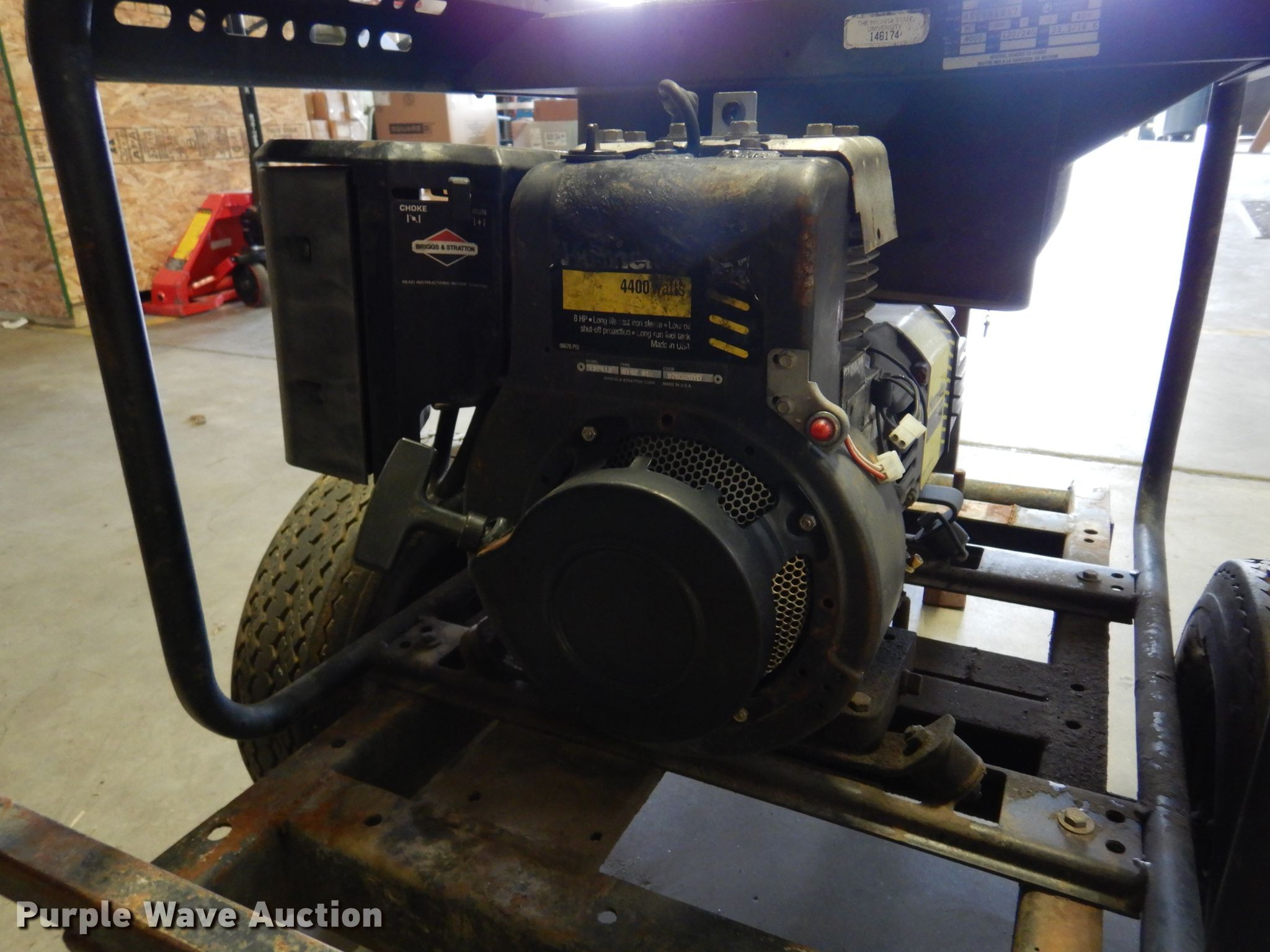 Homelight LR4400 generator. Serial: HS0991817. Engine Briggs & Stratton 197412, Serial: 970325YD, Cylinders: 2, Fuel type: Gas, HP: 8. Operational Generator Homelite LR4400, Watts: 4,400, Trailer mounted. Trailer Shopbuilt, 5.8' L x 32" W, Ball hitch size: 2", Axles: Single, Tire size: 4.80-8. Transfer of ownership documentation will be a bill of sale. Wichita State University Physical Plant. 1845 N Fairmount Ave. Wichita, KS 67260
