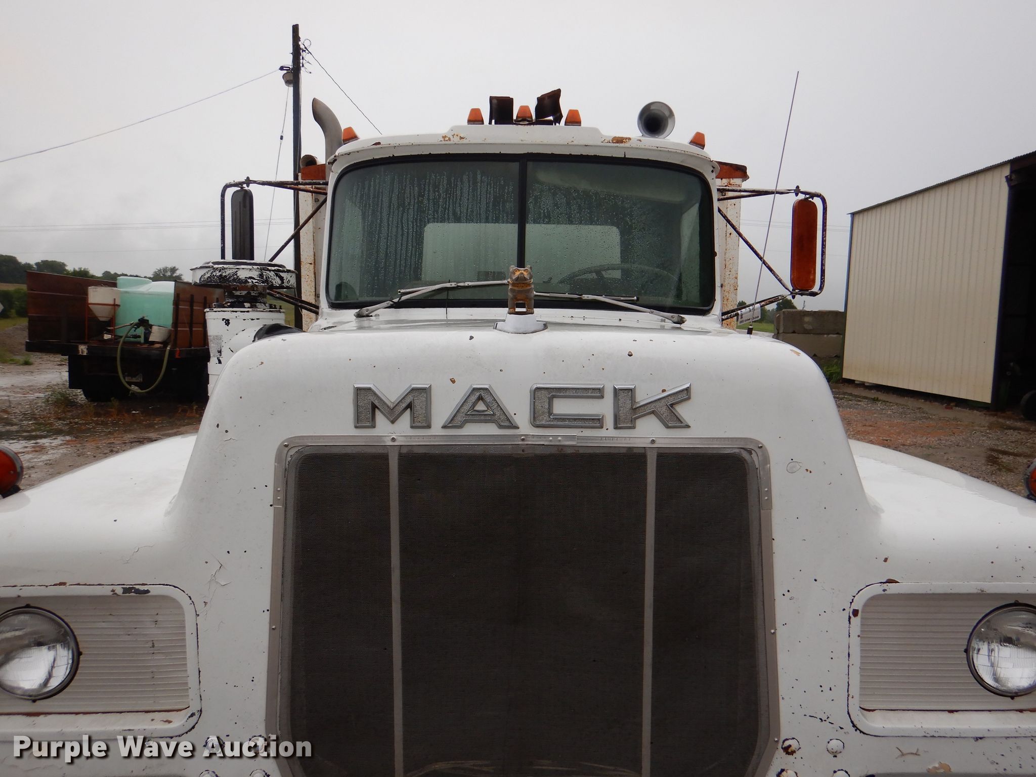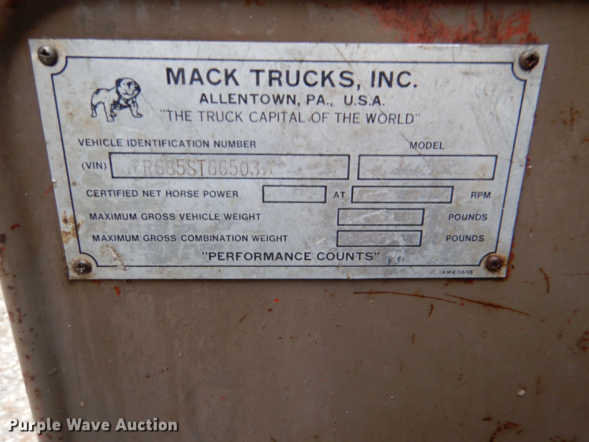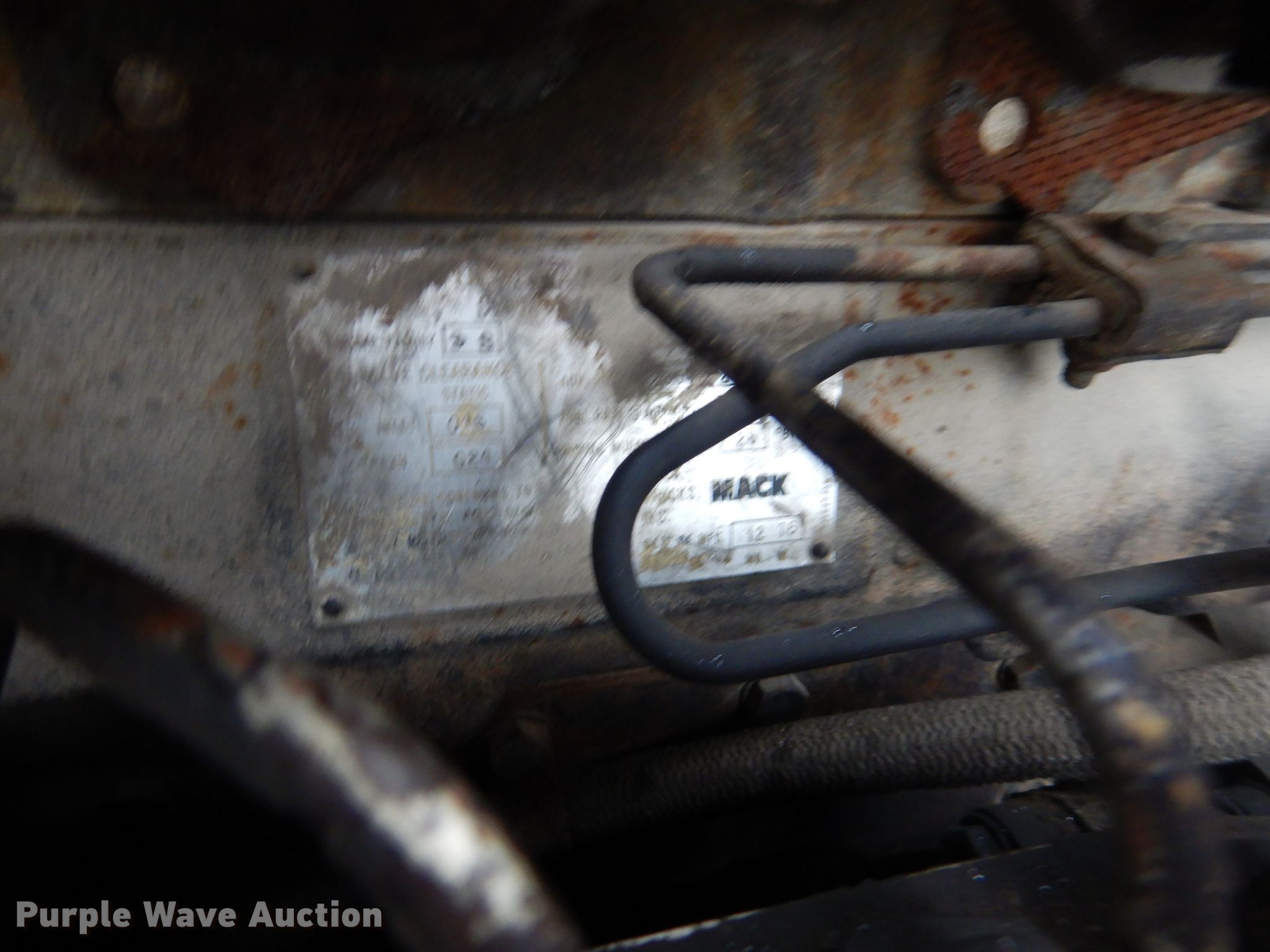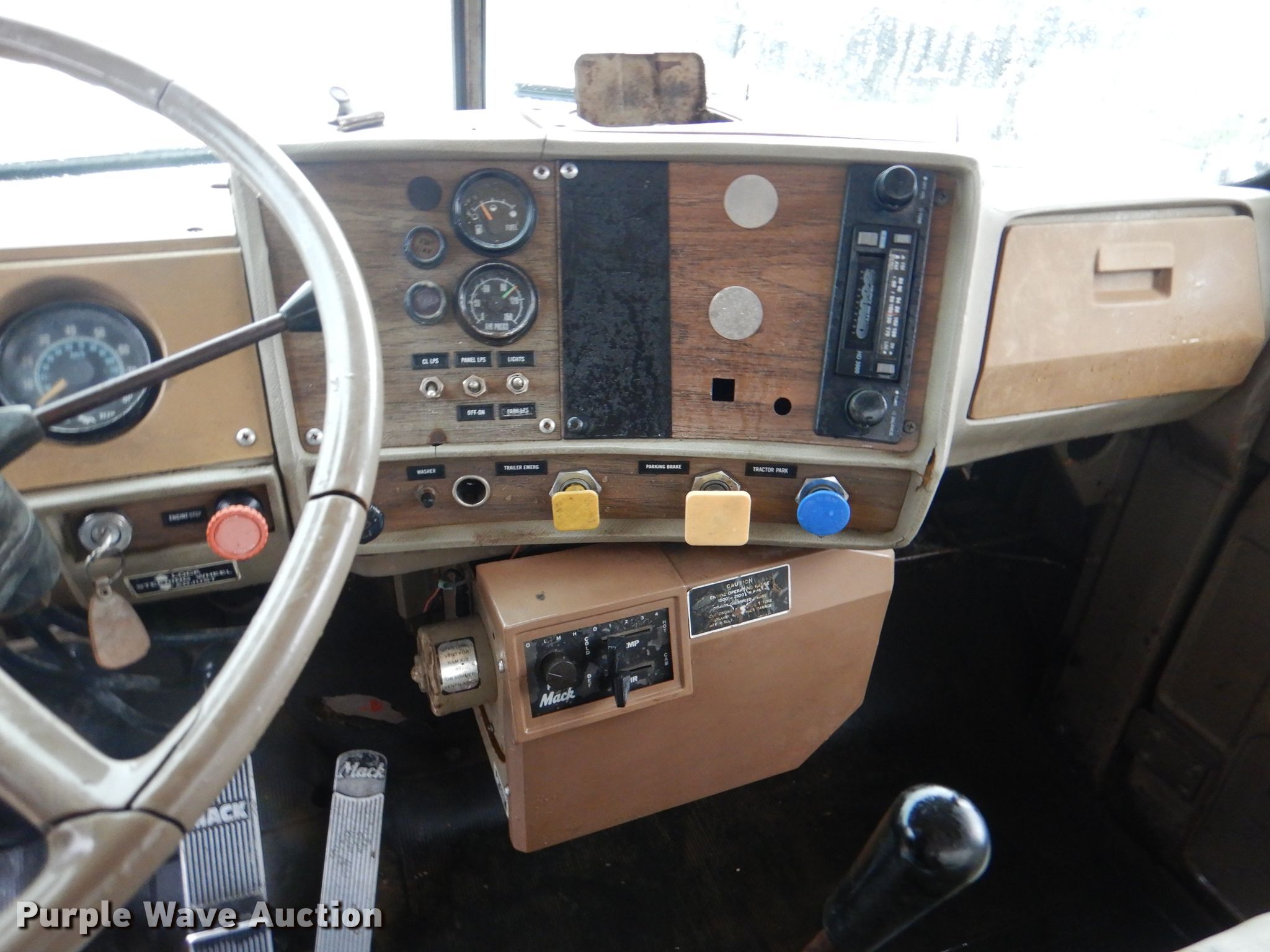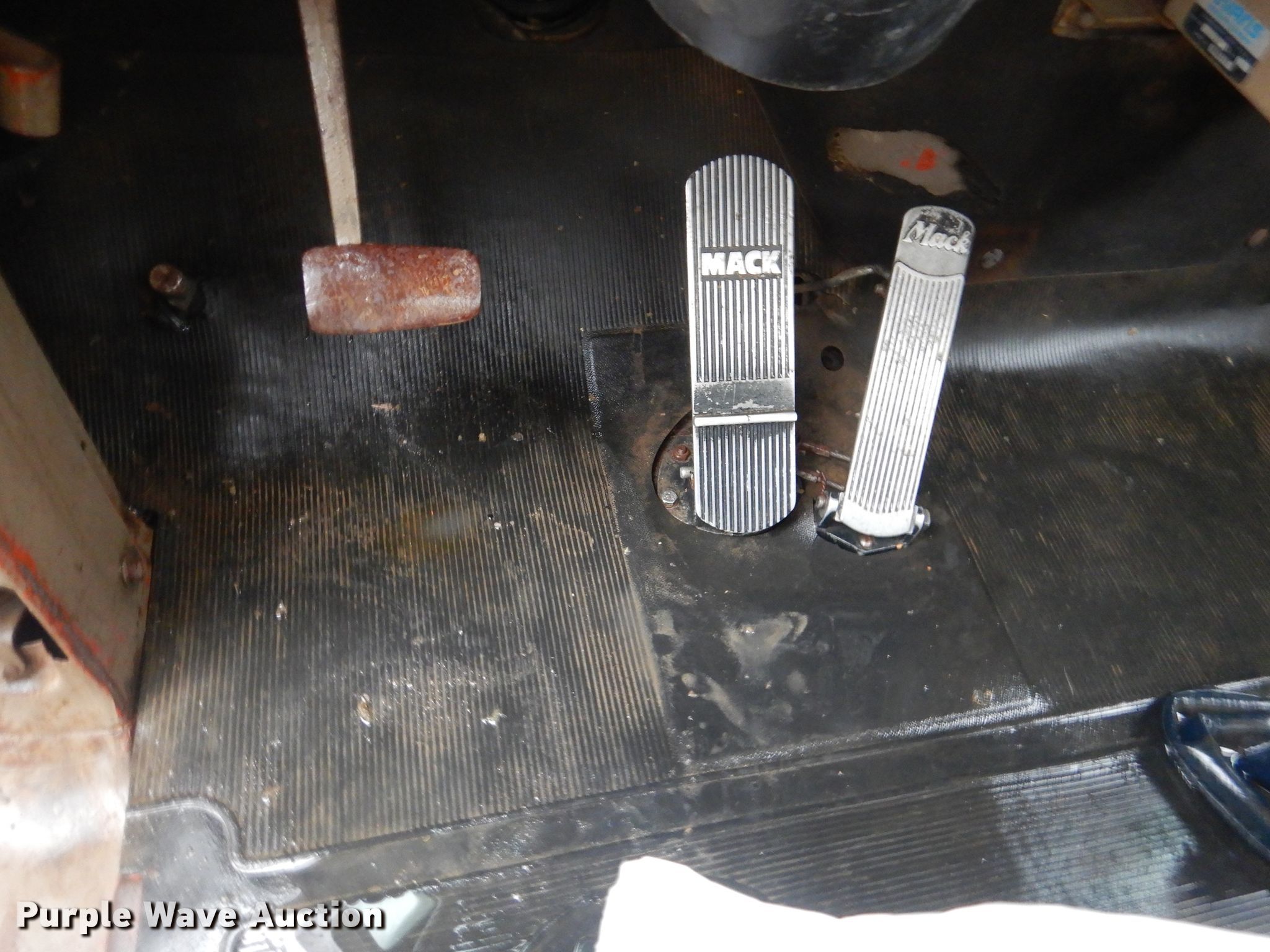 1977 Mack R600 grain truck. 106,028 miles on odometer, Engine hours: 3,519. Engine Mack, Cylinders: 6, Fuel type: Diesel. Transmission Manual, Speed: 5. Chassis Axles: Tandem, Suspension: Camelback, Brakes: Air, PTO. Interior Heat. Operational Dump bed 22' L x 96" W, Side height: 52", Bed type: Steel, Roll tarp, Ram: Dual, End gate: Manual. Tires Size: 10.00R20. Notes Windshield chipped or cracked, Non-operational speedometer. Kansas antique title. R685ST66503. Chris Carstens. Fontana, KS 66026