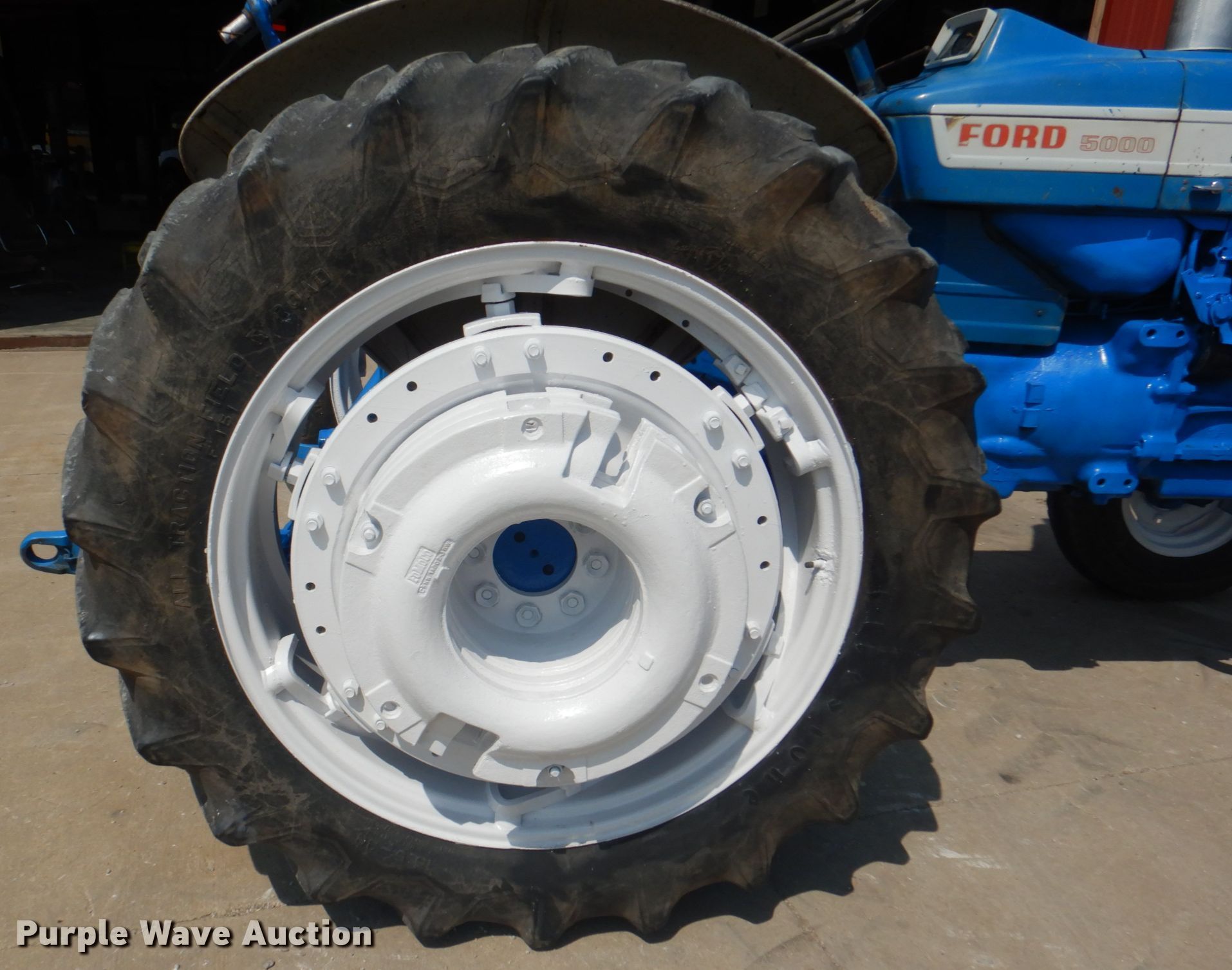 Ford 5000 tractor. 4,968 hours on meter, Serial: 7405. Engine Ford, Cylinders: 4, Fuel type: Diesel. Transmission Powershift, 10F - 2R. Operational PTO: 540, Three point, Hydraulic remote sets Rear: 1, Suitcase weights: 5. Tires Front: 7.50-16, Rear: 15.5-38, Wheel weights: 5. Notes Front wheel weights also included. Grady Farms Inc.. 1326 SE Wilson Rd. Lathrop, MO 64465