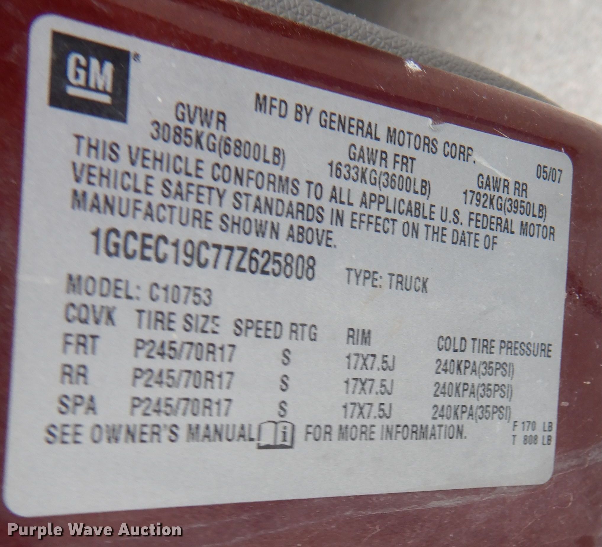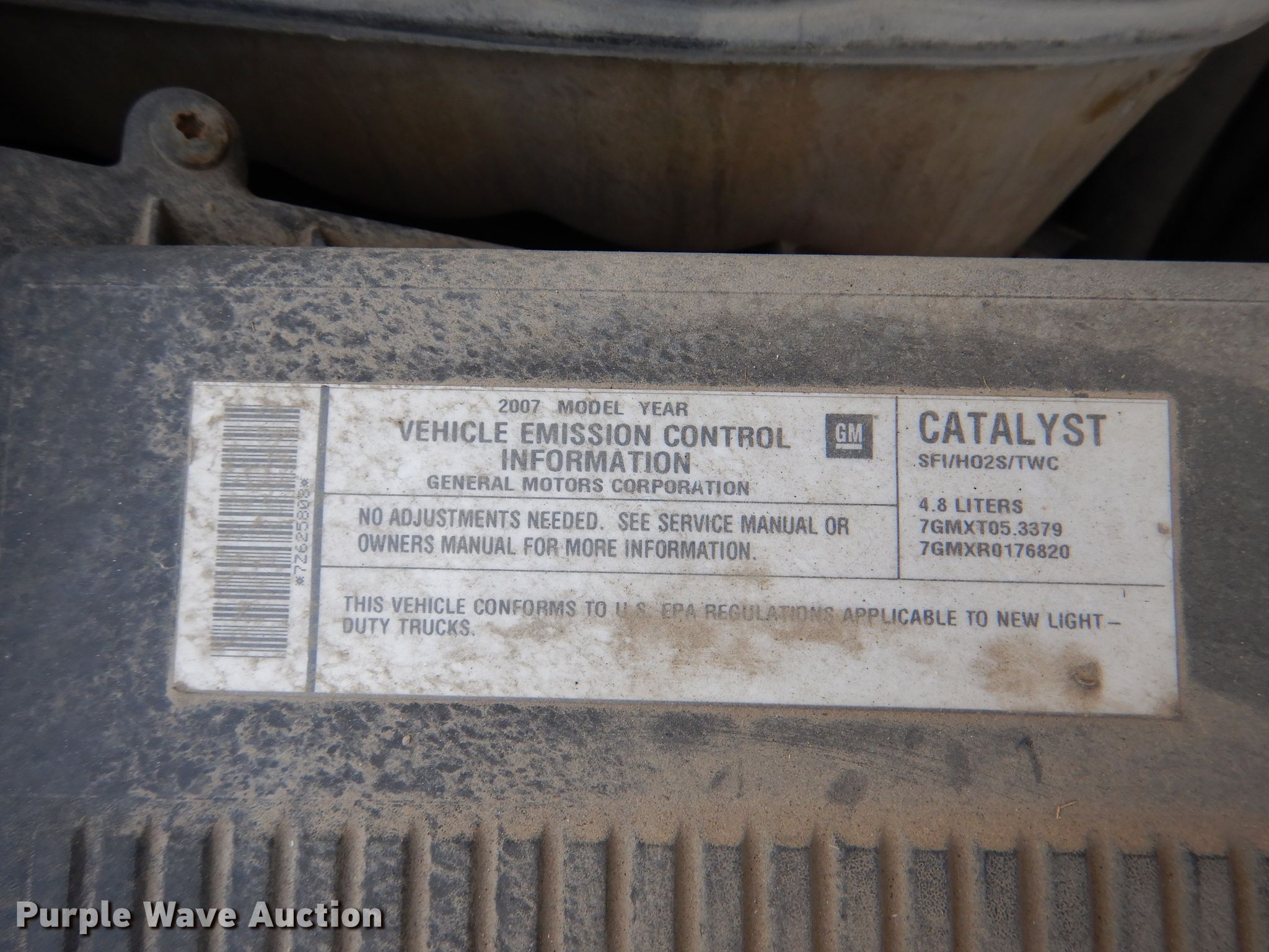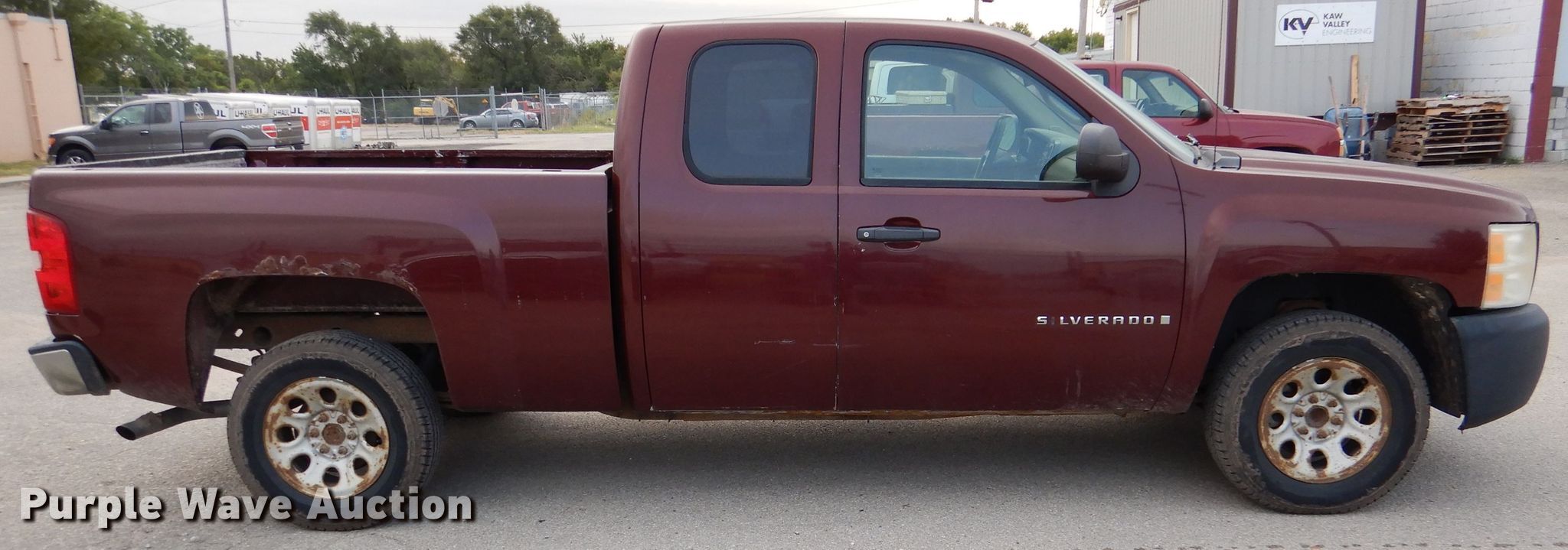 2007 Chevrolet Silverado 1500 Ext. Cab pickup truck. 270,006 miles on odometer. Engine Displacement: 4.8L V8 OHV 16V, Cylinders: 8, Fuel type: Gas. Transmission Automatic. Interior AC, Heat, Cruise control. Tires Size: 245/70R17. Notes Dash warning indicator: TPMS. Kansas title. 1GCEC19C77Z625808. Kaw Valley Engineering, Inc.. 2319 N Jackson St. Junction City, KS 66441