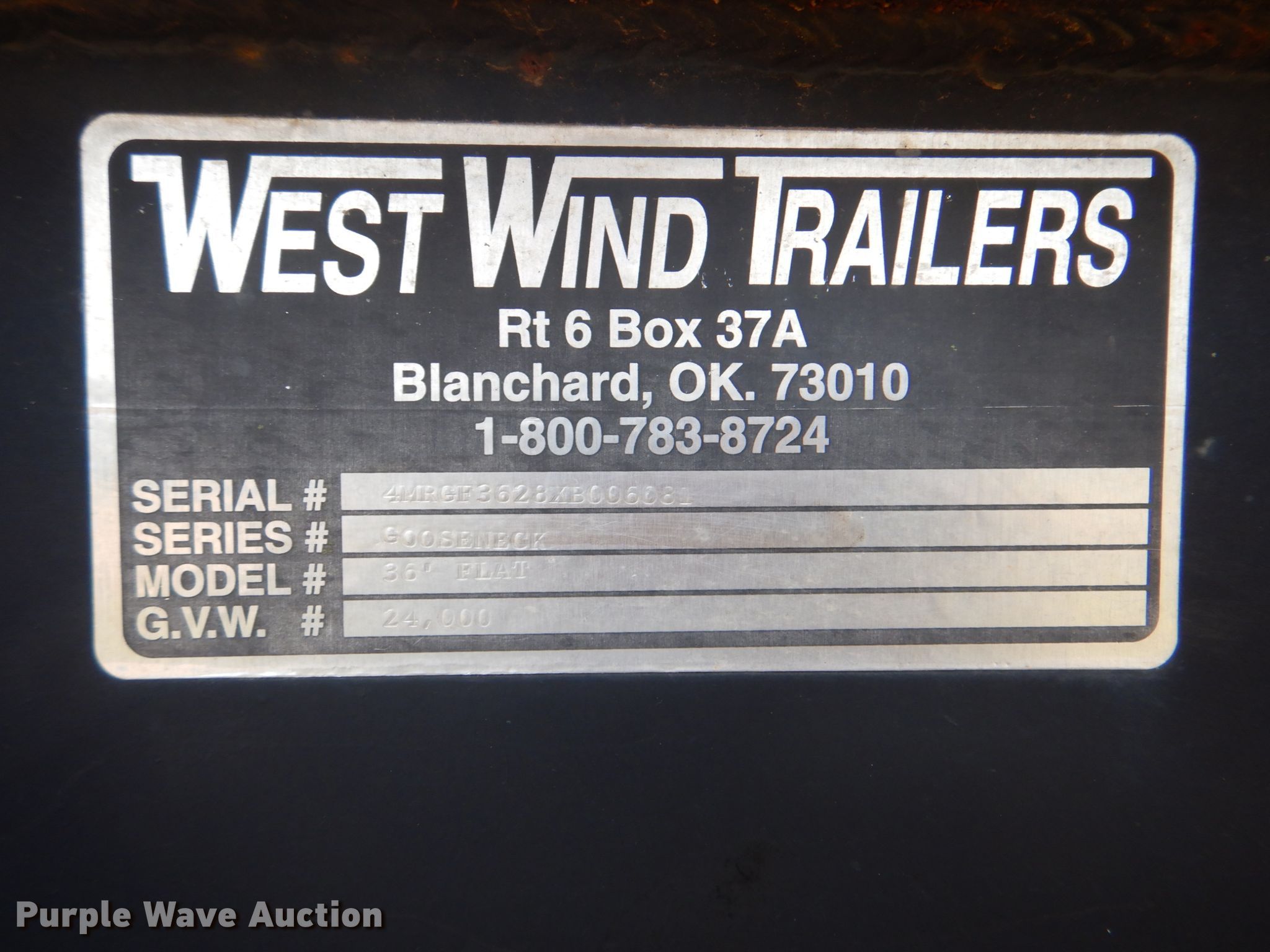 1999 West Wind Trailers equipment trailer. Dimensions. Overall: 45' L x 102" W, Deck: 36' L x 98" W, Ramps: Manual Length: 8'. Operational Deck type: Steel. Chassis Hitch: Gooseneck, Landing gear: Dual, Two speed, Suspension: Spring, Brakes: Electric, Axles: Tandem, GVWR: 24,000 lbs. Tires Size: LT225/85R16. Oklahoma title. 4MRGF3628XB006081. Yale, OK 74085