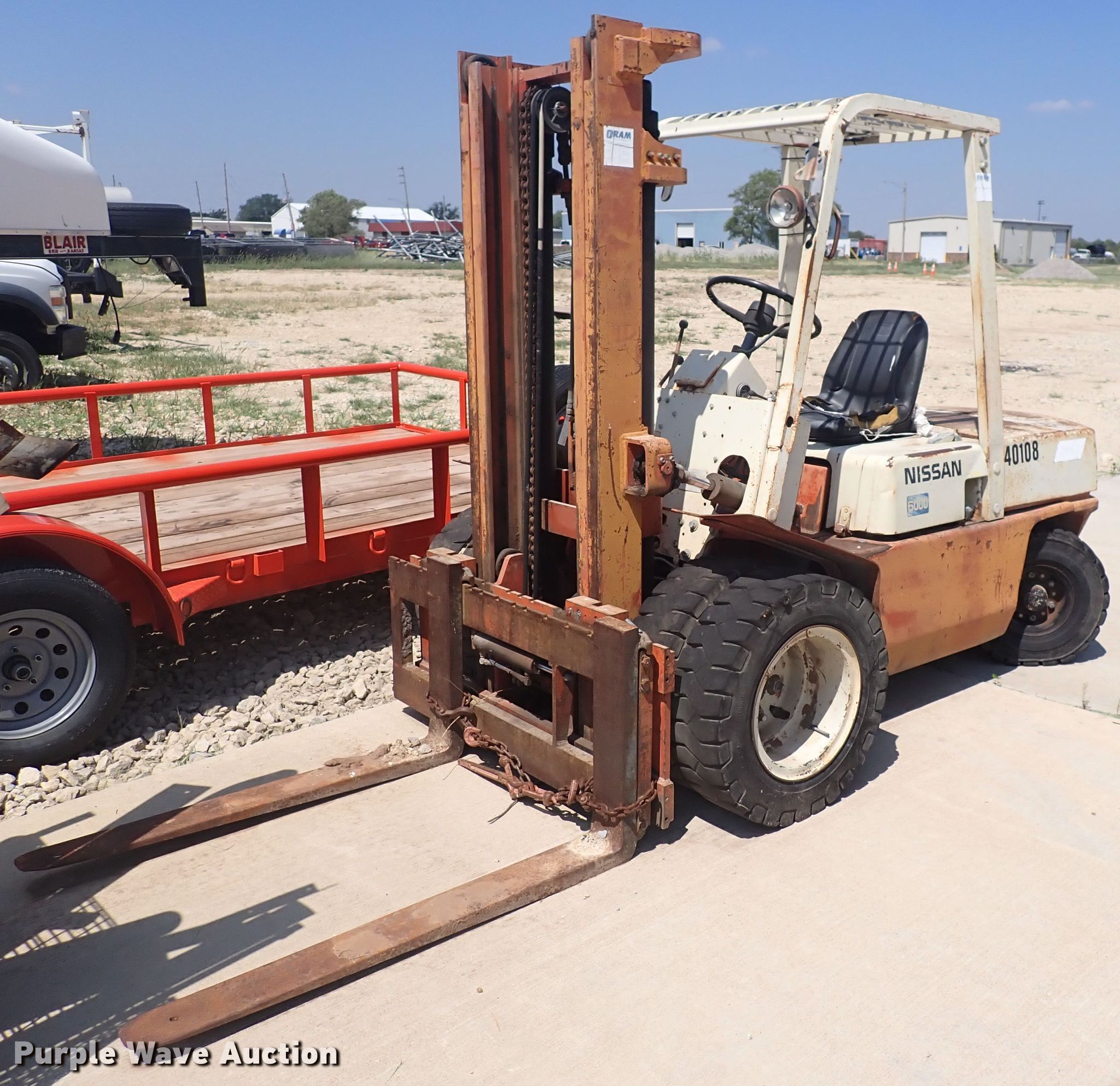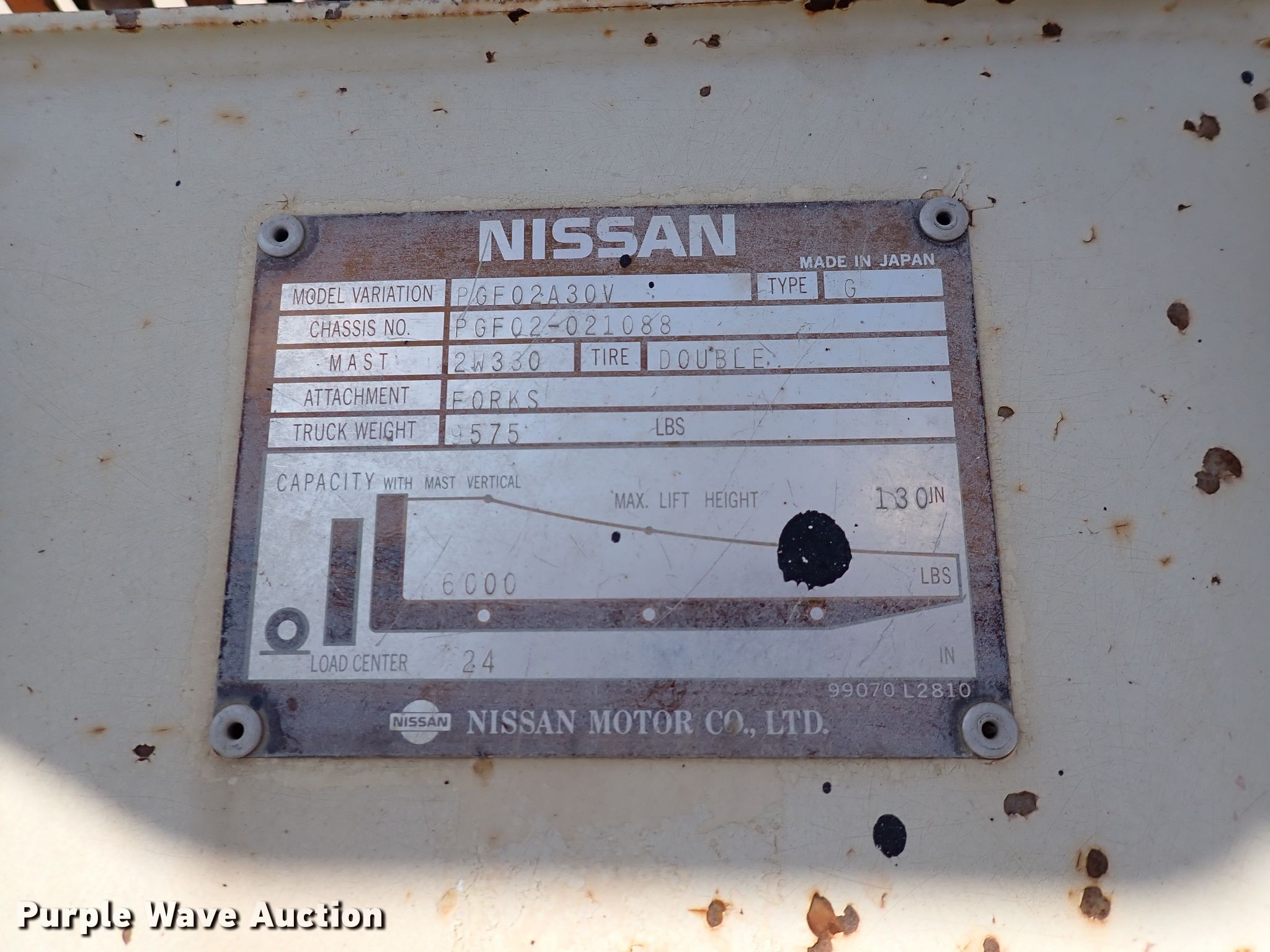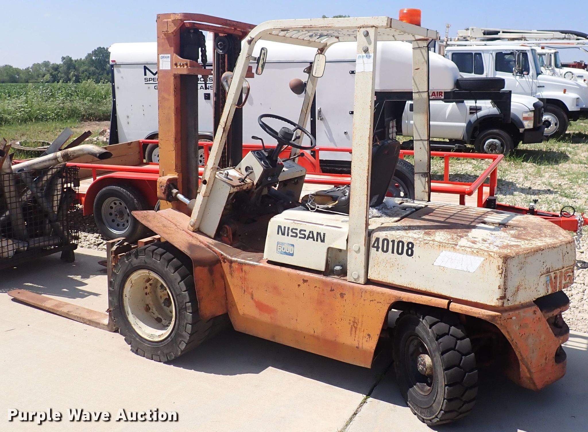 Nissan 6000 forklift. 2,257 hours on meter, Serial: PGF02-021088. Engine Nissan, Cylinders: 4, Fuel type: Gas. Transmission Powershift. Operators station OROPS. Operational Maximum lift capacity: 6,000 lbs, Maximum lift height: 130", Mast tilt, Fork length: 48". Tires Front: 29x8-15, Rear: 6.50x10. Notes Transmission issues. Mayer Services, LLC. 831 E Industrial St. Goddard, KS 67052
