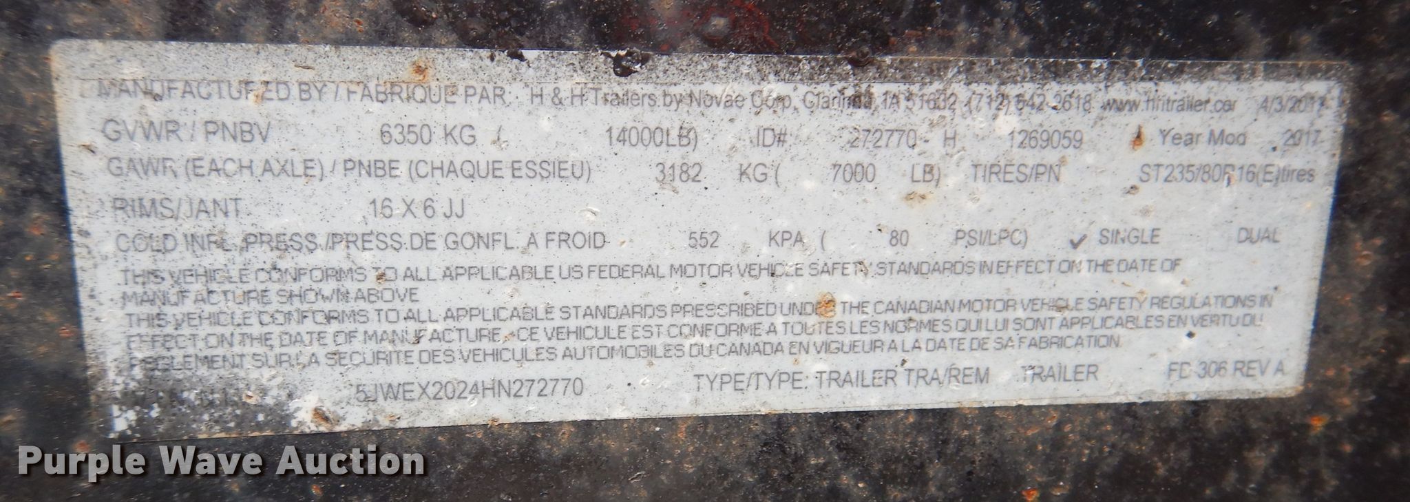 2017 H&H tilt deck utility trailer. Dimensions. Overall: 25' 6" L x 102" W, Deck: 20' L x 82" W, Deck height: 26". Operational Deck type: Wood. Chassis Ball hitch: 2 5/16", Landing gear: Single, Suspension: Spring, Brakes: Electric, Axles: Tandem, GVWR: 14,000 lbs, GAWR: 7,000 lbs. Tires Steel wheels, Size: ST235/80R16. Transfer of ownership documentation will be a bill of sale. 5JWEX2024HN272770. AgriVision Equipment Group. 58668 190th St. Pacific Junction, IA 51561