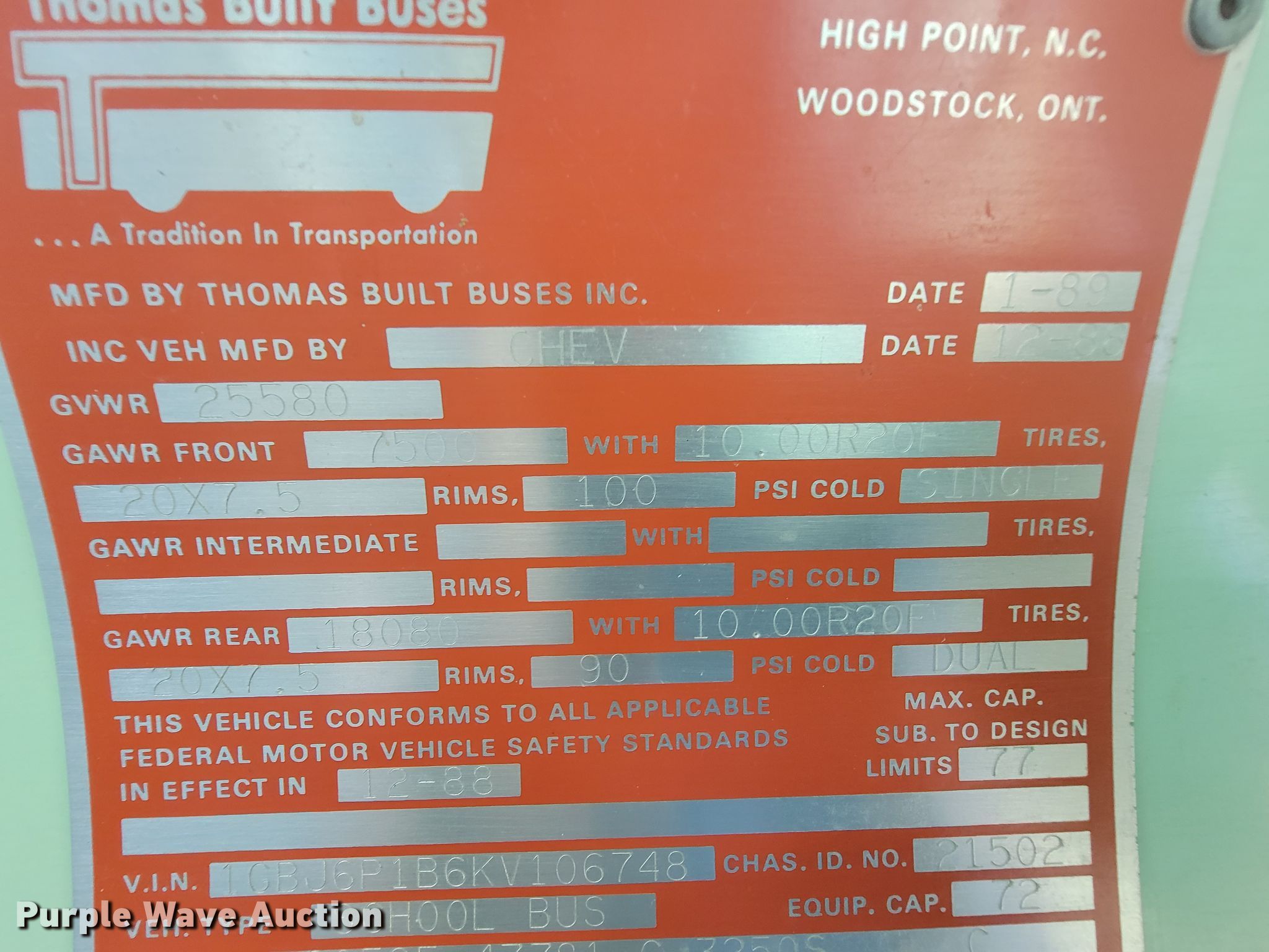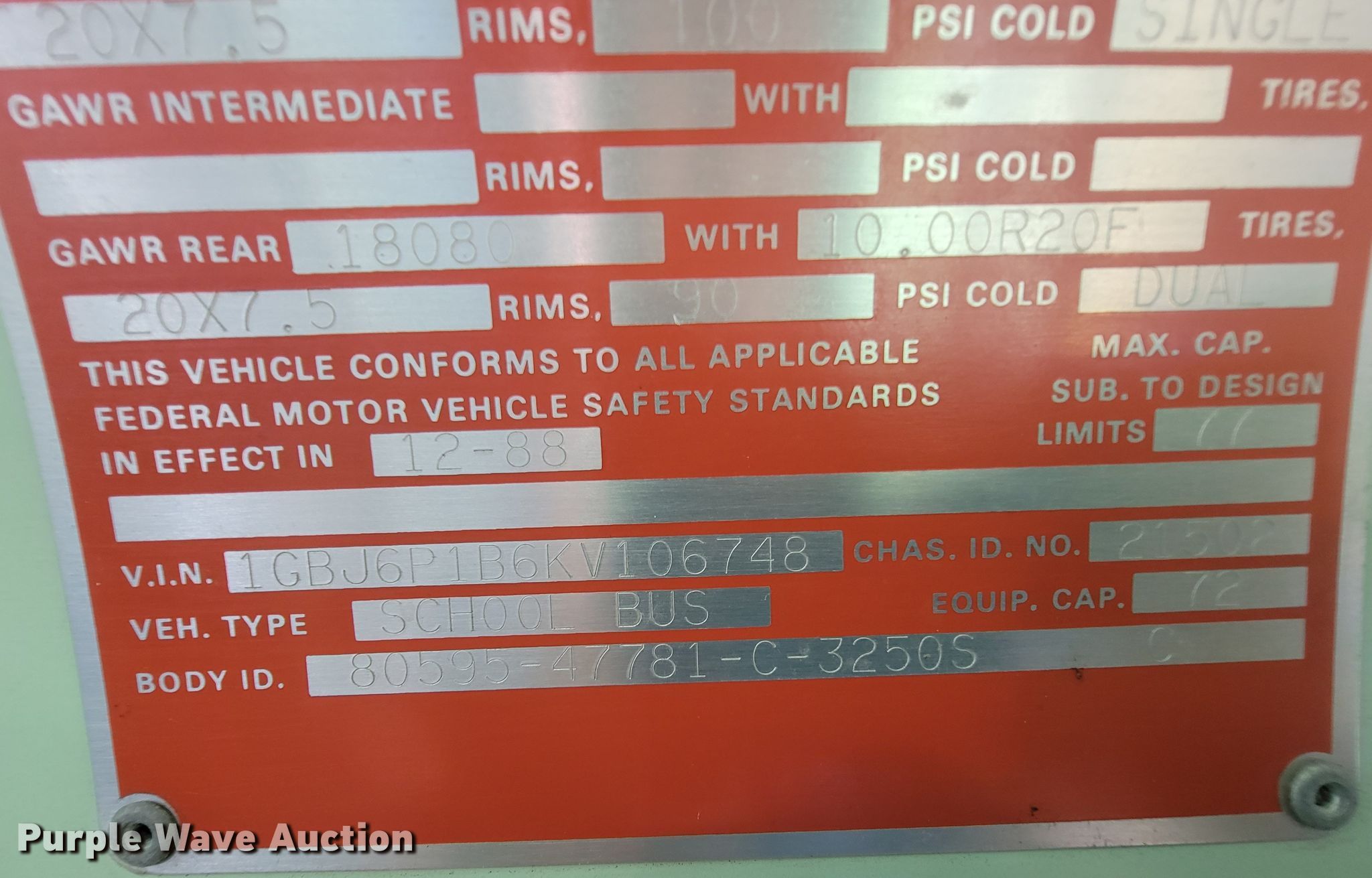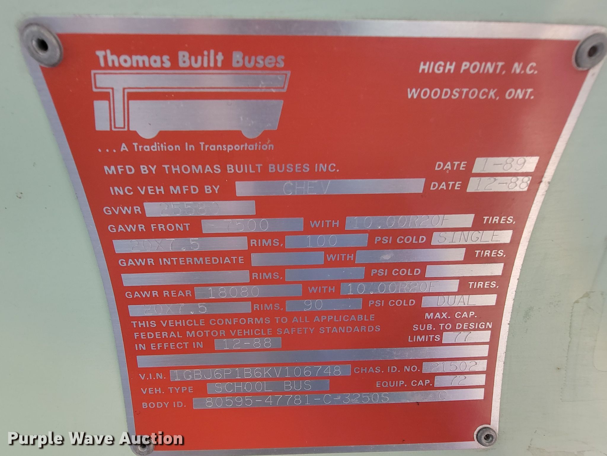 1989 Chevrolet B6P042 school bus. 9,927 miles on odometer. Engine Displacement: 6.0L, Cylinders: 8, Fuel type: Gas. Transmission Automatic. Chassis Axles: Single, Suspension: Spring, Brakes: Hydraulic, GVWR: 25,580 lbs, Wheelbase: 274". Interior Heat, Passengers: 77. Tires Front: 10R22.5, Rear: 9.00R20. Notes Power steering leaks. Missouri title. 1GBJ6P1B6KV106748. 309 Praterhomestead Rd. Macks Creek, MO 65786