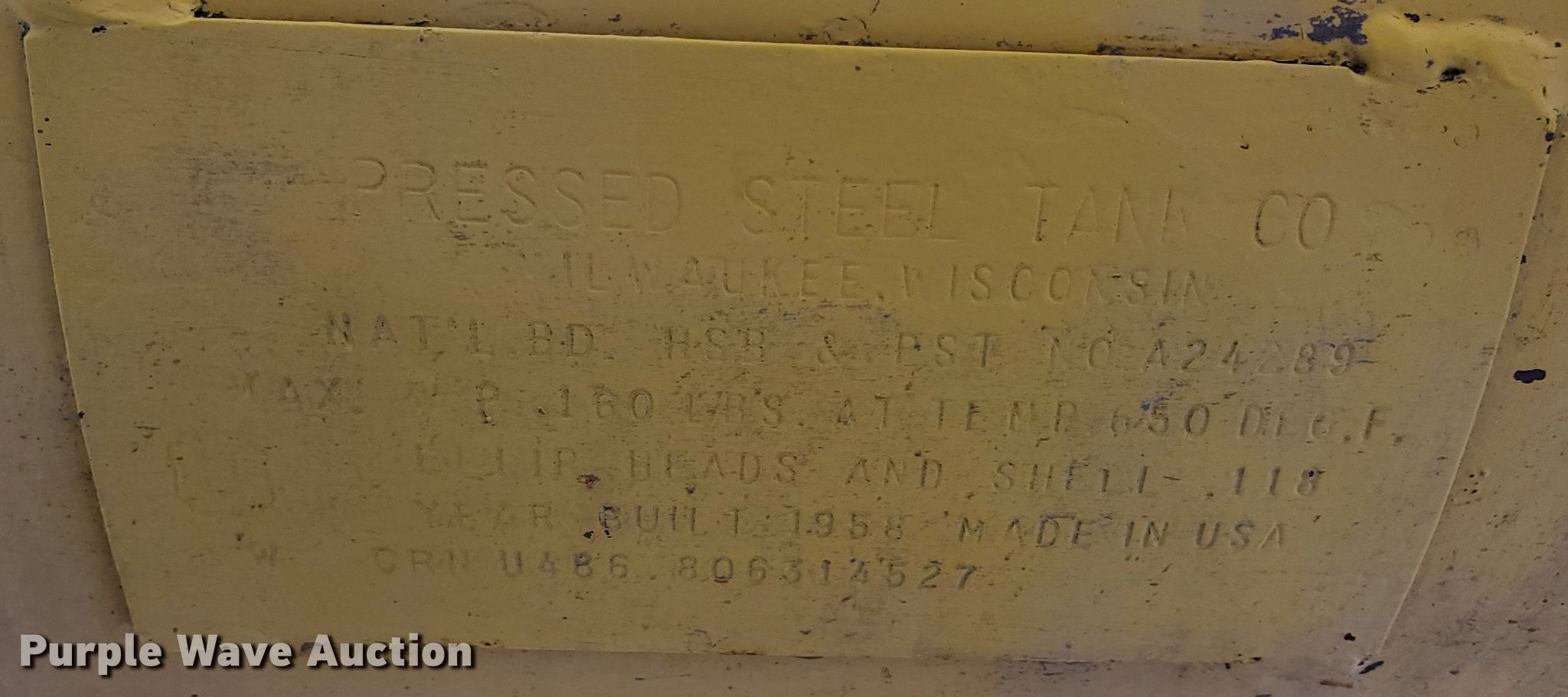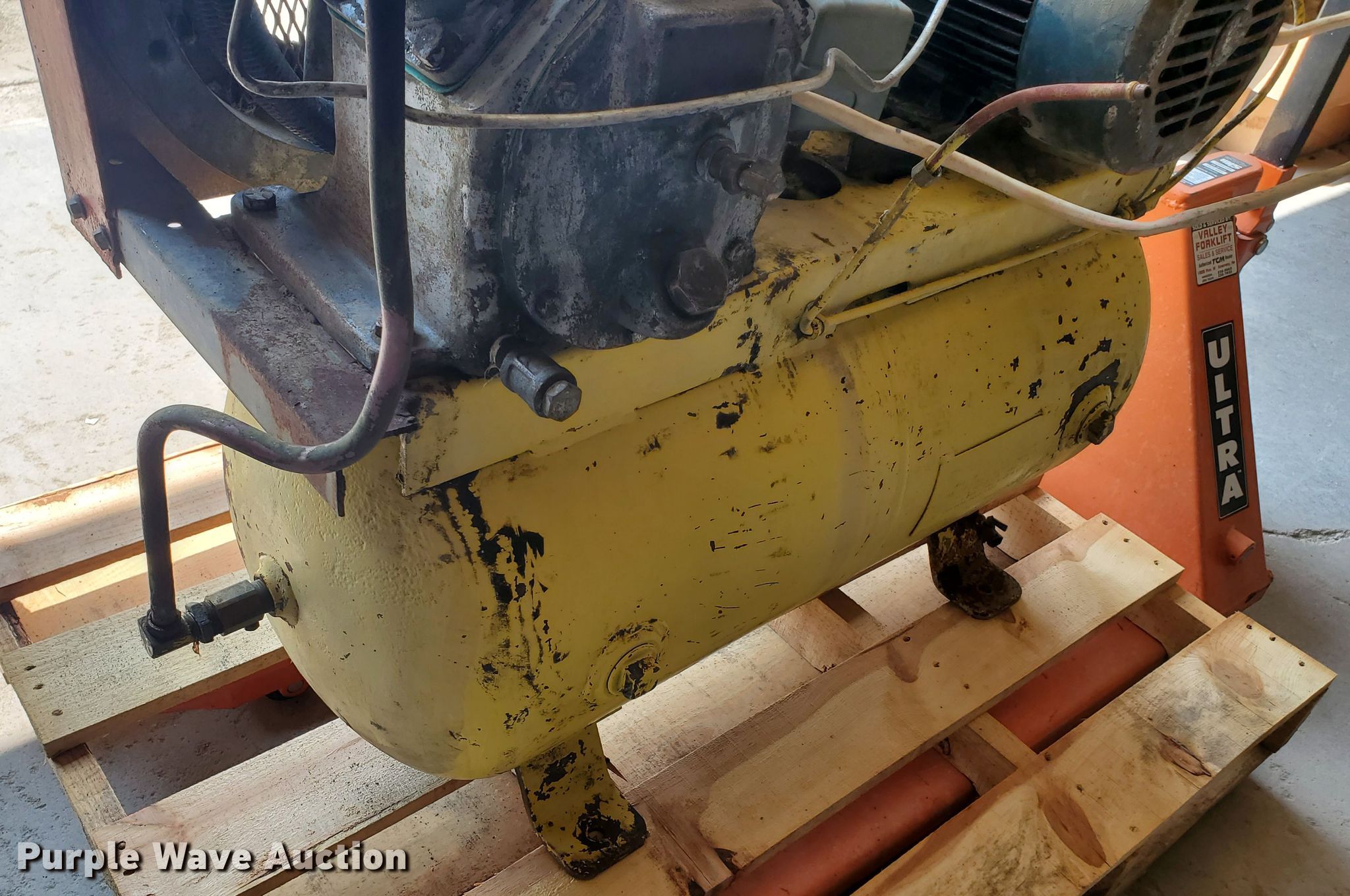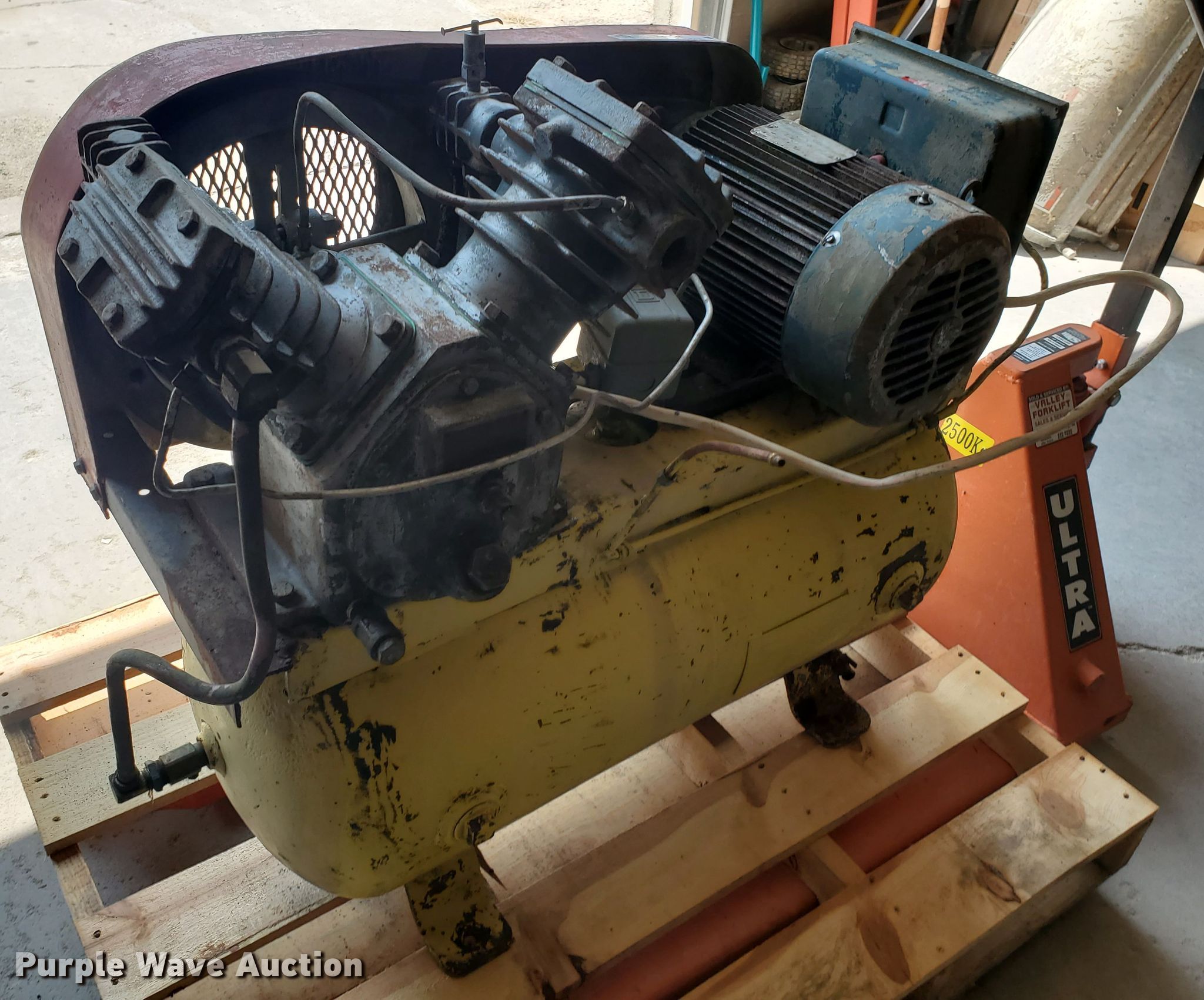 Purple Wave is selling a used Air Compressor in Kansas. This item is a Pressed Steel Company air compressor with the following: HP: 5, Volts: 230, Phase: Single