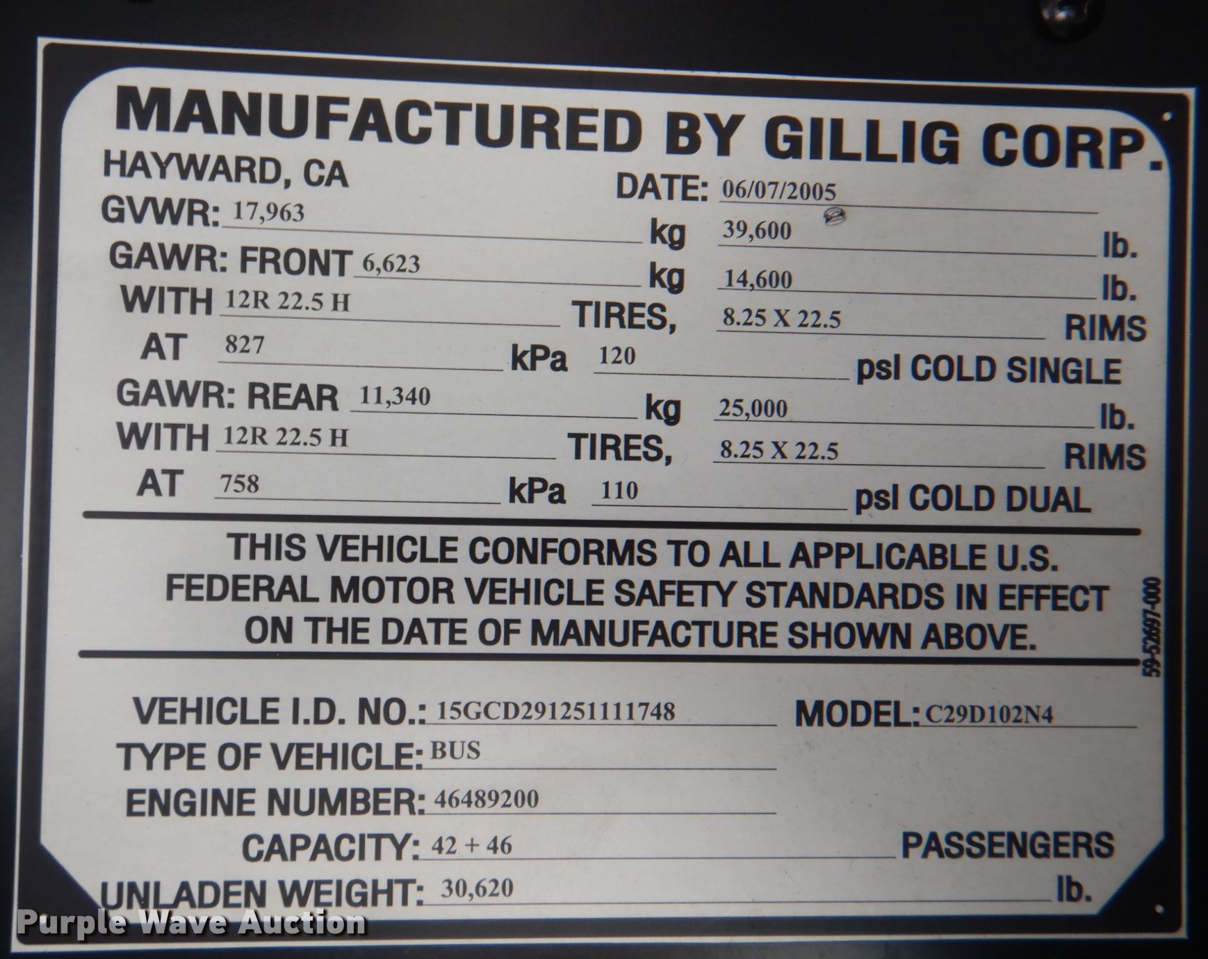 2005 Gillig C29D102N4 shuttle bus. Unknown miles on odometer. Engine Cummins, Cylinders: 6, Fuel type: Diesel. Transmission Automatic. Chassis Axles: Single, Suspension: Air, Brakes: Air, GVWR: 17,963 lbs. Interior Heat, Heated mirrors, Electric passenger sliding door, Seats Adult seats: 42, Wheelchair lift. Tires Size: 315/80R22.5. Missouri title. Mileage has not been verified. Odometer discrepancy will be marked on the title. 15GCD291251111748. Doolittle Trailer MFG. 2455 Doolittle Dr. Holts Summit, MO 65043