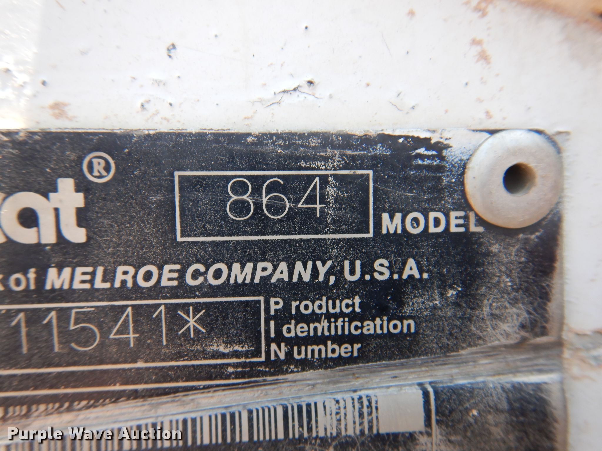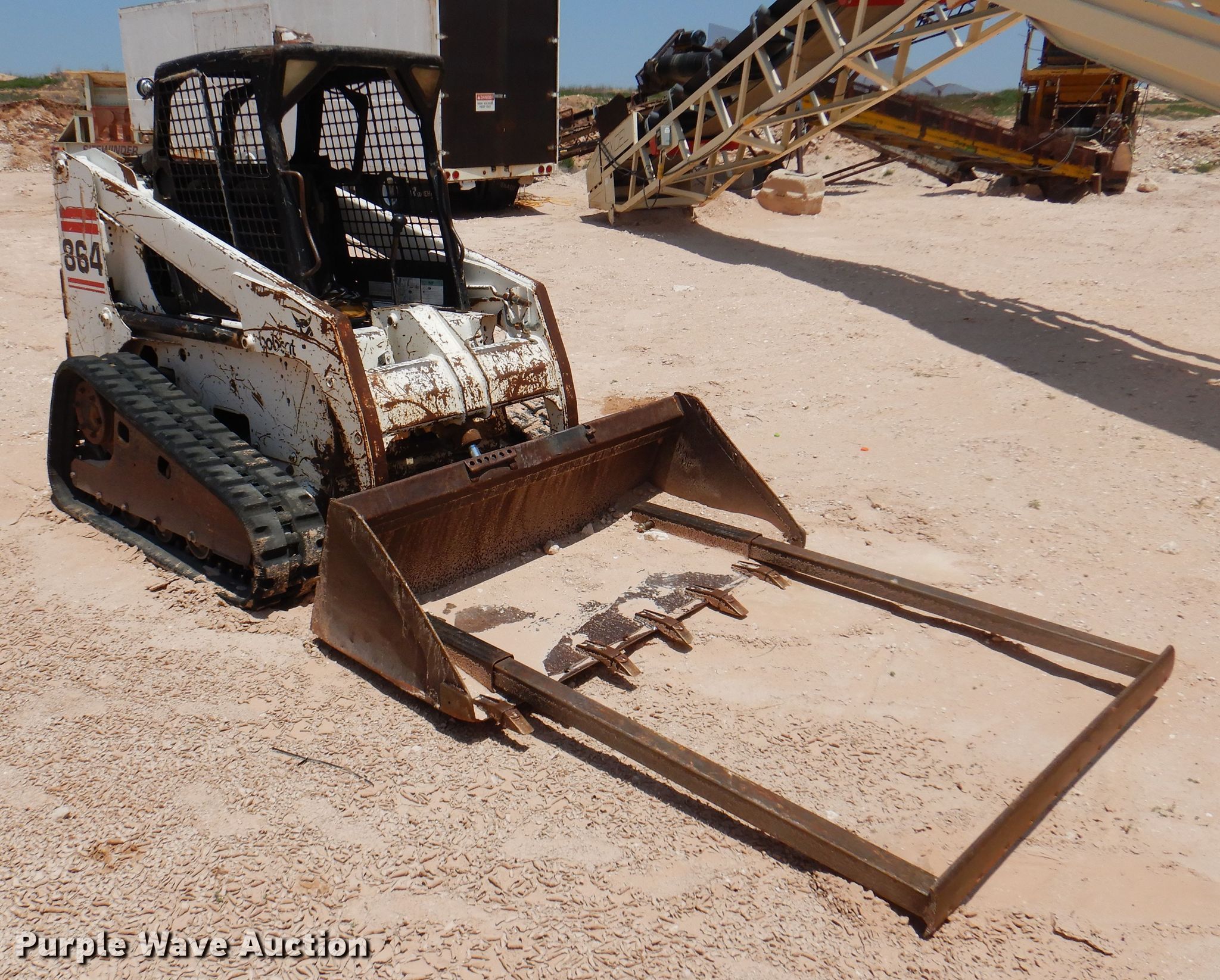 2000 Bobcat 864 tracked skid steer loader. 3,730 hours on meter, Serial: 518911541. Engine Cylinders: 4, Fuel type: Diesel. Transmission Hydrostatic. Operators station OROPS, Bucket control: Foot. Operational Auxiliary hydraulics, Quick coupler: Manual, Bucket Width: 72", Teeth: Bolt on. Tracks Width: 13". Notes Wiring issues, Unknown operating condition. Stephens Const & Ready Mix, Inc.. 2219 W 7th St. Clovis, NM 88101