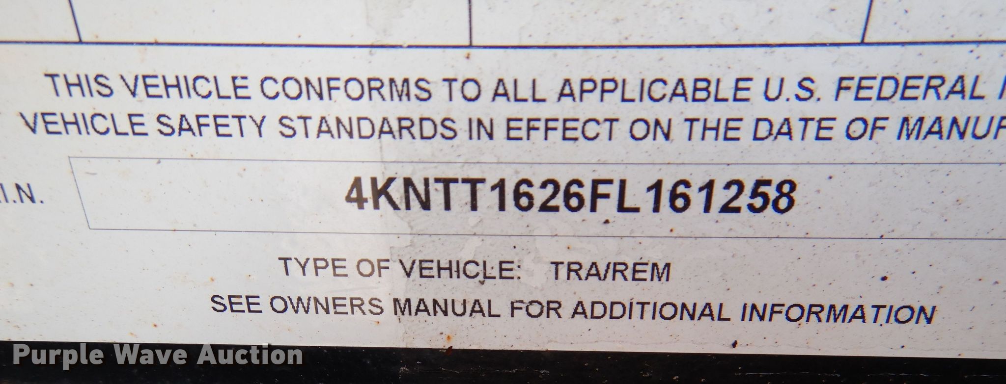 2015 Towmaster T-14TD tilt deck equipment trailer. Unit #: 418. Dimensions Overall: 27' L x 102" W, Deck: 22' L x 82" W. Operational Deck type: Wood. Chassis Hitch: Pintle, Landing gear: Single, Suspension: Spring, Brakes: Electric, Axles: Tandem, GVWR: 13,740 lbs, GAWR: 7,200 lbs. Tires Steel wheels, Size: 215/75R17.5. Kansas title. 4KNTT1626FL161258. M CON, LLC. 1004 Vernon Rd. Wathena, KS 66090