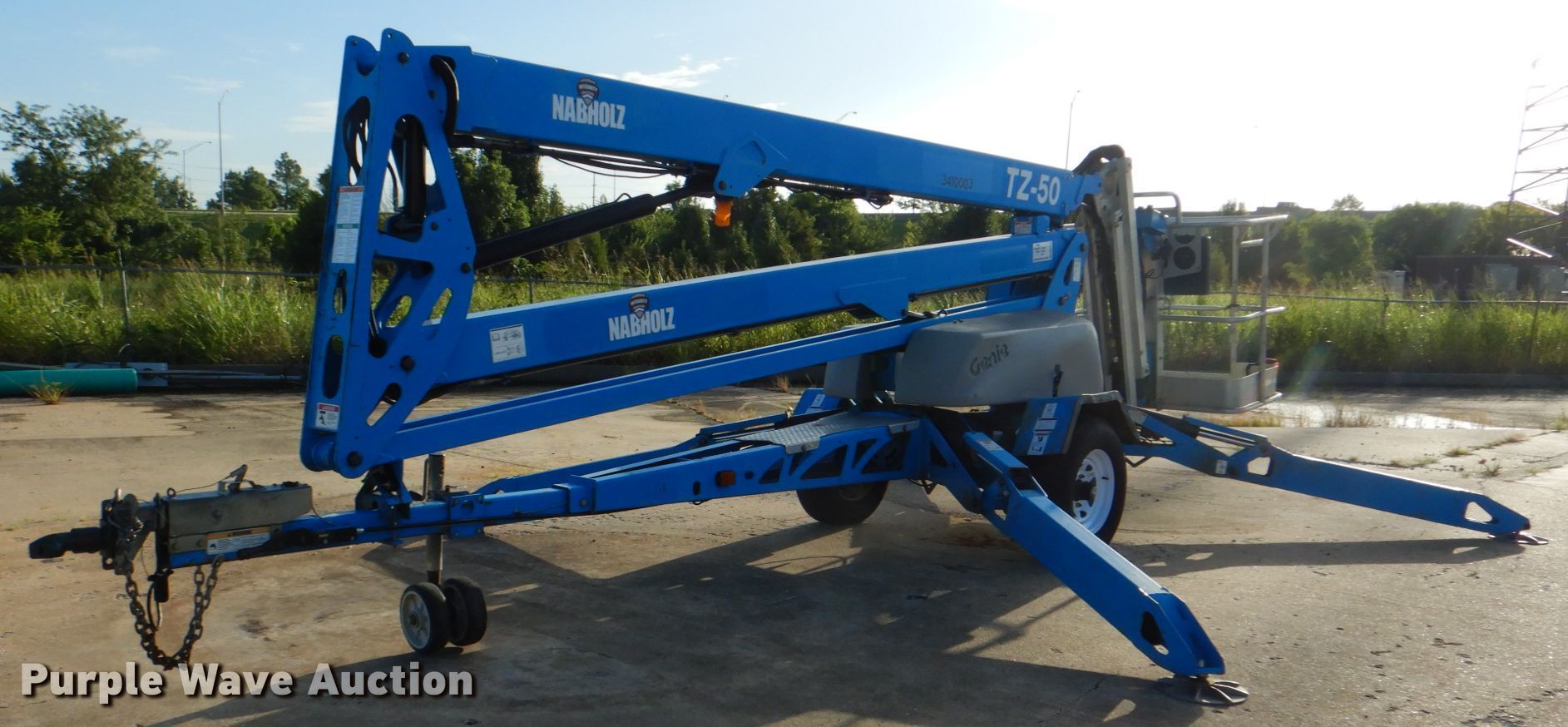 2013 Genie TZ-50DC boom lift. 198 hours on meter, Serial: TZ5013-479. Engine Honda. Electric Motor Genie 149-01-4007, HP: 1.7, Volts: 24. Operational Tow behind, Maximum lift capacity: 500 lbs, Maximum reach length: 29', Maximum lift height: 50', Hydraulic outriggers, Platform: 4" L x 30" W, Controls: Platform, Ground, Ball hitch: 2". Tires Tire size: 225/75R15. Transfer of ownership documentation will be a bill of sale. TZ5013479. 10319 E 54th St S. Tulsa, OK 74146