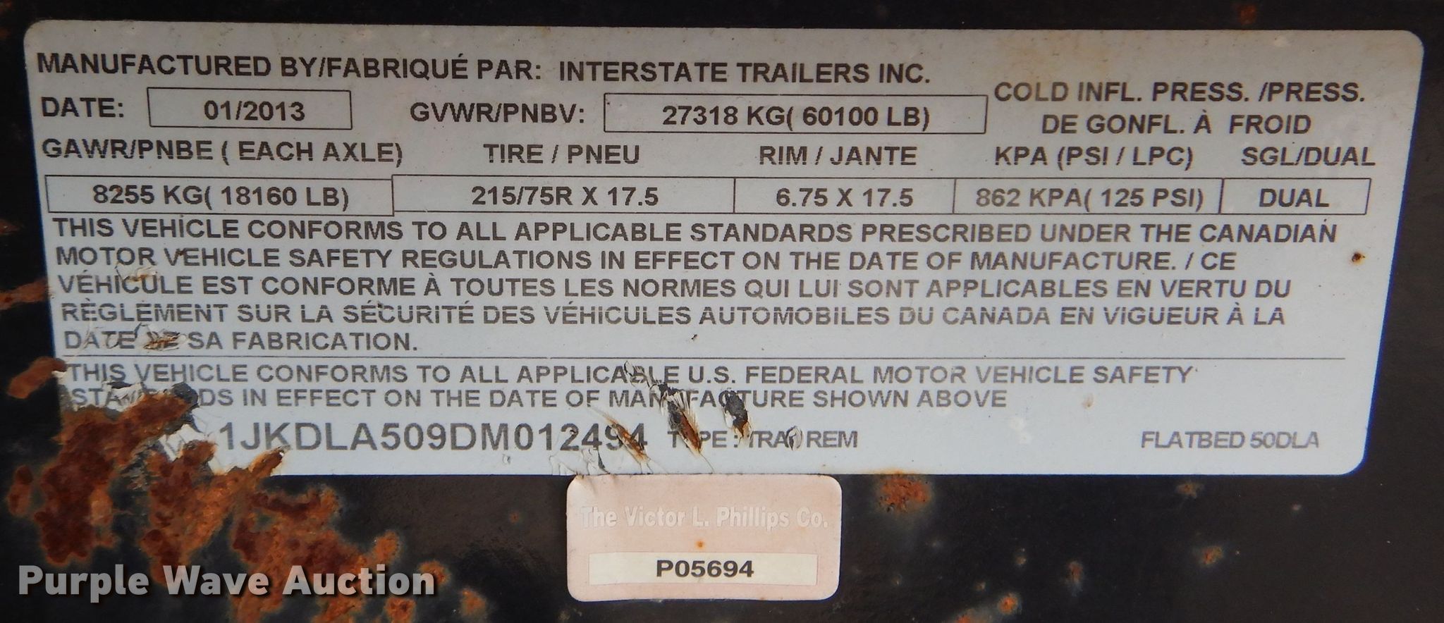 2013 Interstate 50DLA equipment trailer. Dimensions. Overall: 35' L x 8' 6" W, Deck: 24' L x 8' 6" W, Tail length: 5', Ramps: Manual Length: 5'. Operational Deck type: Wood. Chassis Hitch: Pintle, Landing gear: Single, Two speed, Suspension: Spring, Brakes: Air, Axles: Triple, GVWR: 60,100 lbs, GAWR: 18,160 lbs. Tires Steel wheels, Size: 215/75R17.5. Kansas title. 1JKDLA509DM012494. Trinity Excavating & Construction Inc.. 313 W Elm St. Olathe, KS 66061