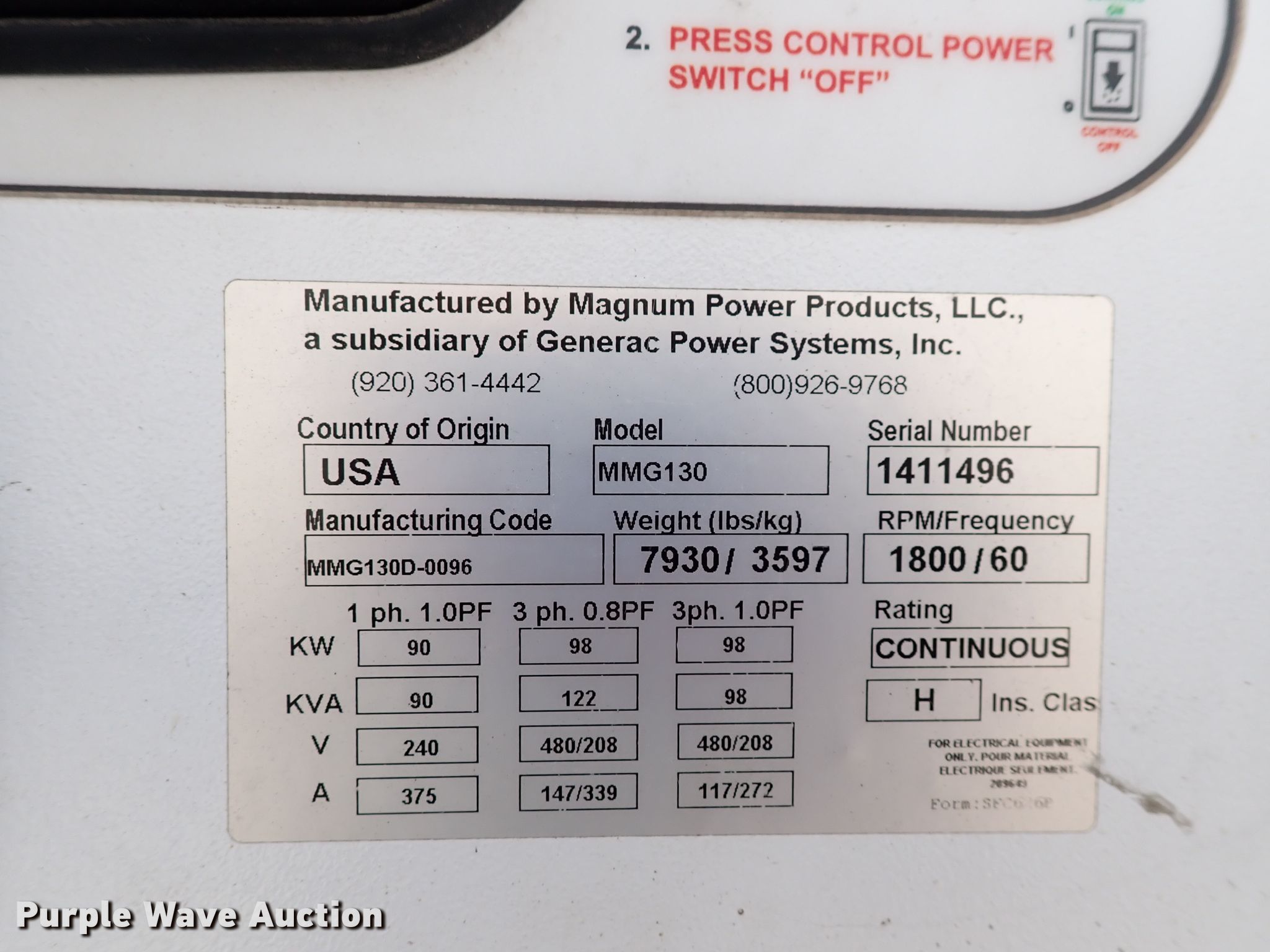 Purple Wave is selling a used Generator Set in Kansas. This item is a Magnum MMG130 generator with the following: 3,597 hours on meter, Serial: 1411496