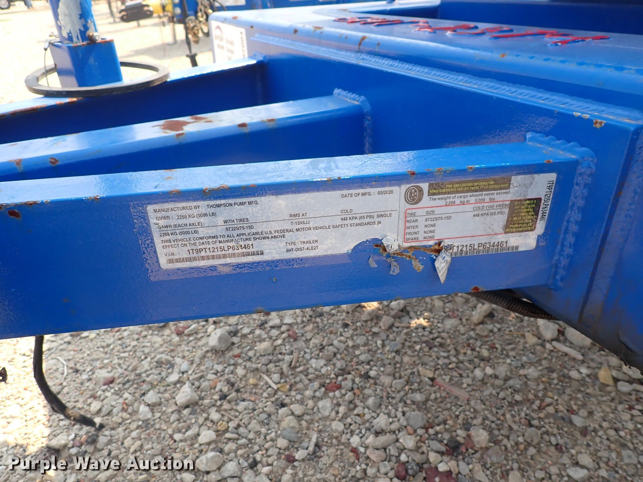 2020 Thompson 6HT-DIST-4LE2T pump. 237 hours on meter, Isuzu four cylinder diesel engine , 6" inlet/outlet, Serial: 6HT2374. Trailer Spring suspension , 2 5/16" ball hitch , 225/75D15 tires. Transfer of ownership documentation will be a bill of sale. 1T9PT1215LP634461. Hall Properties llc. Goddard, KS 67052