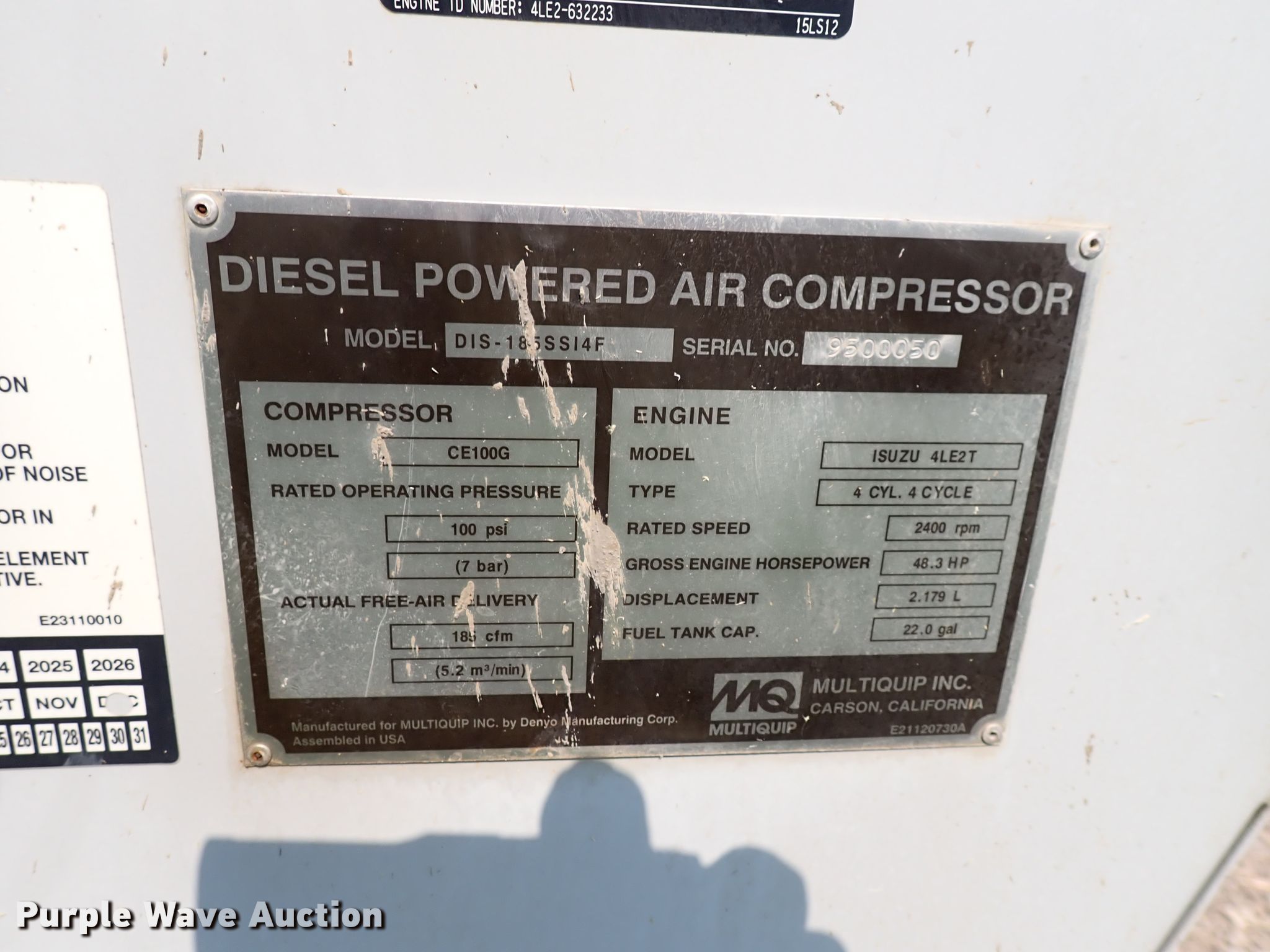 Multi Quip 185 air compressor. 1,152 hours on meter. Engine Isuzu 4LE2T, Displacement: 2.179L, Cylinders: 4, Fuel type: Diesel. Operational Air compressor Trailer mounted, Model: CE100G, CFM: 185. Trailer Ball hitch size: 2 5/16", Tire size: ST205/75D14. This is worksite support equipment and will not come with a title. Transfer of ownership documentation will be a bill of sale. 5SLBC1111FL018070. Hall Properties llc. Goddard, KS 67052