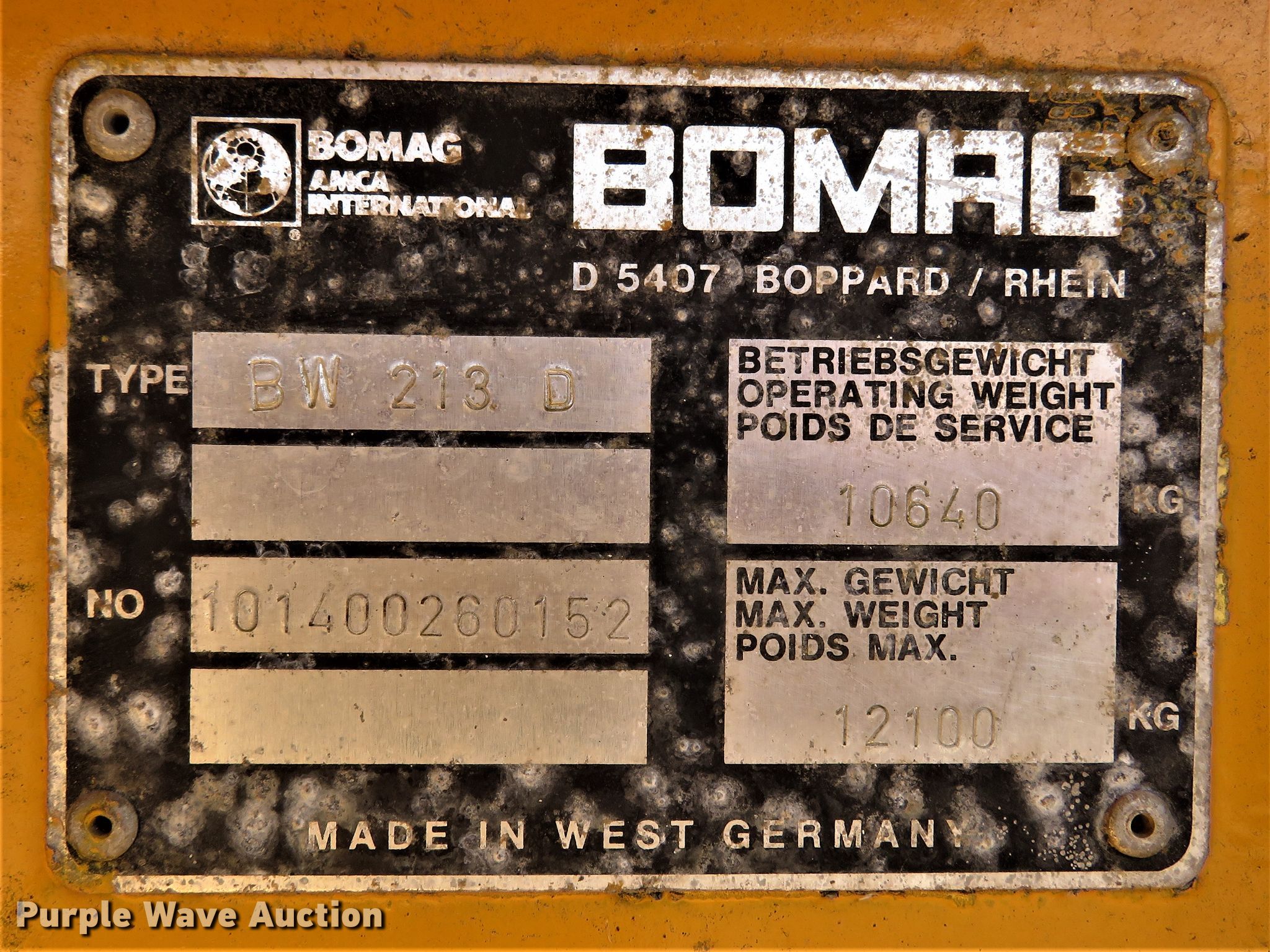 Purple Wave is selling a used Single Drum Roller Compactor in Illinois. This item is a 1989 Bomag BW213D single drum vibratory roller with the following: 3,742 hours on meter, Serial: 101400260152