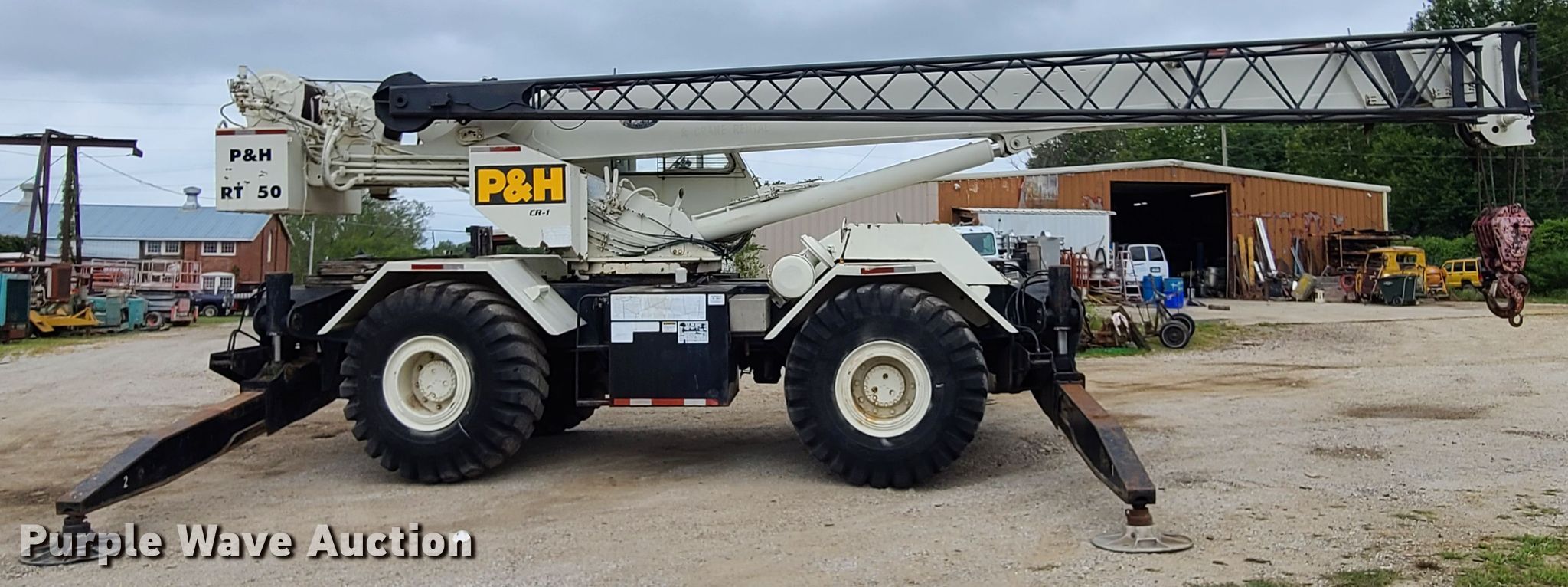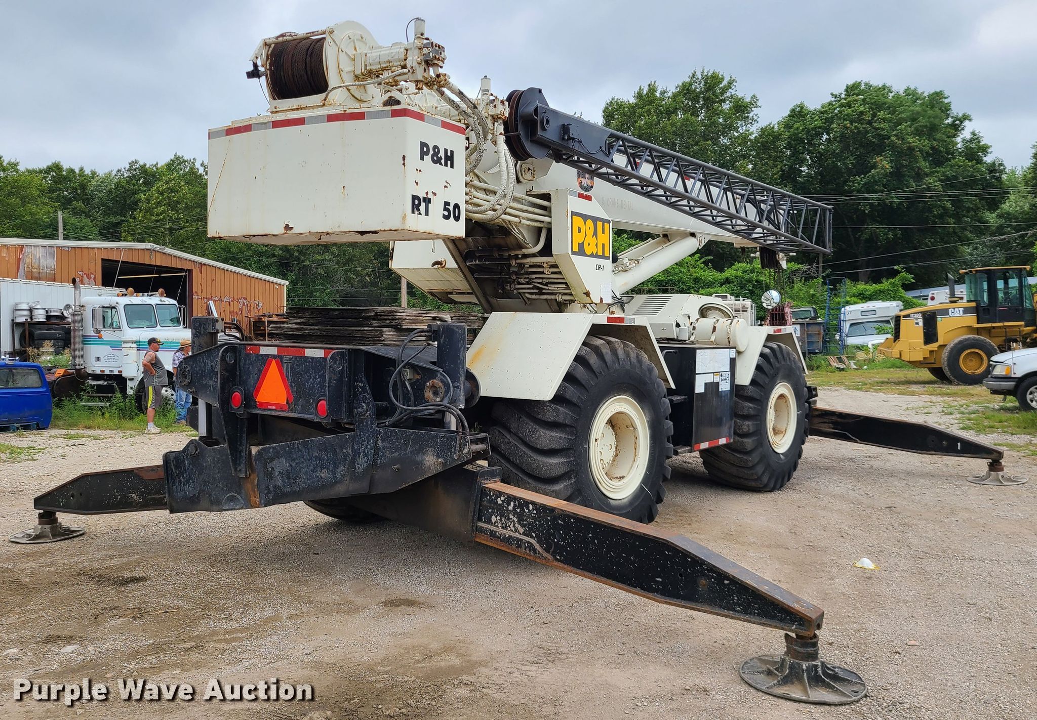 Purple Wave is selling a used Rough or All Terrain Crane in Missouri. This item is a P&H RT50 crane with the following: 3,046 hours on meter, Serial: 53738