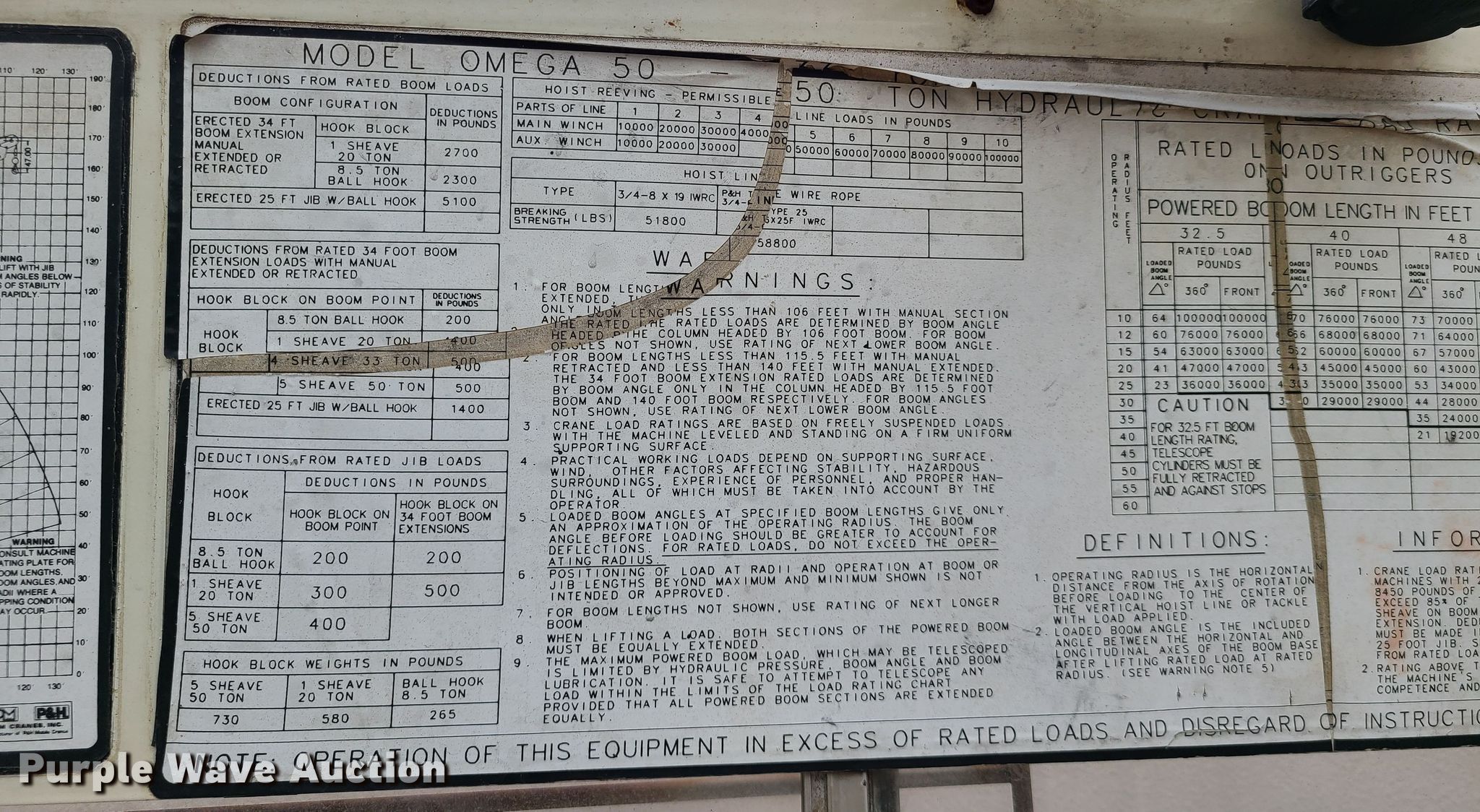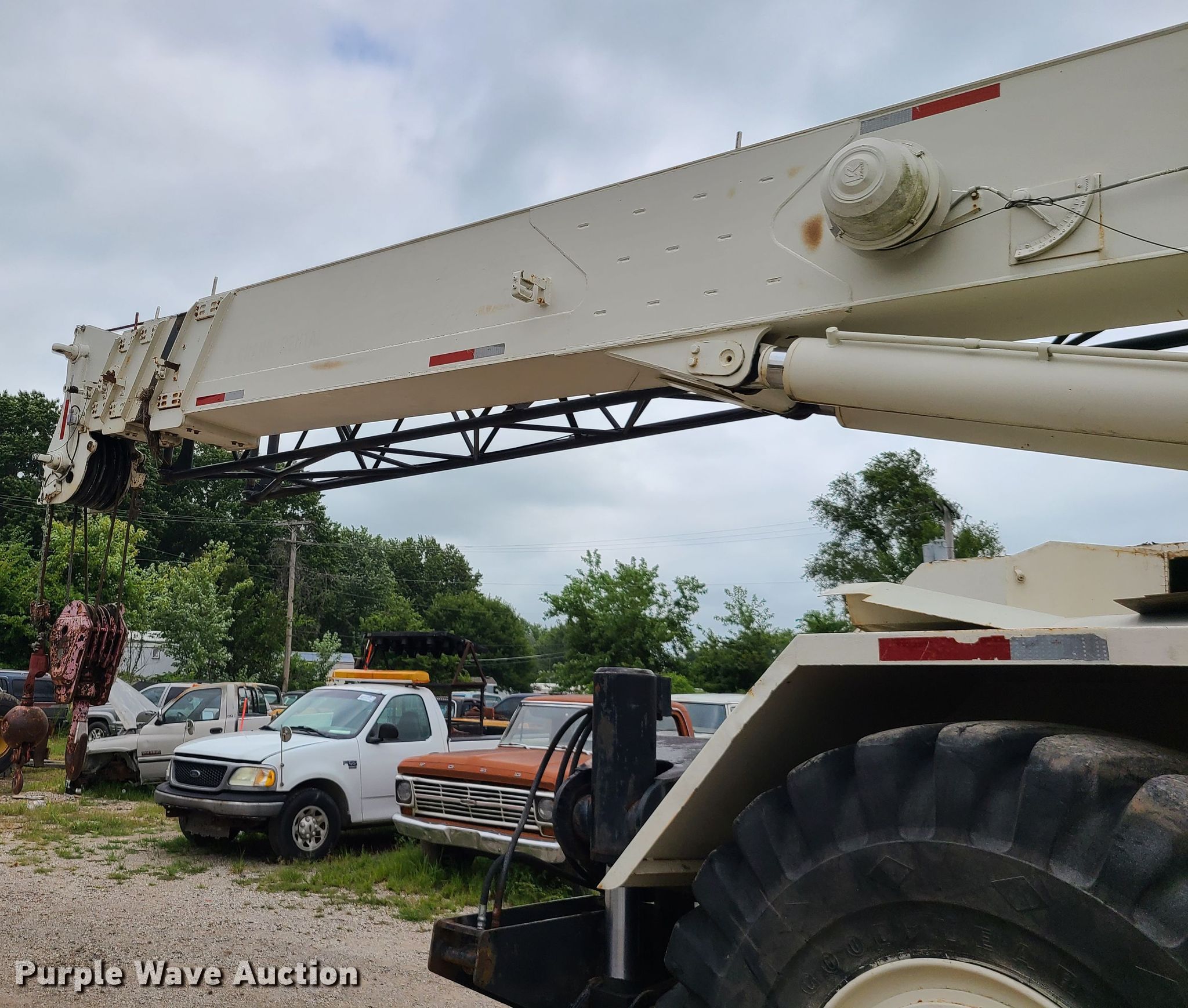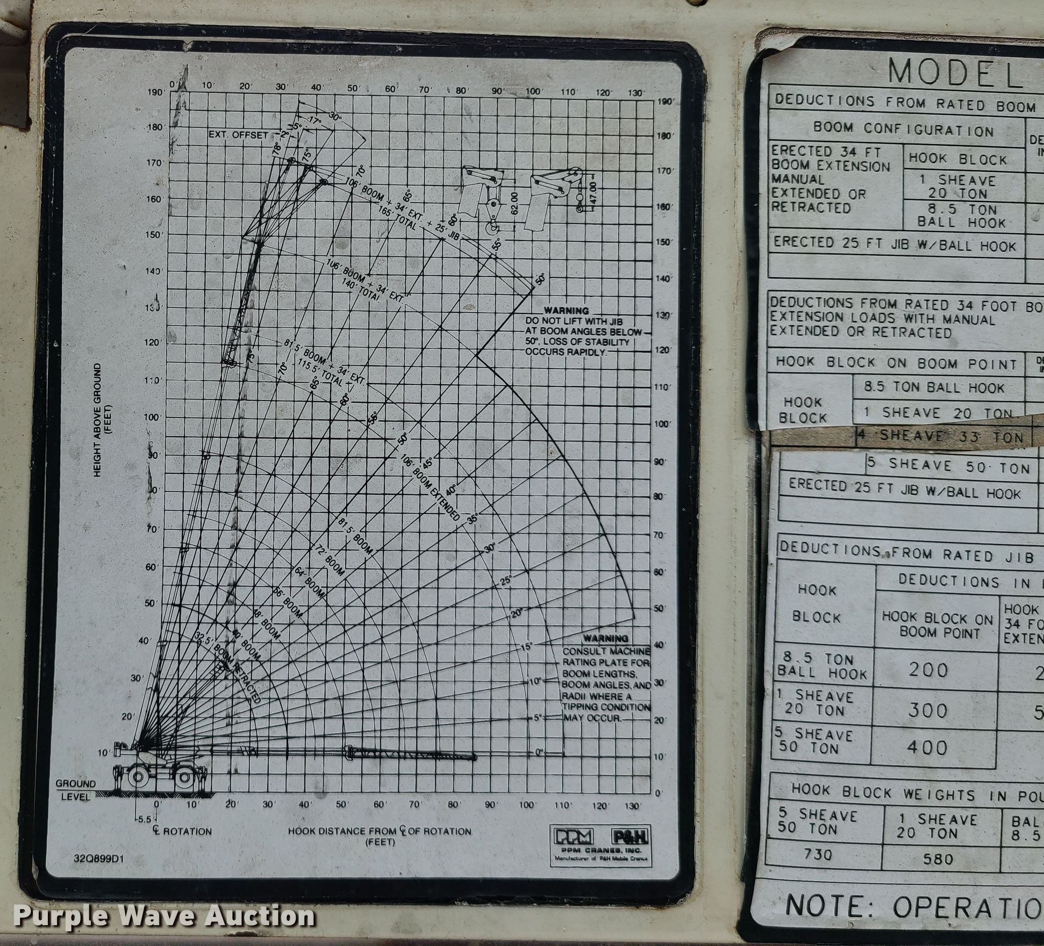 P&H RT50 crane. 3,046 hours on meter, Serial: 53738. Engine Detroit Diesel, Cylinders: 6, Fuel type: Diesel. Transmission Powershift, 3F - 3R. Operators station Enclosed cab, Heat. Operational Boom Telescopic, Boom length: 140', Sections: 3, Maximum lift capacity: 100,000 lbs, Jib: 34', Boom controls In-cab, Crane block Sheaves: 4, Crane ball & hook. Tires Size: 26.5-25. Shelton & Sons LLC. 1201 N Independence Street. Harrisonville, MO 64701