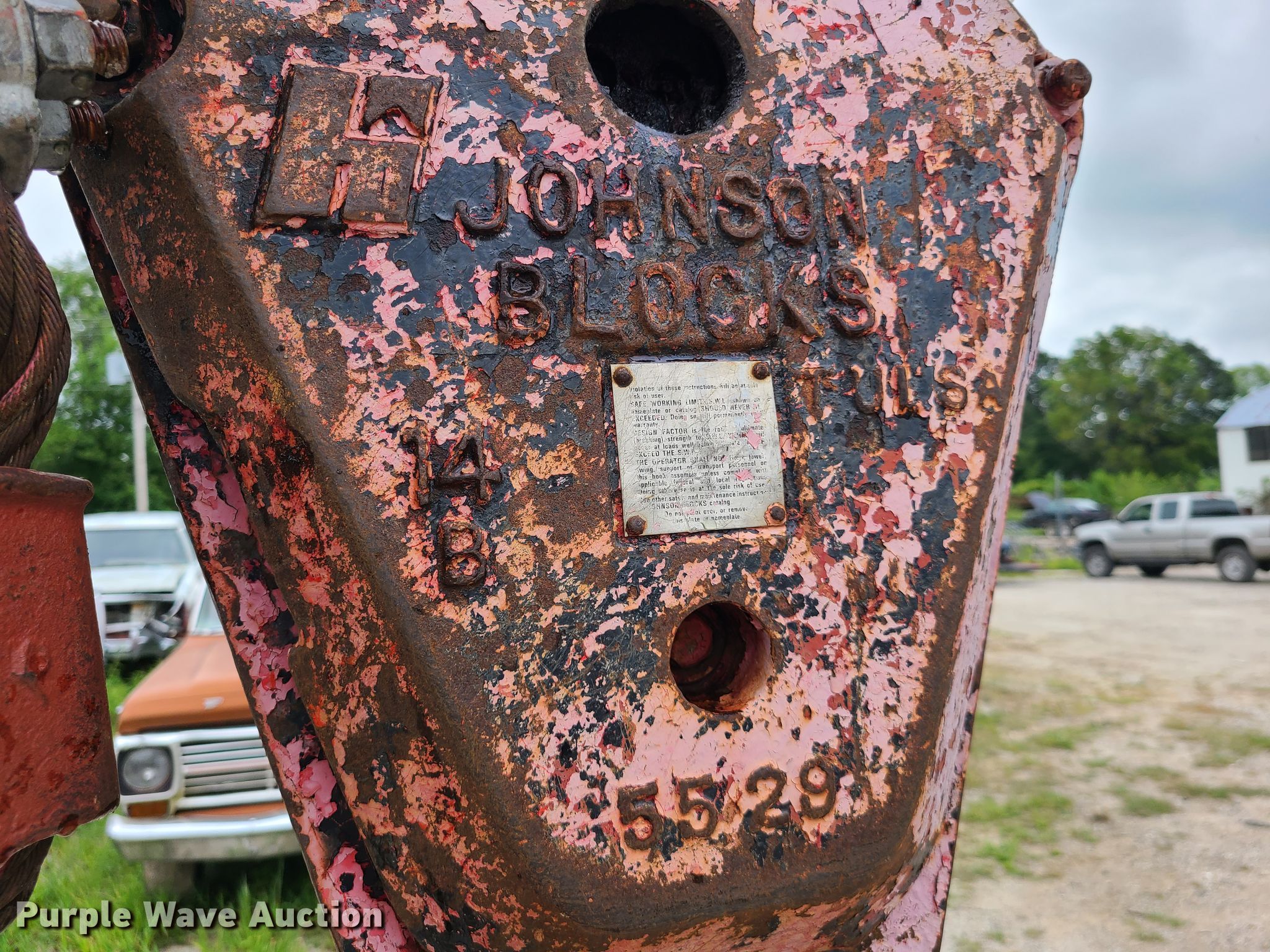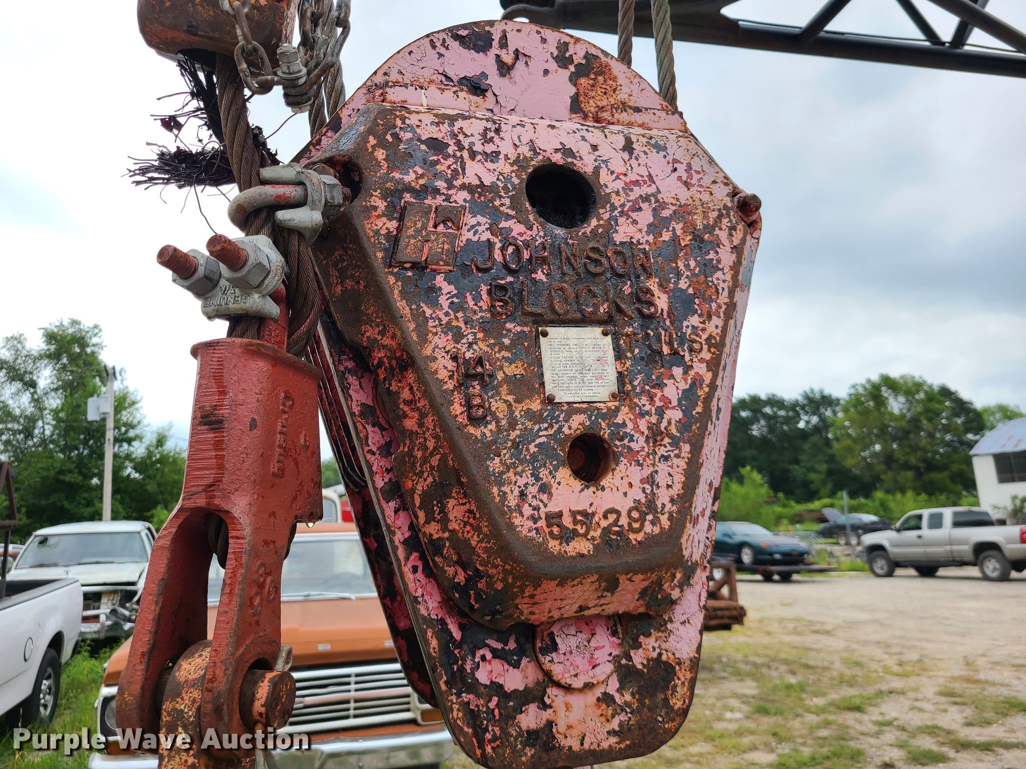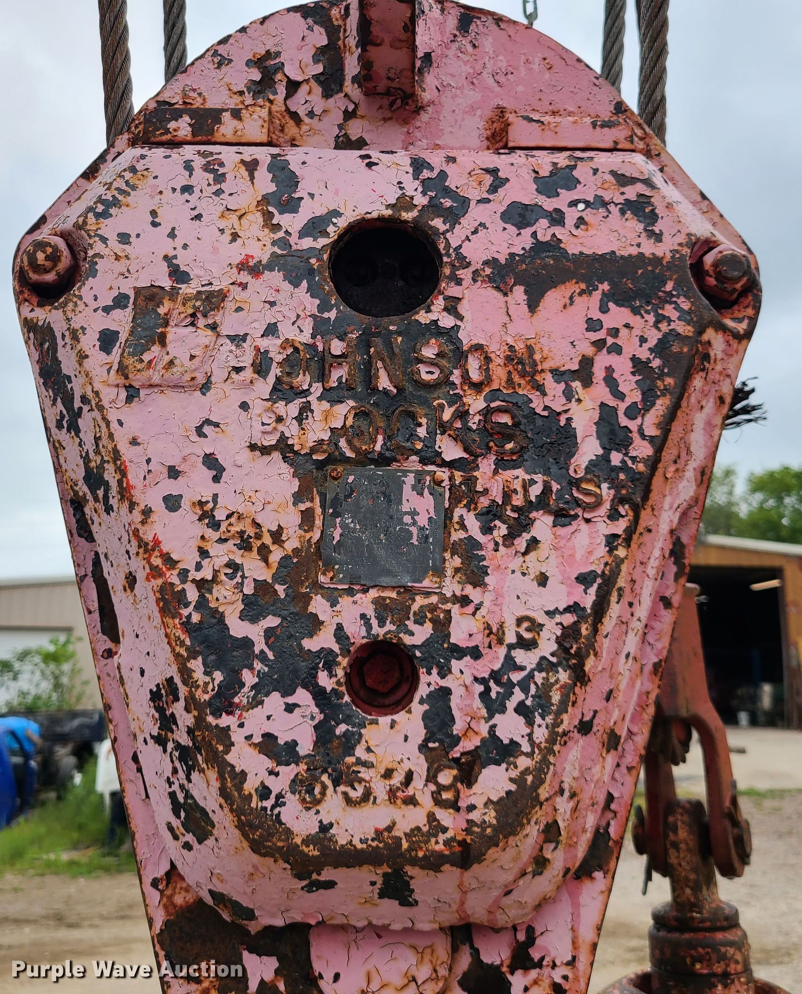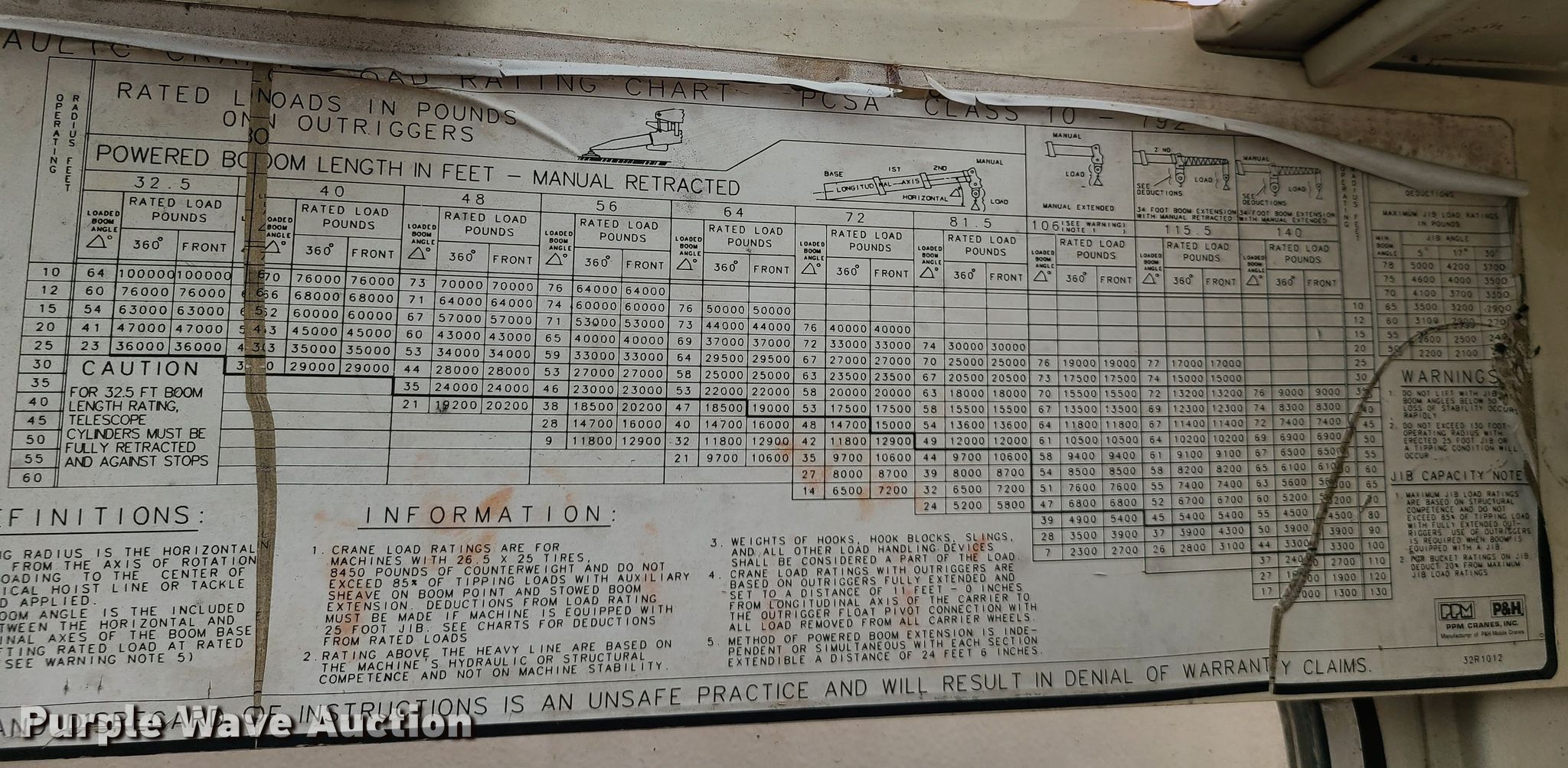 P&H RT50 crane. 3,046 hours on meter, Serial: 53738. Engine Detroit Diesel, Cylinders: 6, Fuel type: Diesel. Transmission Powershift, 3F - 3R. Operators station Enclosed cab, Heat. Operational Boom Telescopic, Boom length: 140', Sections: 3, Maximum lift capacity: 100,000 lbs, Jib: 34', Boom controls In-cab, Crane block Sheaves: 4, Crane ball & hook. Tires Size: 26.5-25. Shelton & Sons LLC. 1201 N Independence Street. Harrisonville, MO 64701