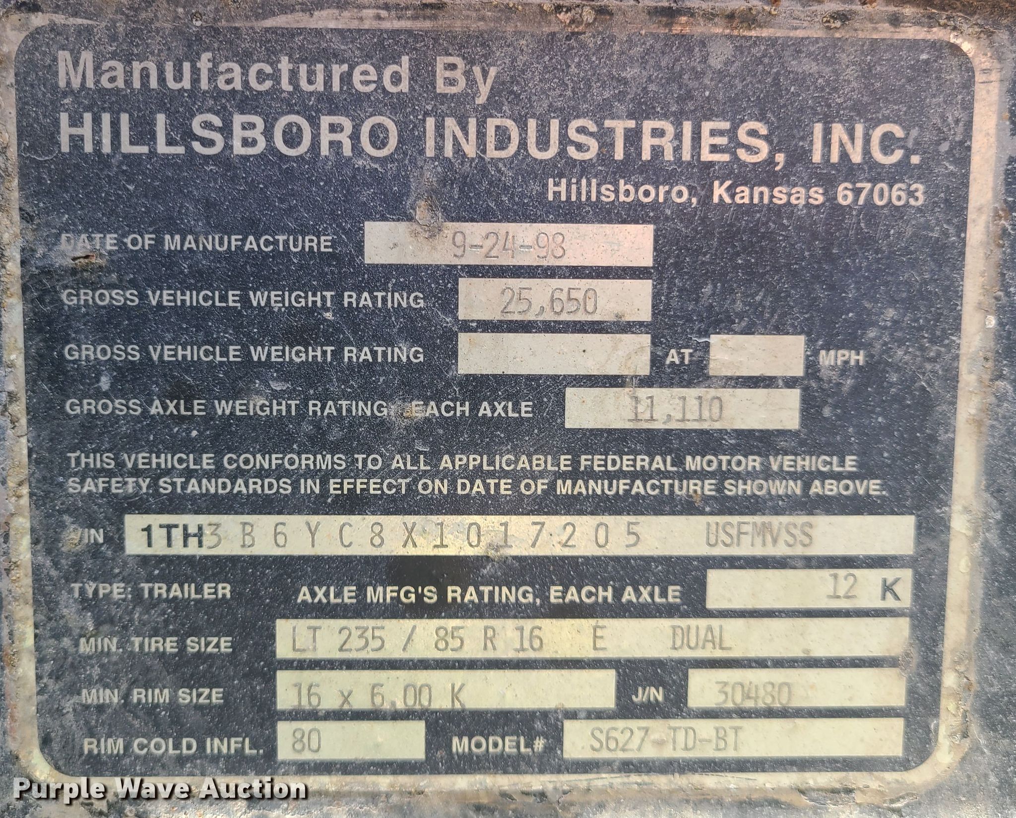 1999 Hillsboro Industries Inc. S627-TD-BT equipment trailer. Dimensions. Overall: 33' L x 100" W, Deck: 22' L x 100" W, Ramps: Manual Length: 54". Operational Deck type: Wood. Chassis Hitch: Pintle, Landing gear: Single, Suspension: Walking beam, Brakes: Electric, Axles: Tandem, GVWR: 25,650 lbs. Tires Size: 235/85R16. Missouri title. Title distribution may be delayed up to 30 days from verification of funds. 1TH3B6YC8X1017205. Summit Masonry, Inc... 2623 S 7 Hwy. Independence, MO 64057