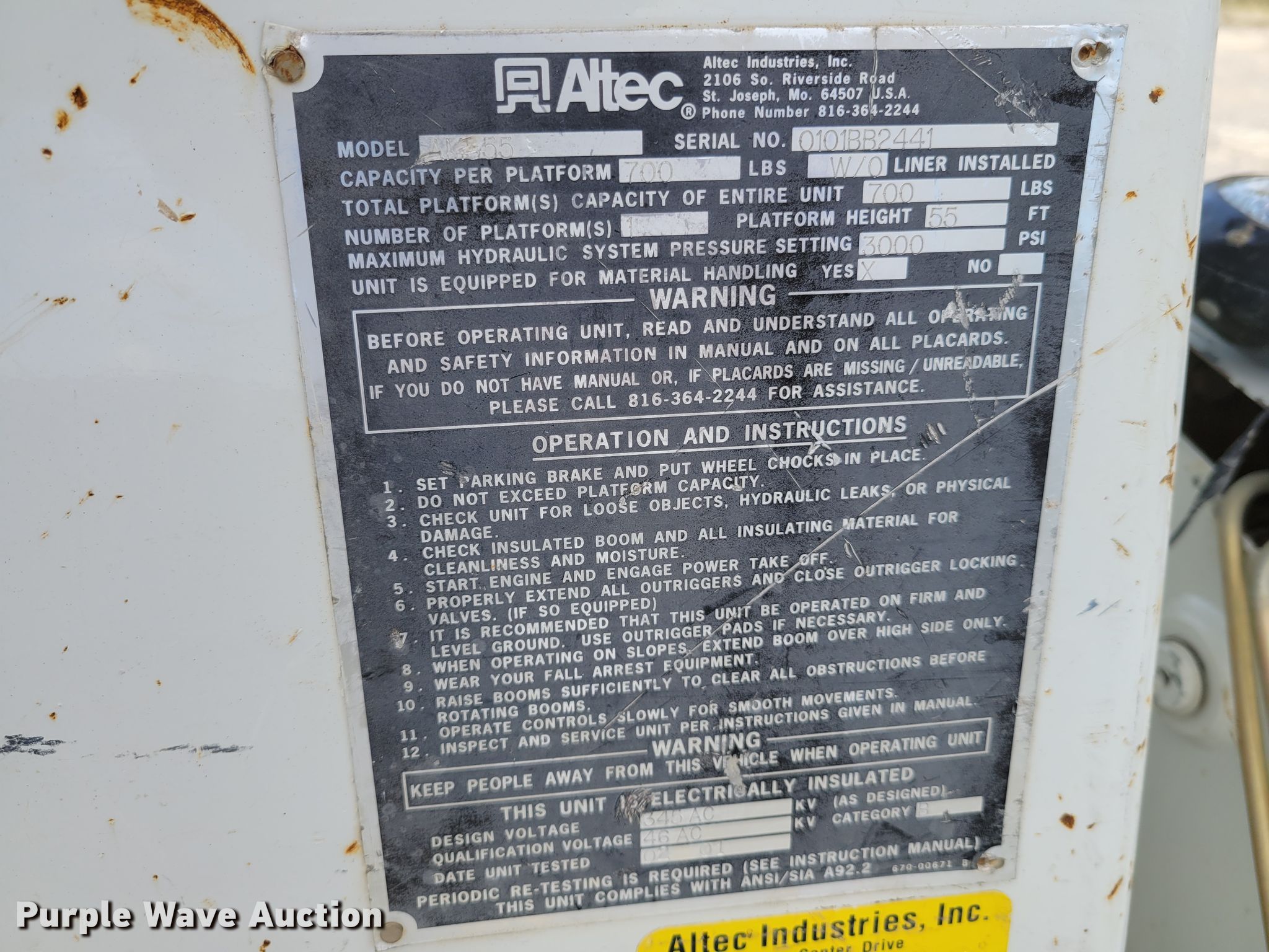 2001 Freightliner FL70 bucket truck. 154,340 miles on odometer, Engine hours: 5,952. Engine Caterpillar 3126, Displacement: 7.2L, Cylinders: 6, Fuel type: Diesel. Transmission Allison, Automatic. Chassis Axles: Single, Suspension: Air, Brakes: Air, PTO, GVWR: 33,000 lbs, Wheelbase: 188". Interior AC, Heat, Cruise control. Operational Bed Altec, 15' 6" L x 94" W, Boom Altec AM555, Maximum lift capacity: 700 lbs, Maximum lift height: 55', Boom type: Articulating, Insulated, Man basket, Boom controls Ground, Platform/ basket, Material handler. Tires Size: 11R22.5. Notes Dielectric test available upon email request to [email protected]. Illinois title. 1FVABTAK01HG77673. Wayne-White Counties Electric Coop. 1501 W Main St. Fairfield, IL 62837