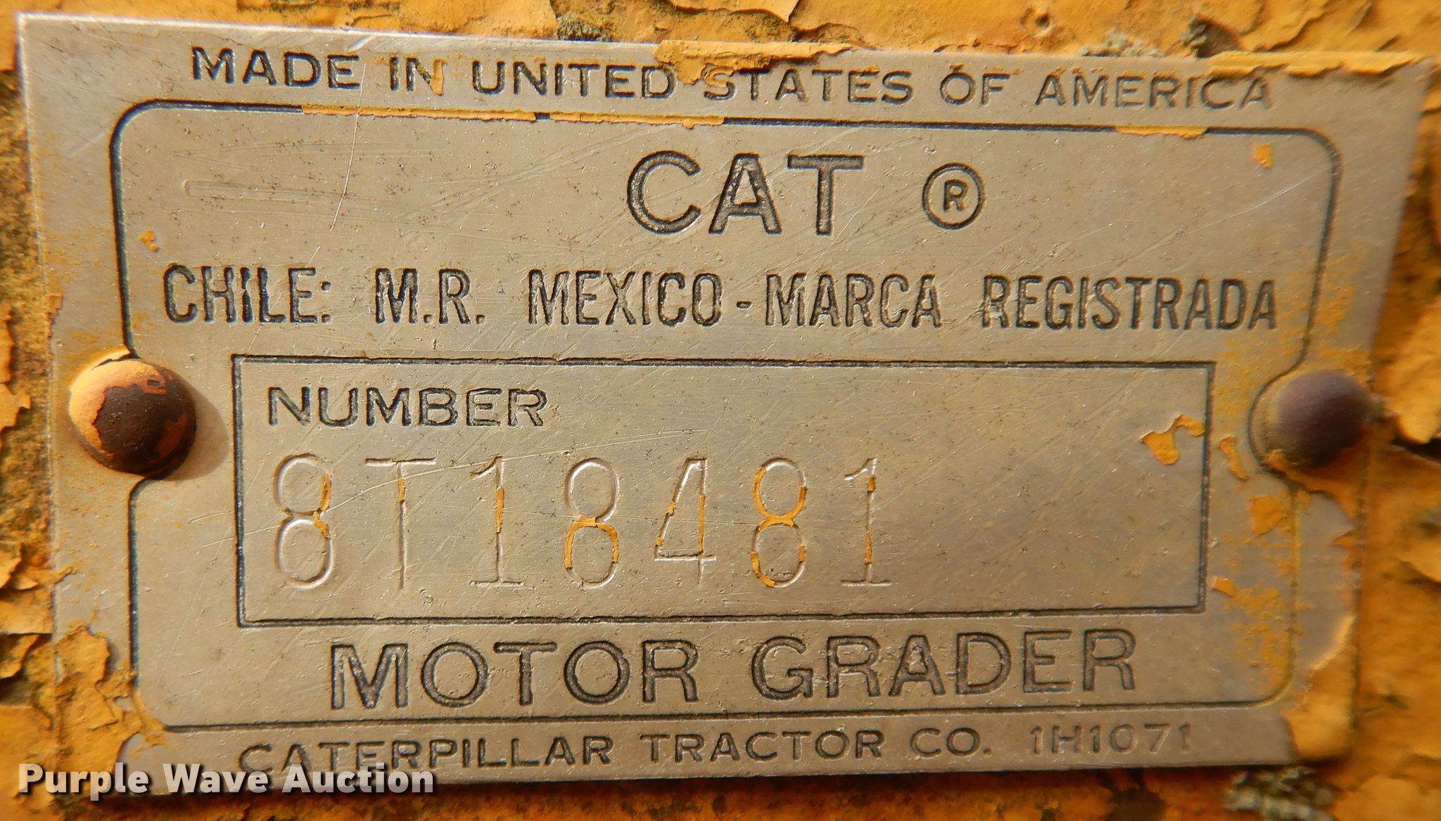 Purple Wave is selling a used Motor Grader in South Dakota. This item is a Caterpillar rigid frame motor grader with the following: Unknown hours on meter, Serial: 8T18481