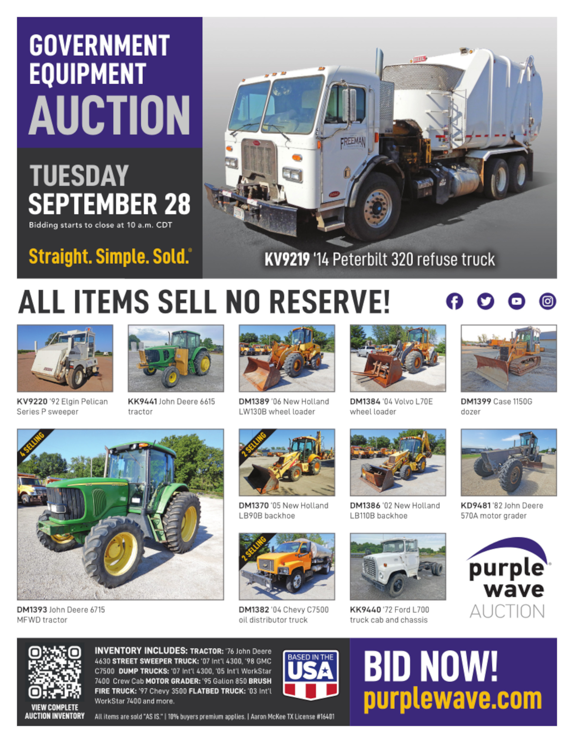 This auction is conducted by Purple Wave, Inc., whose home office is 825 Levee Drive, Manhattan, Kansas. Aaron McKee, Texas auctioneer license # 16401, operates Purple Wave, Inc. Complaints against us may be directed to the Texas Department of Licensing and Regulation, P.O. Box 12157, Austin, Texas 78711, (512) 463-6599. For additional required information, see the attached document.