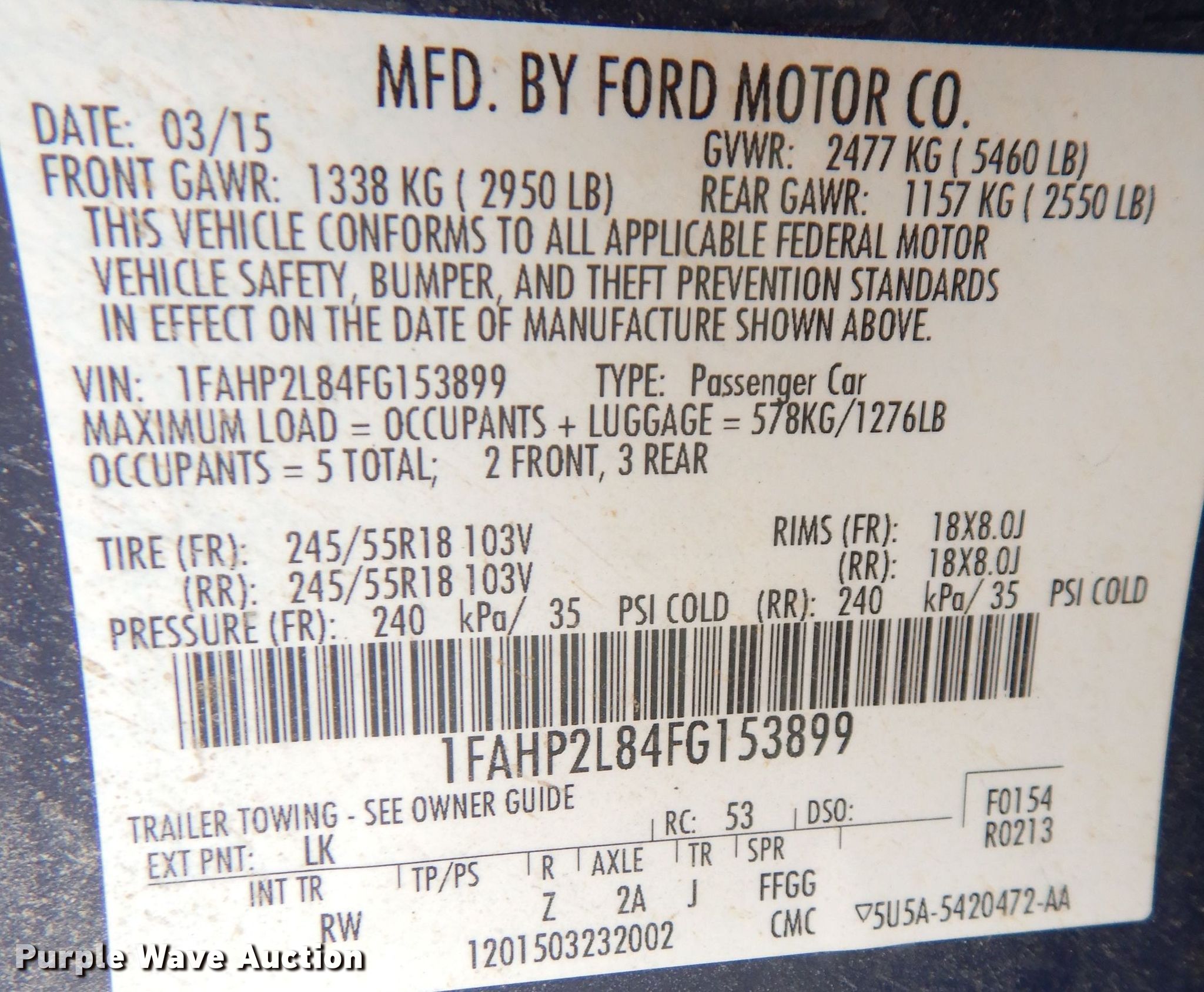2015 Ford Taurus Police Interceptor. 89,379 miles on odometer. Engine Displacement: 3.5L V6 DOHC 24V, Cylinders: 6, Fuel type: Gas. Transmission Automatic. Interior AC, Heat, Seat: Power driver, Heated mirrors, Power windows, Power locks, Cruise control. Tires Size: 245/55R18. Notes Weak battery, Decals will be removed prior to auction, Rear tire leaks, Dash warning indicator: TPMS. Kansas title. 1FAHP2L84FG153899. Pleasanton, KS 66075