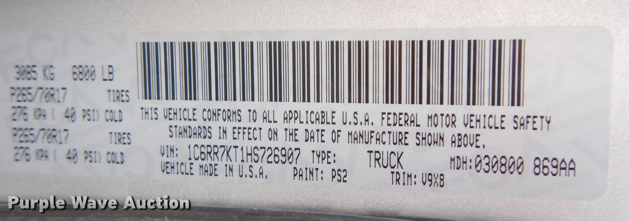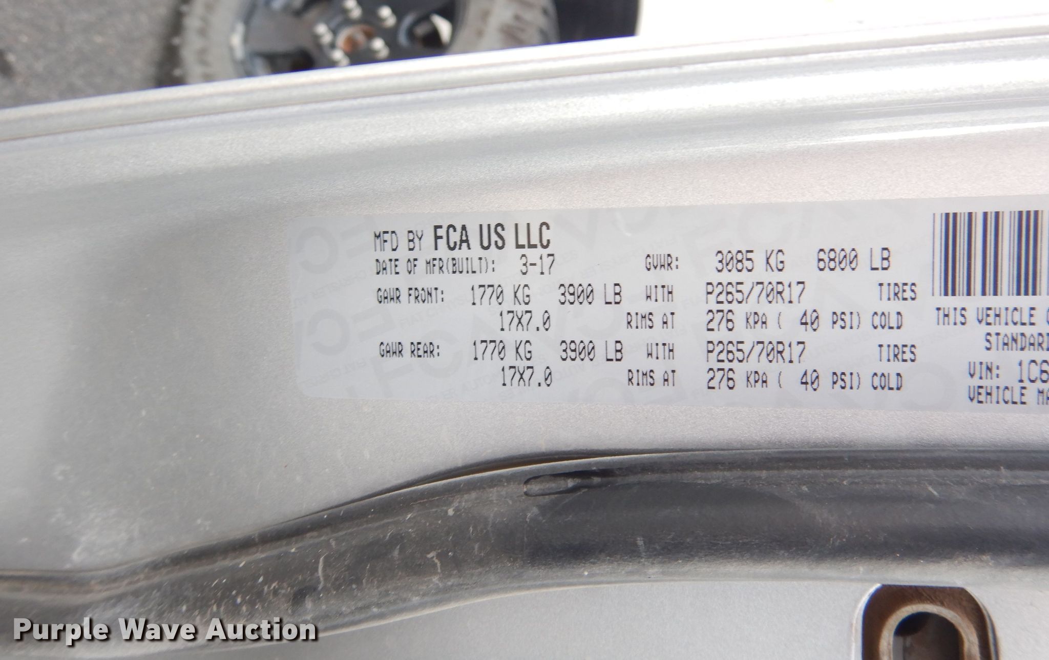 2017 Dodge Ram 1500 Crew Cab pickup truck. 106,383 miles on odometer. Engine Displacement: 5.7L V8 OHV 16V, Fuel type: Gas. Transmission Automatic, Four wheel drive. Interior AC, Heat, Heated mirrors, Power windows, Power locks, Cruise control. Tires Size: 265/70R17. Notes Dash warning indicator: Check engine, Non-operational right rear turn signal. Oklahoma title. 1C6RR7KT1HS726907. 825 Levee Dr. Manhattan, KS 66502