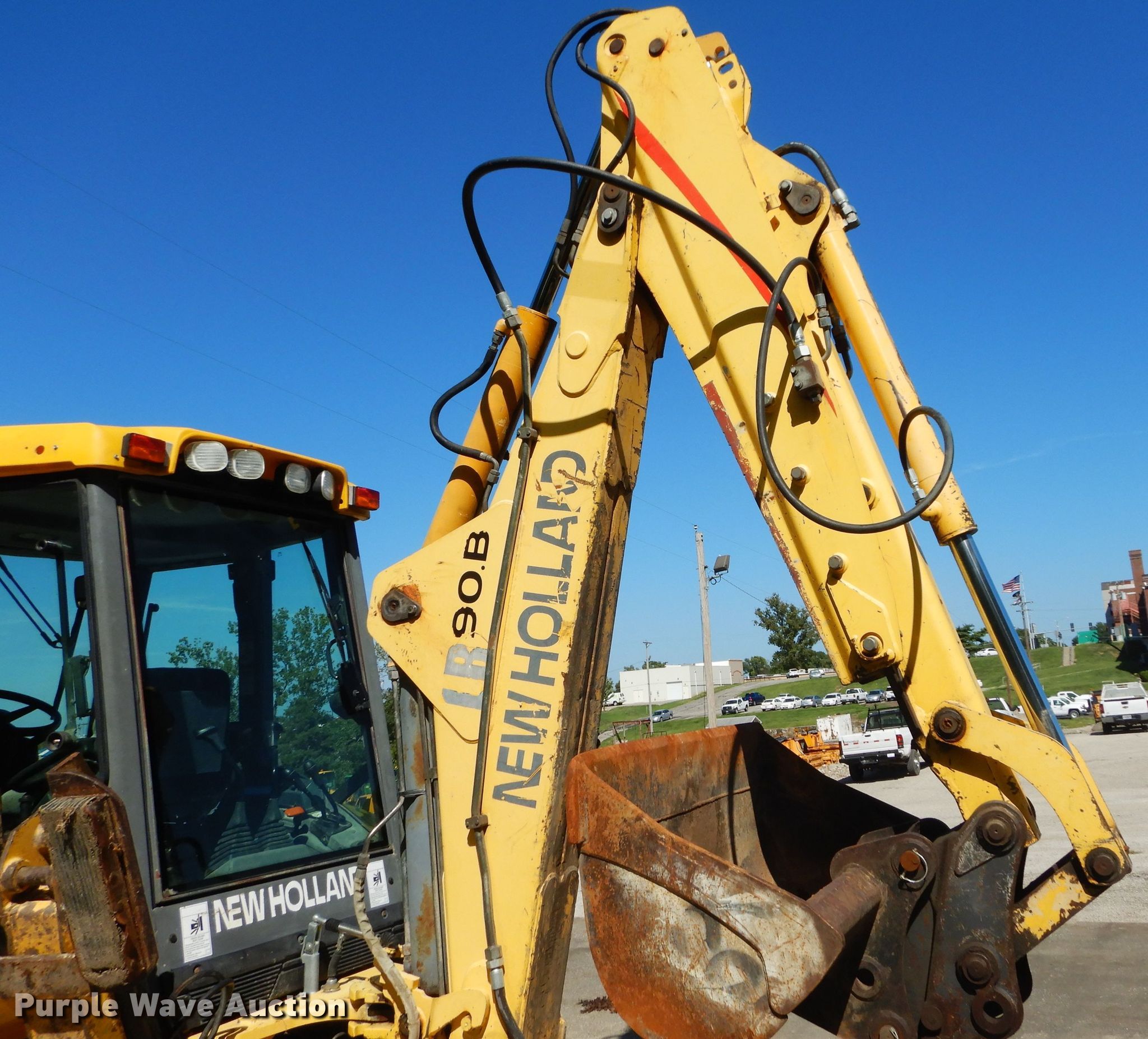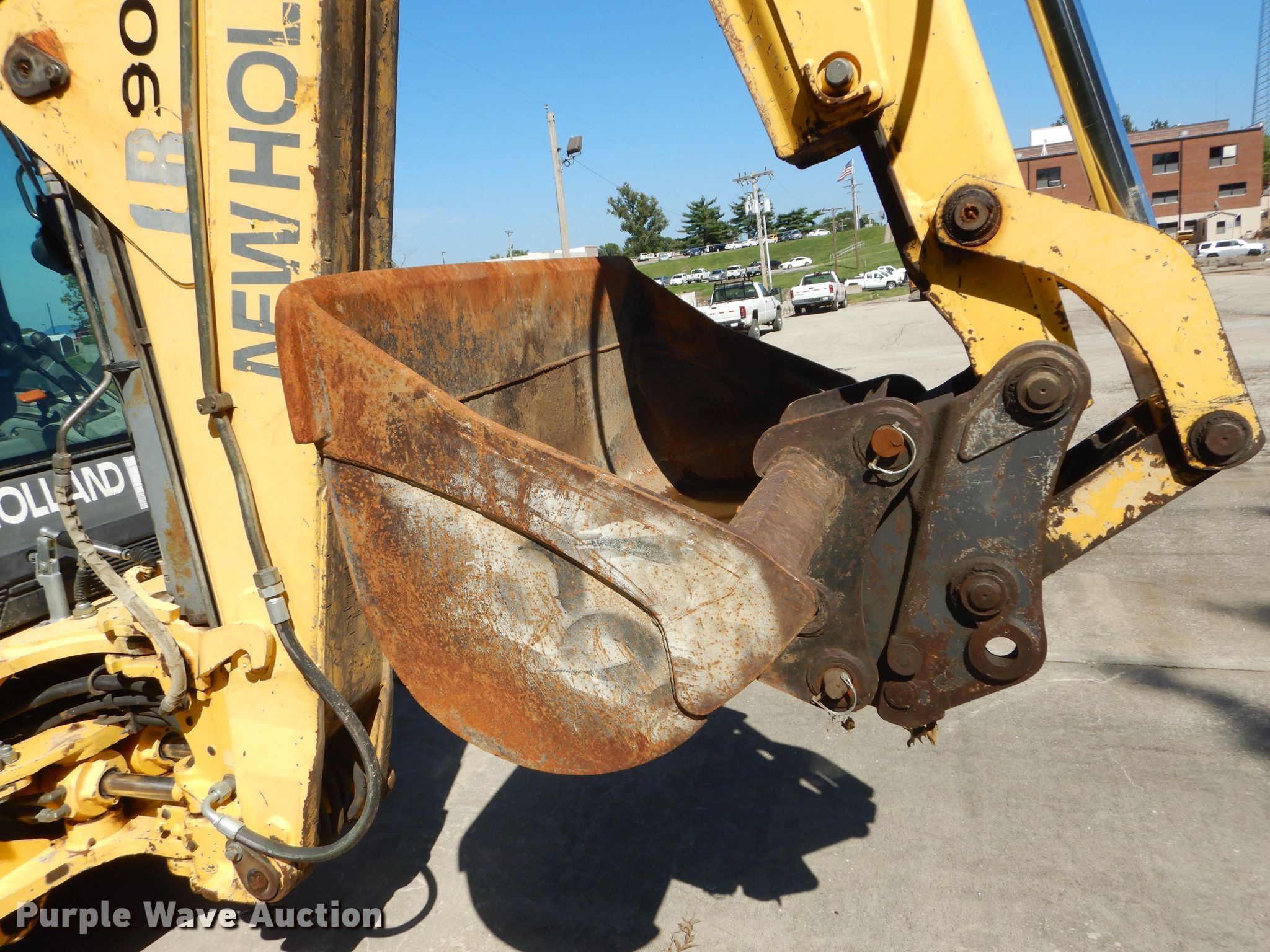 2005 New Holland LB90B backhoe. 4,264 hours on meter, Serial: 031053838, MODOT ID: 05976. Engine Cylinders: 4, Fuel type: Diesel. Transmission Shuttle shift, 4F - 4R. Chassis Four wheel drive. Operators station Enclosed cab, AC, Heat, Backhoe controls: Wobble stick / two stick. Operational Loader Quick coupler: Hydraulic, Auxiliary hydraulics, Bucket FFC, Bucket leveler, Capacity: 1.5 cu.yd., Width: 96", Cutting edge: Bolt-on, Backhoe Extendable stick, Quick coupler: Manual, Auxiliary hydraulics, Bucket Width: 48".. Tires Front: 14-17.5, Rear: 21L-24. Notes AC issues, does not blow cold, Auxiliary hydraulics hoses unhooked. Missouri Department of Transportation-Northwest District. 3602 N Belt Hwy. Saint Joseph, MO 64506