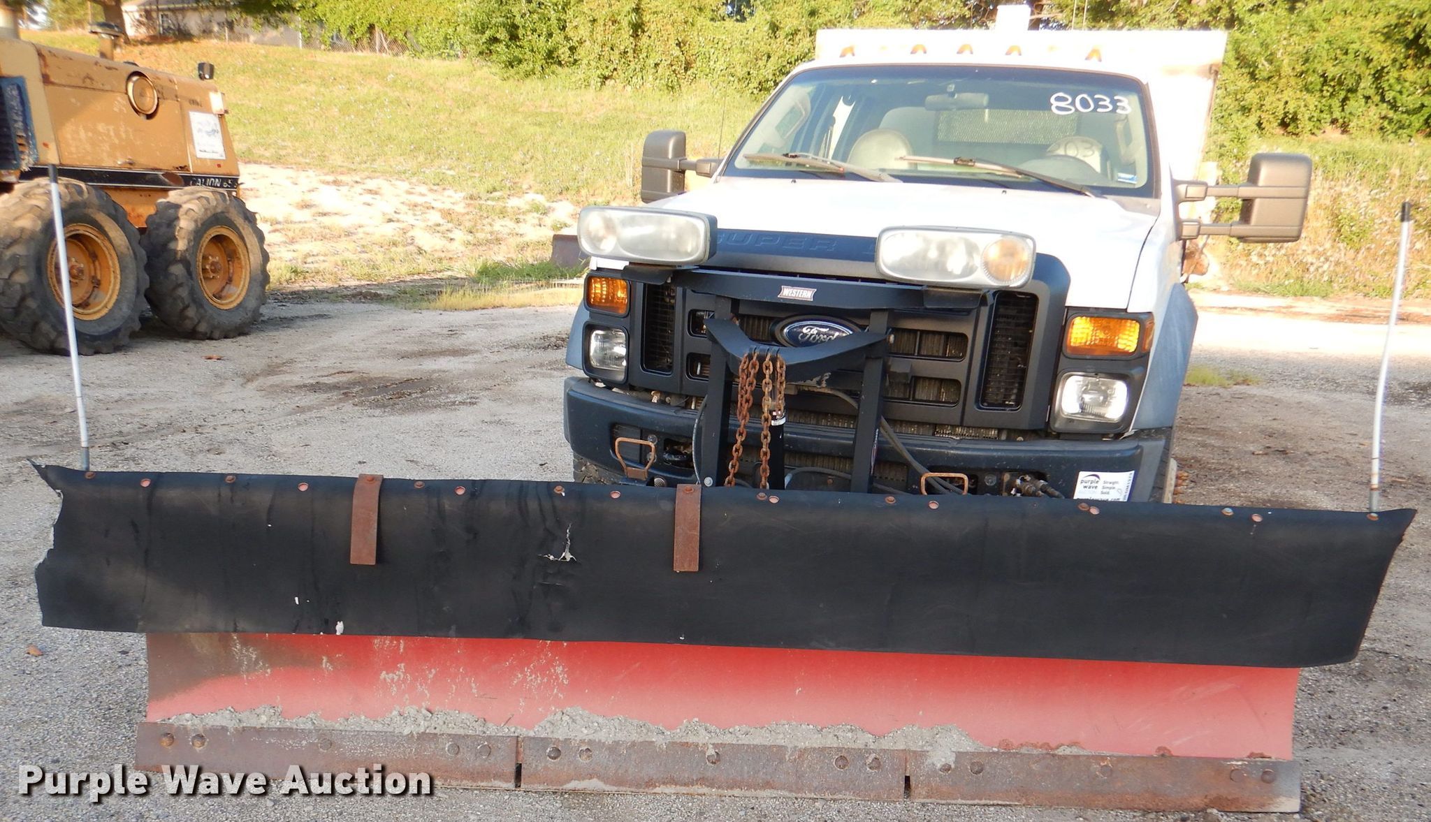 2008 Ford F550 Super Duty XL dump truck. 209,357 miles on odometer, MODOT ID: 8033. Engine Displacement: 6.4L OHV 32V, Cylinders: 8, Fuel type: Diesel. Transmission Automatic. Chassis Axles: Single, Suspension: Spring, Brakes: Hydraulic, GVWR: 17,950 lbs. Interior AC, Heat. Operational Dump bed 9' x 95" W, Side height: 14", Ram: Single , End gate: Manual, Plow Western Pro Plus. Tires Size: 225/70R19.5. Notes Dash warning indicator: Check engine, Hail damage, Possible engine issues, smokes, Blade tilt issues. Missouri title. 1FDAW56R98EB67649. Missouri Department of Transportation-Northwest District. 3602 N Belt Hwy. Saint Joseph, MO 64506