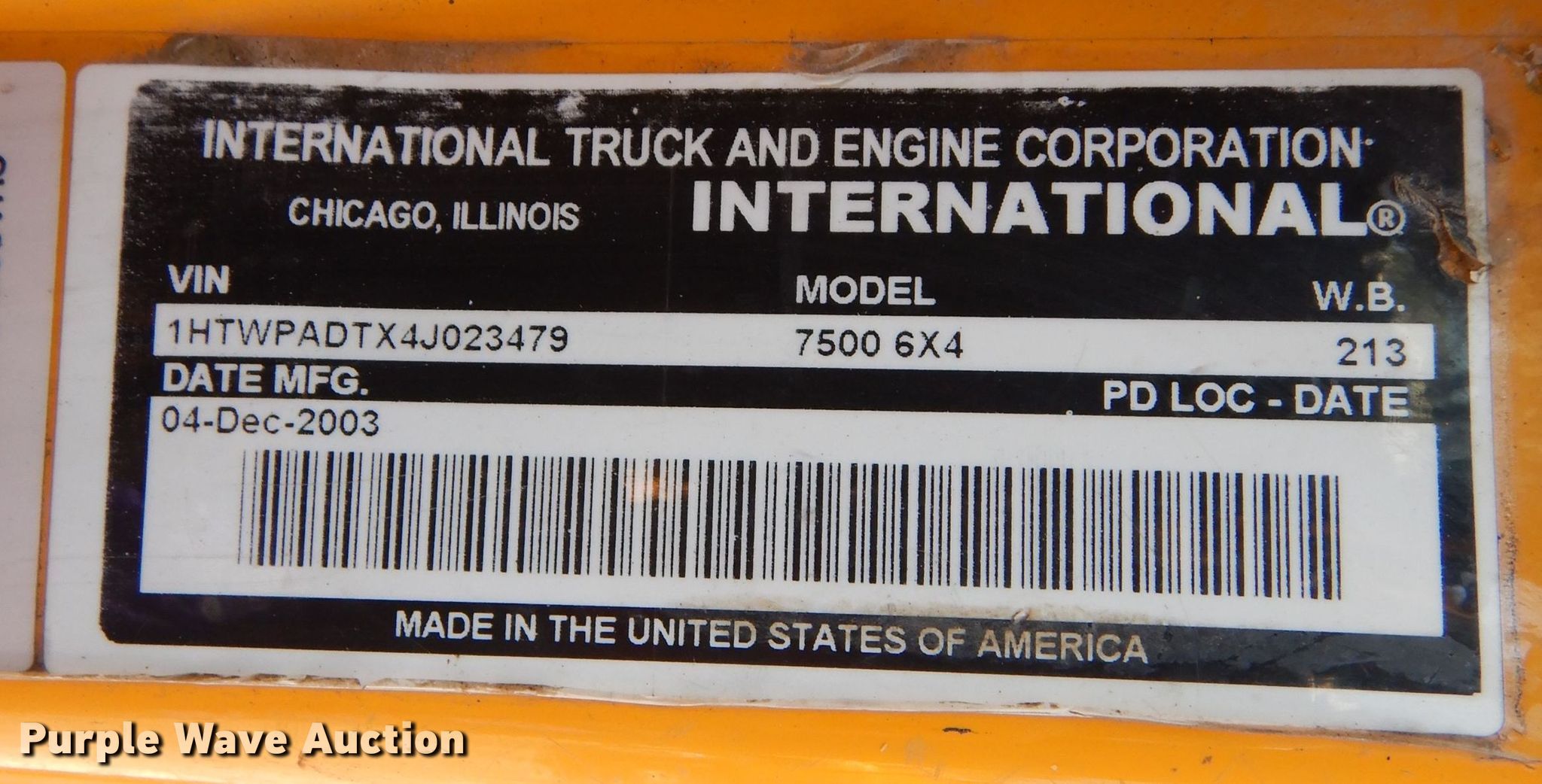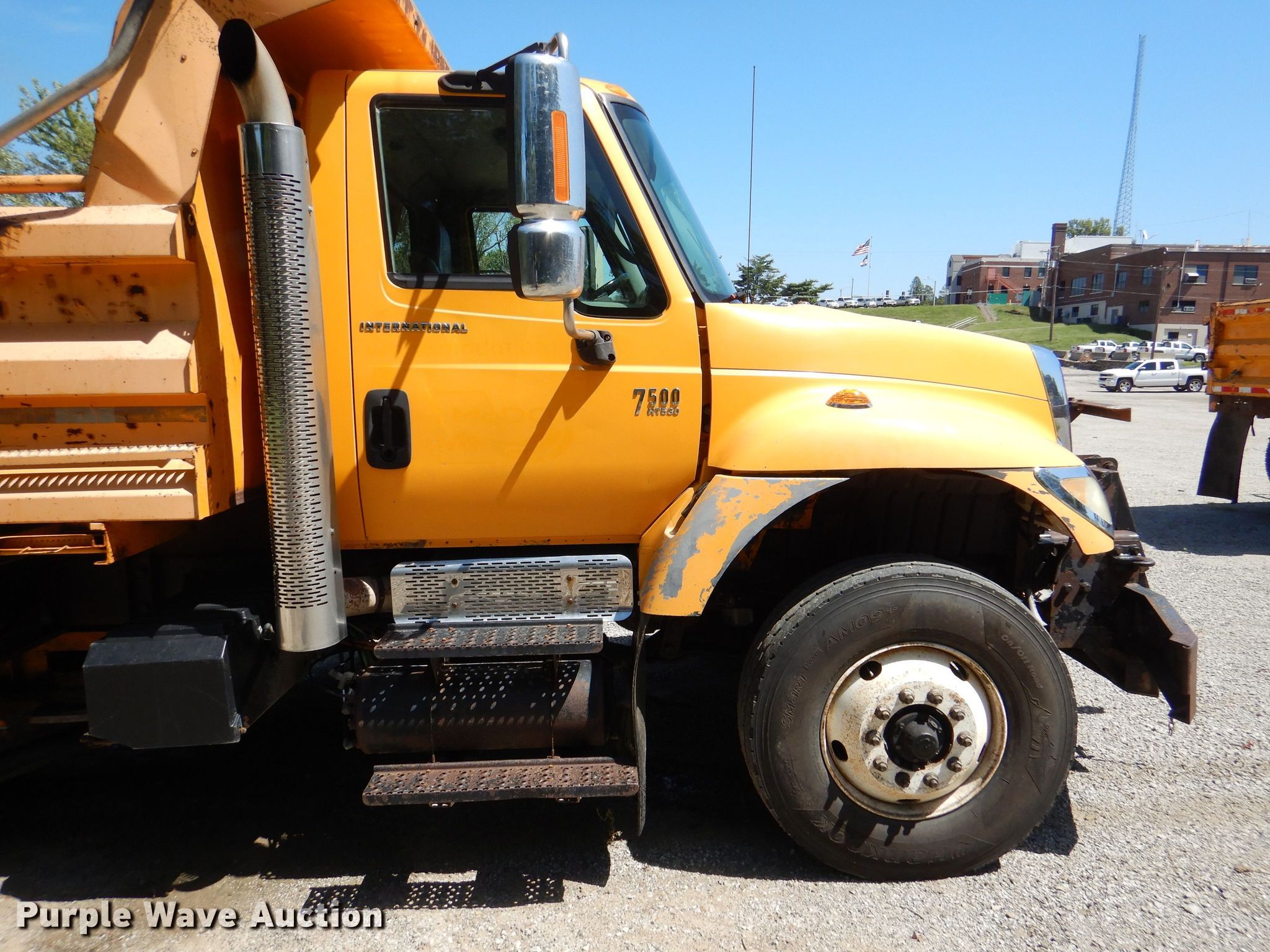 2004 International WorkStar 7500 dump truck. 254,107 miles on odometer, Engine hours: 13,267, MODOT ID: 7178. Engine International, Cylinders: 6, Fuel type: Diesel. Transmission Eaton Fuller 8LL, Manual, Speed: 10. Chassis Axles: Tandem, Suspension: Spring over walking beam, Brakes: Air, Front mount PTO. Interior AC, Heat, Power windows, Cruise control. Operational Dump bed Wheeler, 16' L x 8' W, Side height: 36", Bed type: Steel, Roll tarp, Ram: Single , End gate: Manual, Belly plow Width: 10', (2) Plows Width: 12'. Tires Front: 315/80R22.5, Rear: 11R22.5. Notes Dash warning indicator: ABS. Missouri title. 1HTWPADTX4J023479. Missouri Department of Transportation-Northwest District. 3602 N Belt Hwy. Saint Joseph, MO 64506